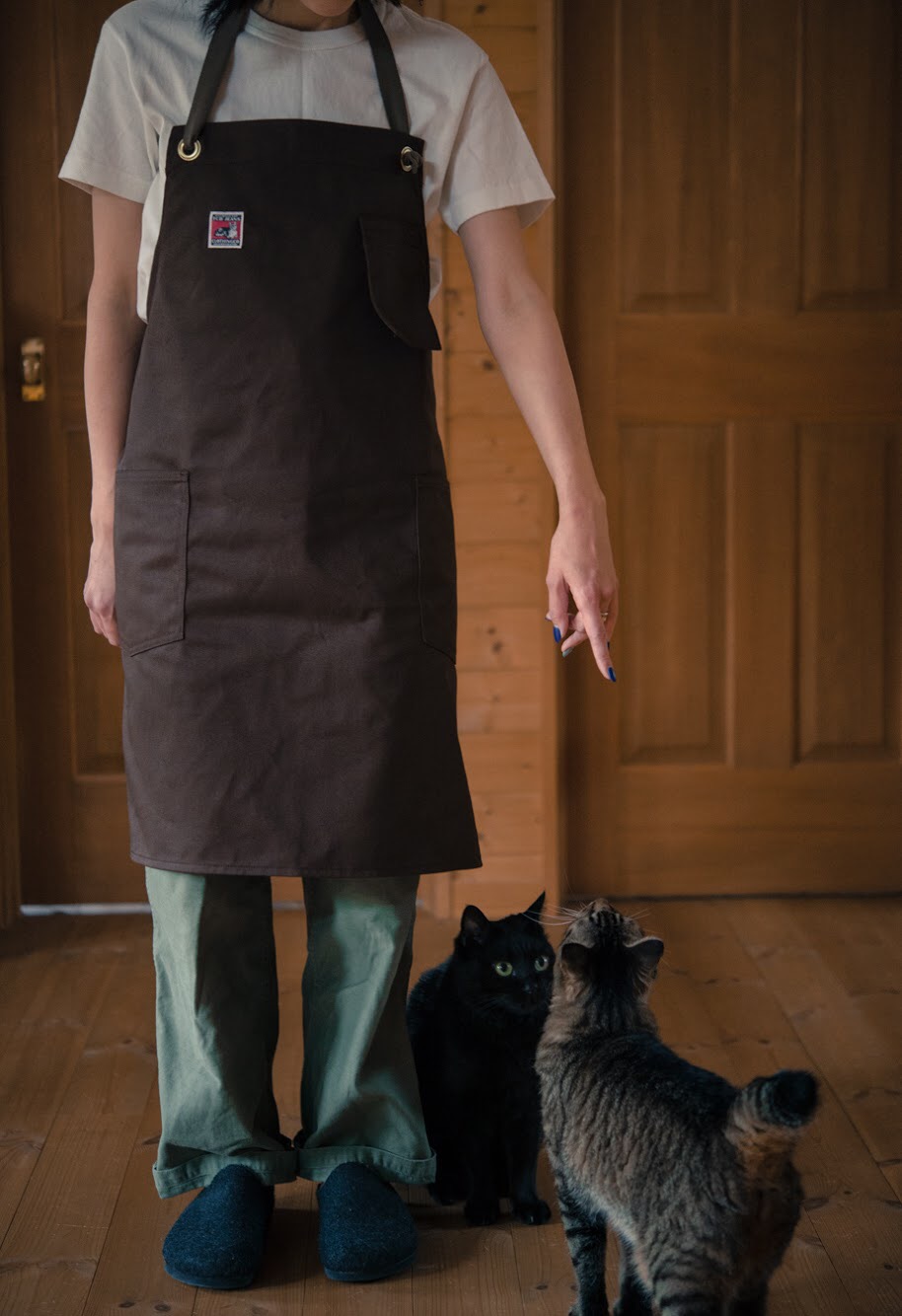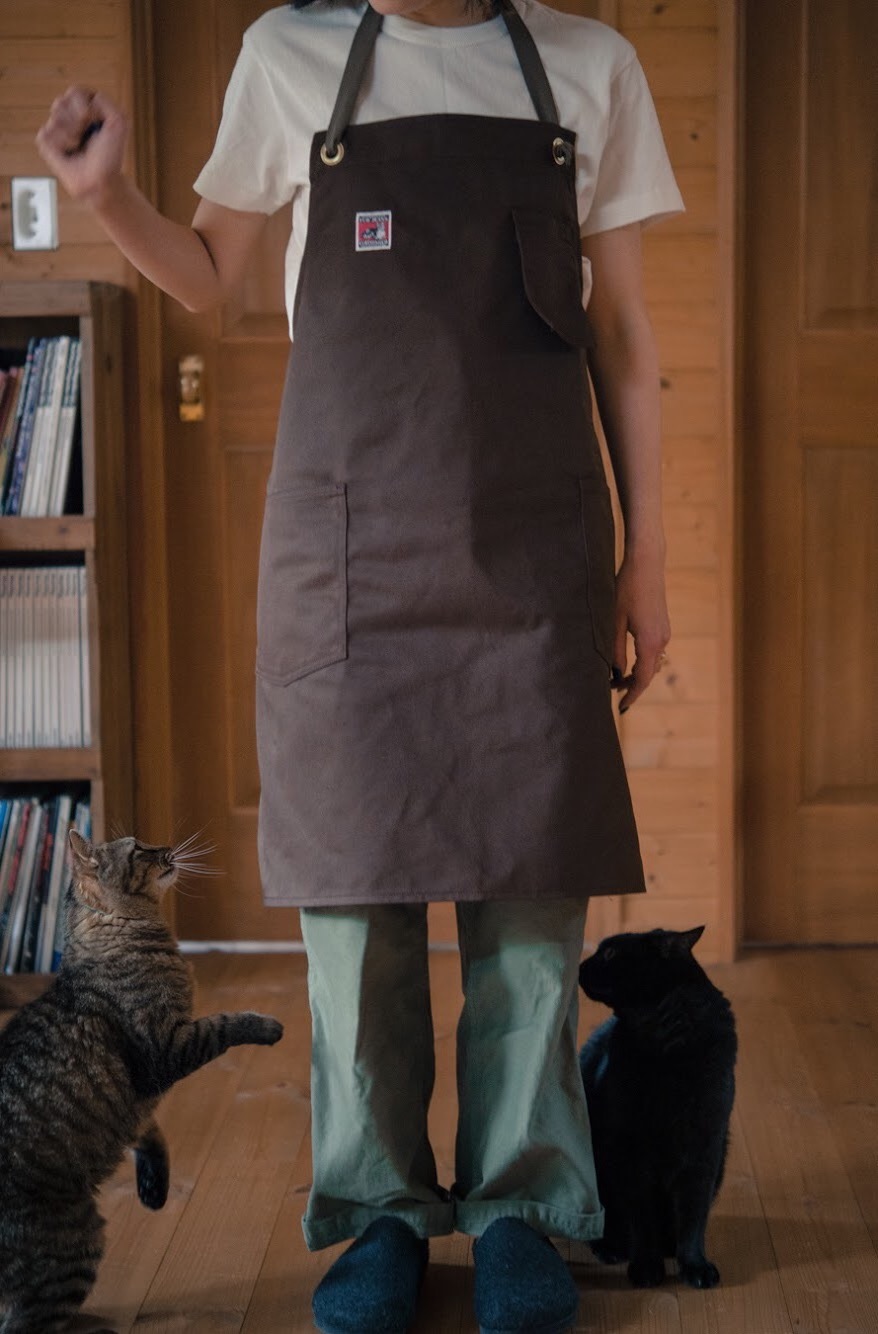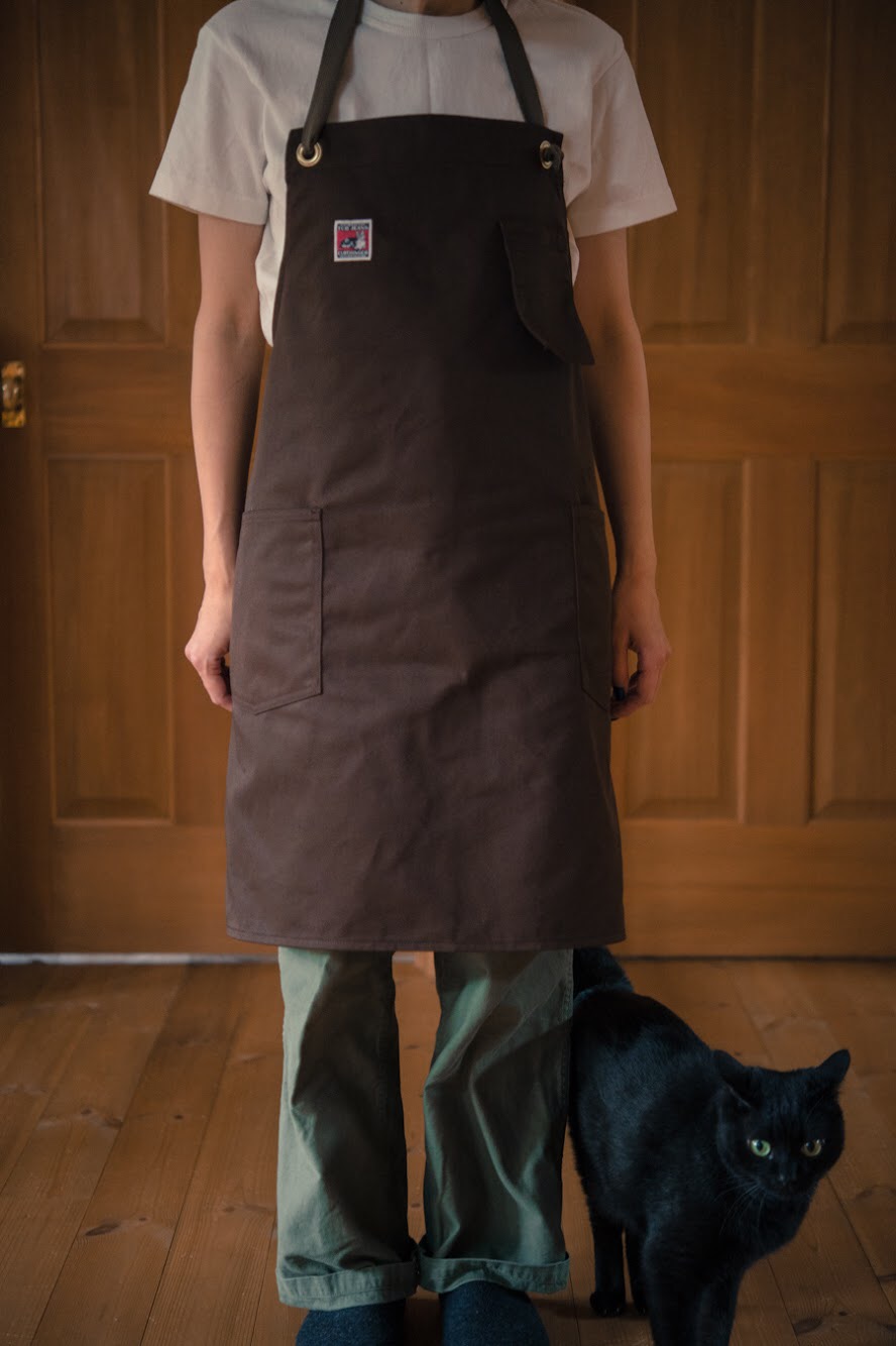 この度、新たにWORK APRONを制作しました。 生地は4種類でどれも魅力的です。 個人的には先染めのブラウンカラーデニムでカレーを作りたいと思います。 猫も大注目