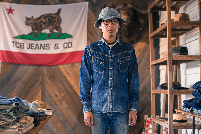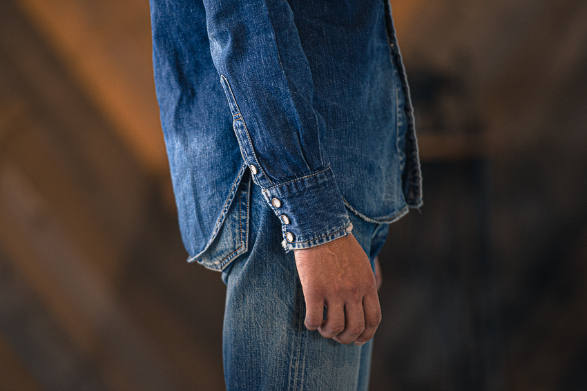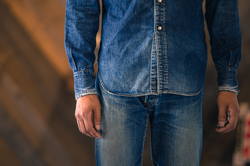 VINTAGEのシャツを見ていると、時々前立てのボタンを1個付け忘れたのかな?っていう間隔の物が有るけど、きっとパンツにタックインする事を大前提にしていたからなんでしょうね。 TCBのRANCHMANは、着丈はパンツから出して丁度良い位に設定して、ボタンの間隔はVINTAGE感が有る様にしてます。