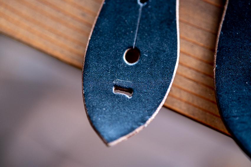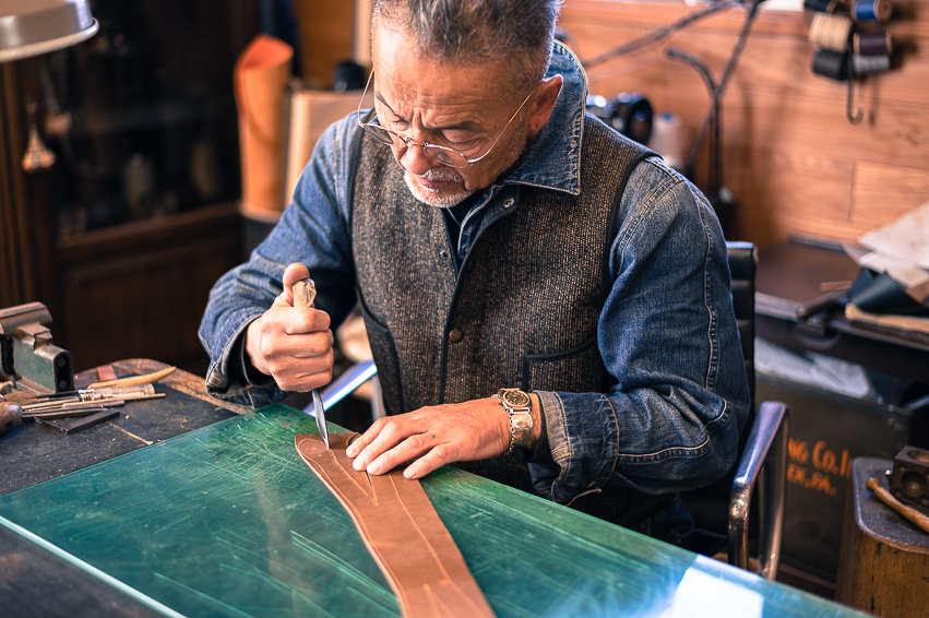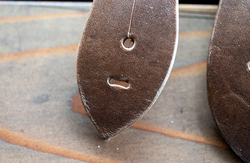 裁断時の取り都合はもちろん悪くなるのですが、縫い合わせ部分が無い分、使い込んだ時の肌馴染みが良い為、ゴムを使わない1枚革の仕様を可能にしています。