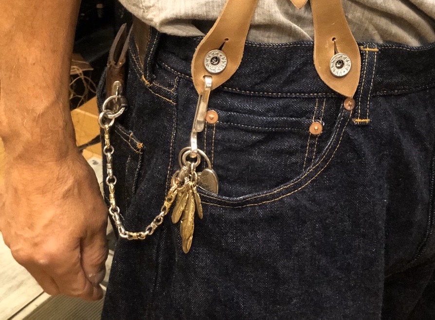 8-10枚目の写真を参考にして頂きたいのですが、ウォレットチェーンのフックを通す穴を設けており、ベルトループの無い時代のパンツを着用する場合や、チェーンの向きが収まり良く使って頂く事が可能です。