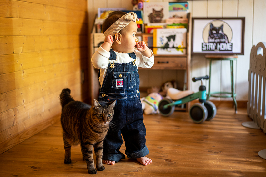 The picture of my daughter wearing Kids Wrecking Crew and the other cat, Tora the tabby.