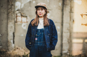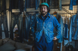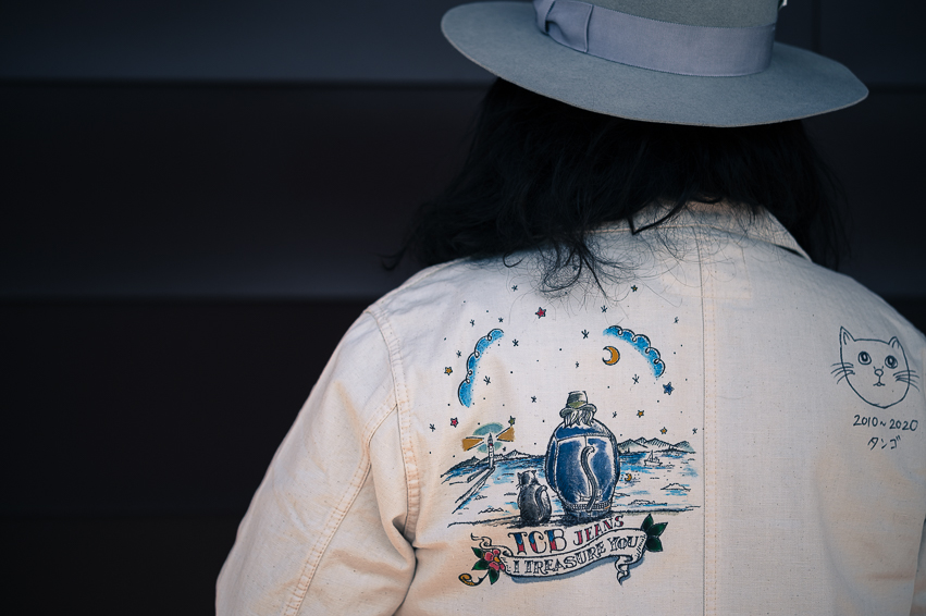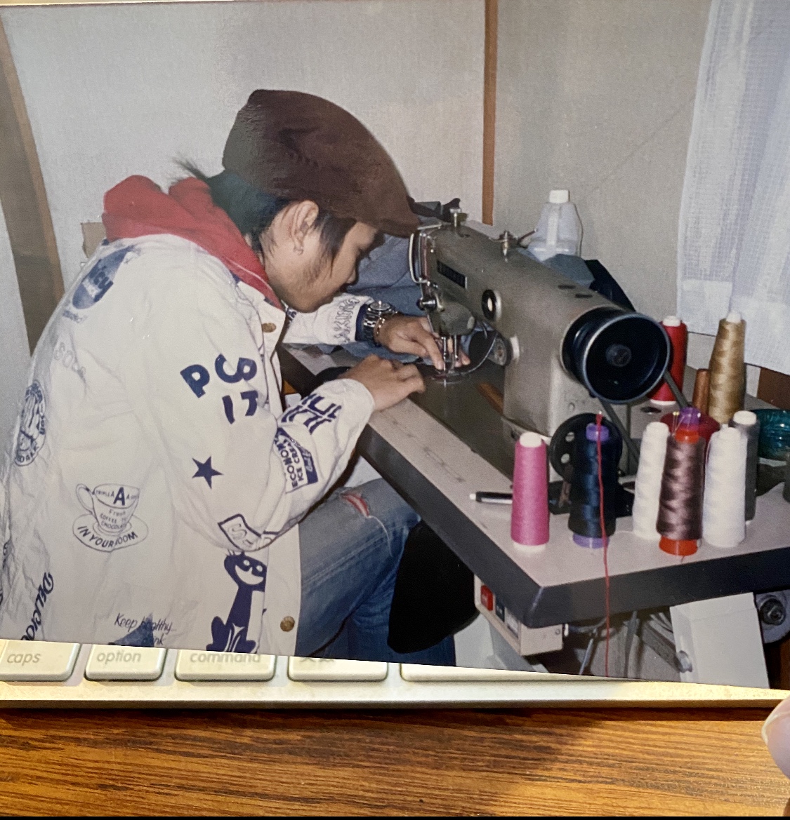 Double diamondのmemorial JKを着用してミシンを踏んでおります。