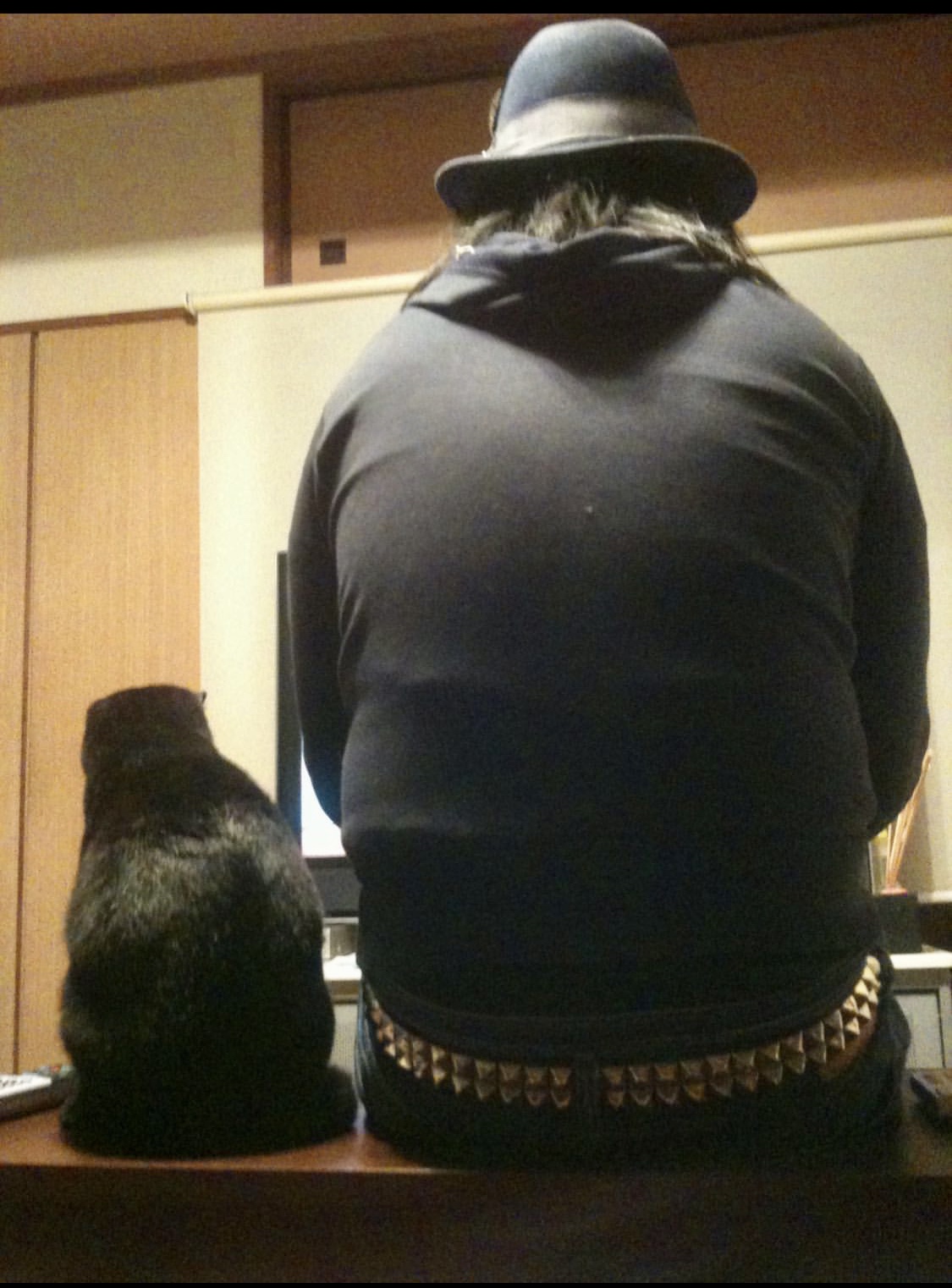 私が行儀悪く机に座ってテレビを観てたら、いつの間にか隣に座ってるタンゴくん。