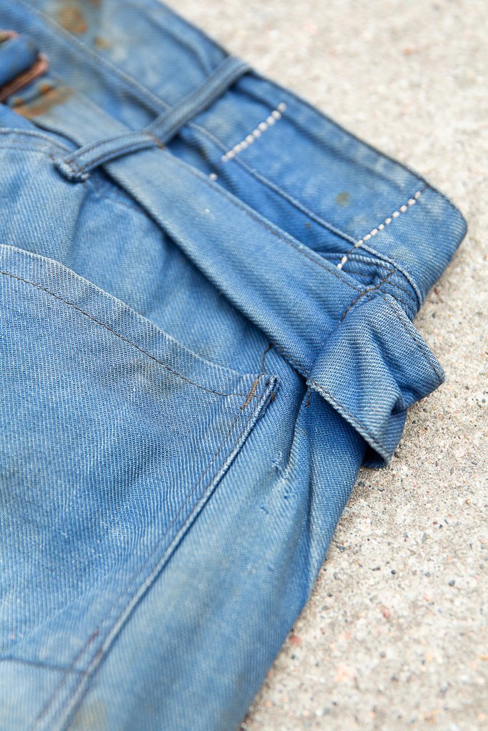 もしかすると、それは他のAlgots社のパンツから取られたパーツかもしれません。こう考えるのもあながち間違っていないかもしれません;このパンツを履いていた方は全く一緒のパンツを複数持っていて、ローテーションしながらその2本を互いにリペアしながら履いていたと。 こういったワークウェアでは、そのようなリペアが施された状態のビンテージ が多数見つかるという事実もあります。 通常、パンツの前側が先にヘタりますが、そのへたれたパンツ一本の後側を使い、もう一本のリペアを行うと2本のパンツがより長く使えます。私等のアーカイブに保管しているこの1960年のWrangler Jeansを見れば、こういったことが一般的に行われていたということも少し現実味が出てきます。