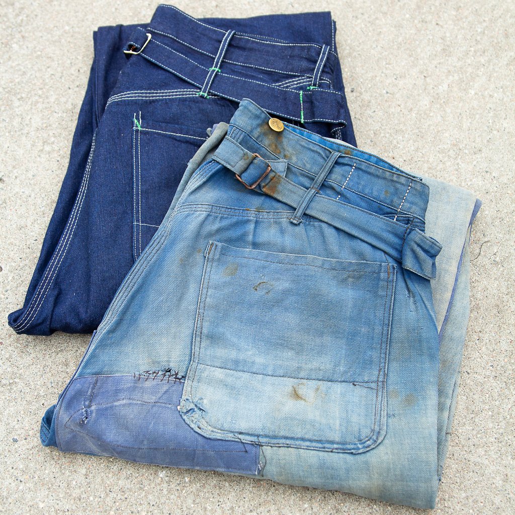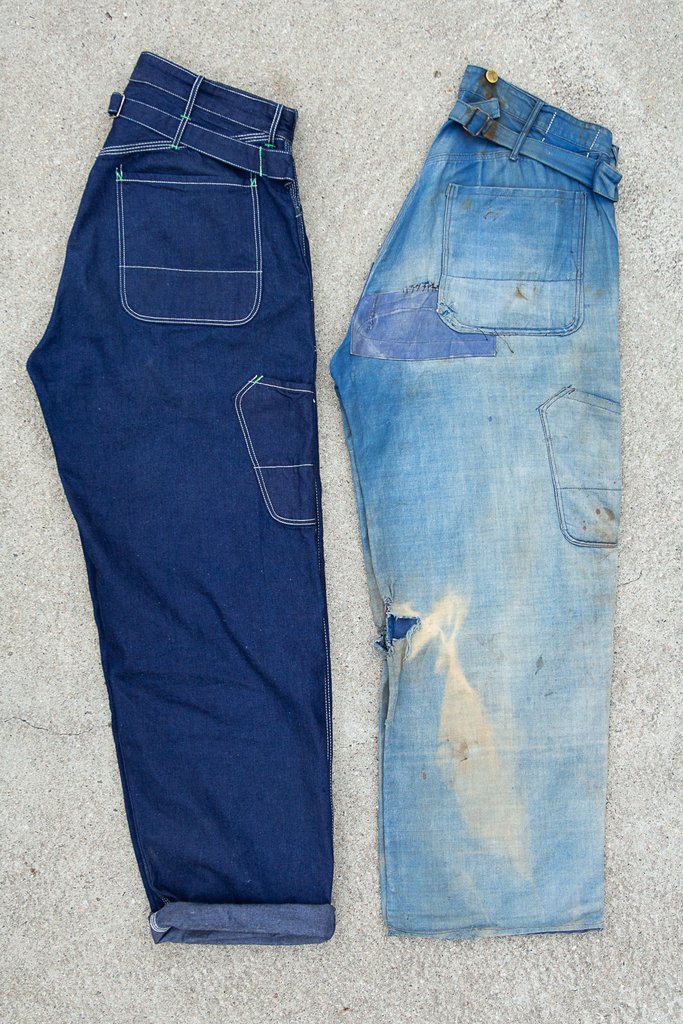 上の写真は、オリジナルと今回のコラボパンツを並べています。 ズドンと太いストーブパイプ型のシルエットに、非常に長い後股上は18,19世紀に見られた衣類の特徴です。この太いシルエットは動きやすさを衣類に与えるので、ワークウェアとしての本質が見られる形です。
