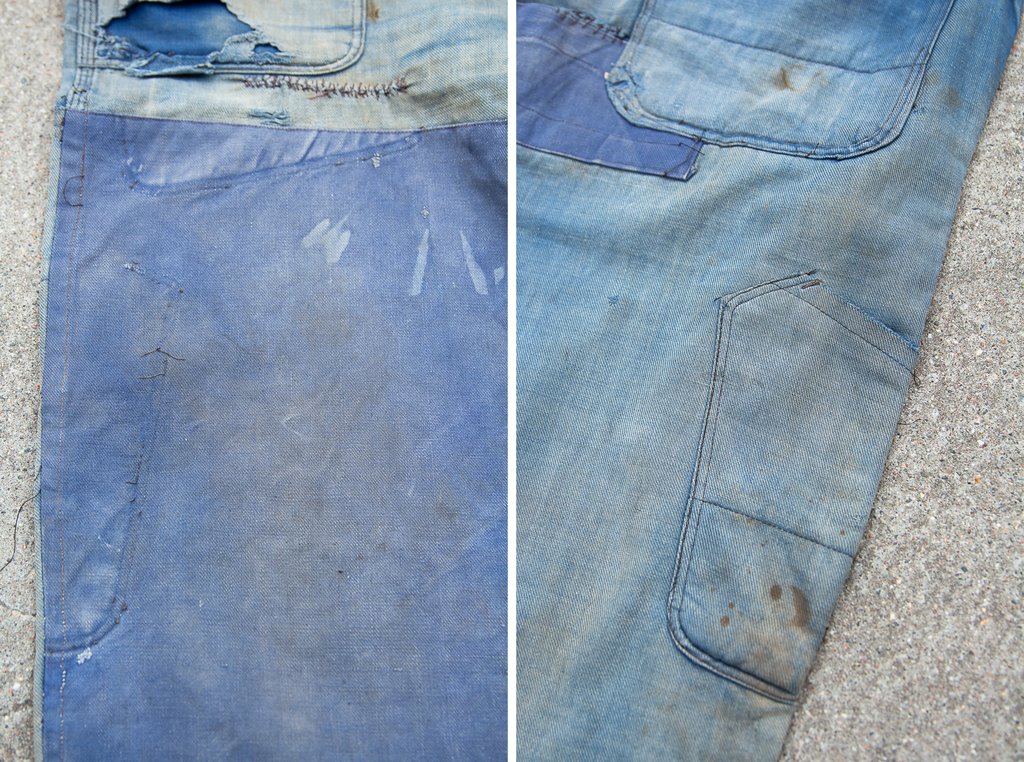 腿部補強のために使われたパッチ布の一つには、ポケットのステッチ痕が残っている=他のパンツで使われていた布が使われていました。