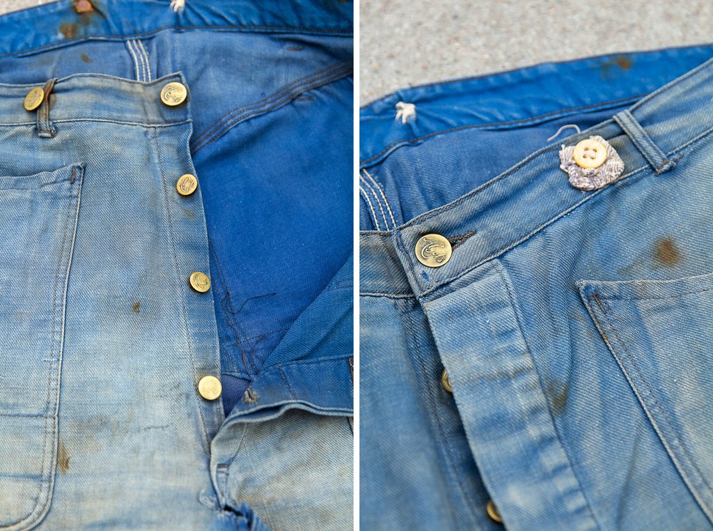 Since no Algots buttons could be found for the reproduction the TCB pants have plain donut buttons in the fly and a laurel leaf button in the waistband. To us this is a reasonable substitute, as these buttons are also commonly seen on workwear from the era.