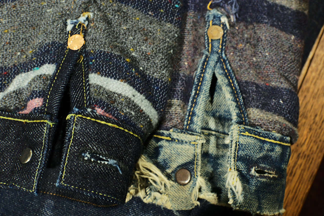 比較写真は違って見えますが、新品を着込んだ時、色が合ってくるよう計算して作ってます。