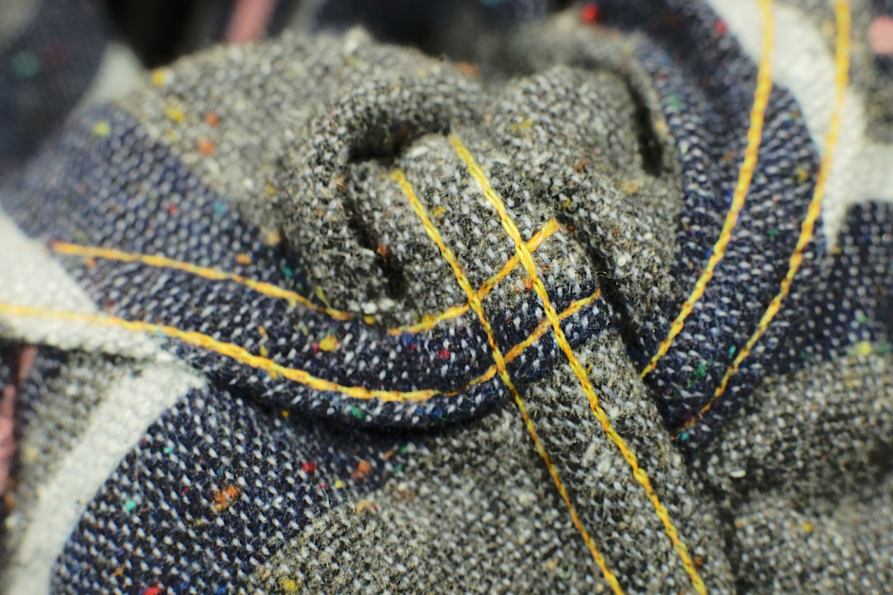 For the lap seams, we use our vintage Union Special with the sewing width of 9/32 inch. Speaking of the process of doing the lap seam, we do it separately for the denim and the wool fabric first and then sew them together on the armpits. If you look at the around-shoulder lap seams on the inner side of the vintage, they are sewn staggered to avoid that the fabrics overlap a lot and get too thick to be sewn. So, we have sewn them in the exact same way as the vintage piece.