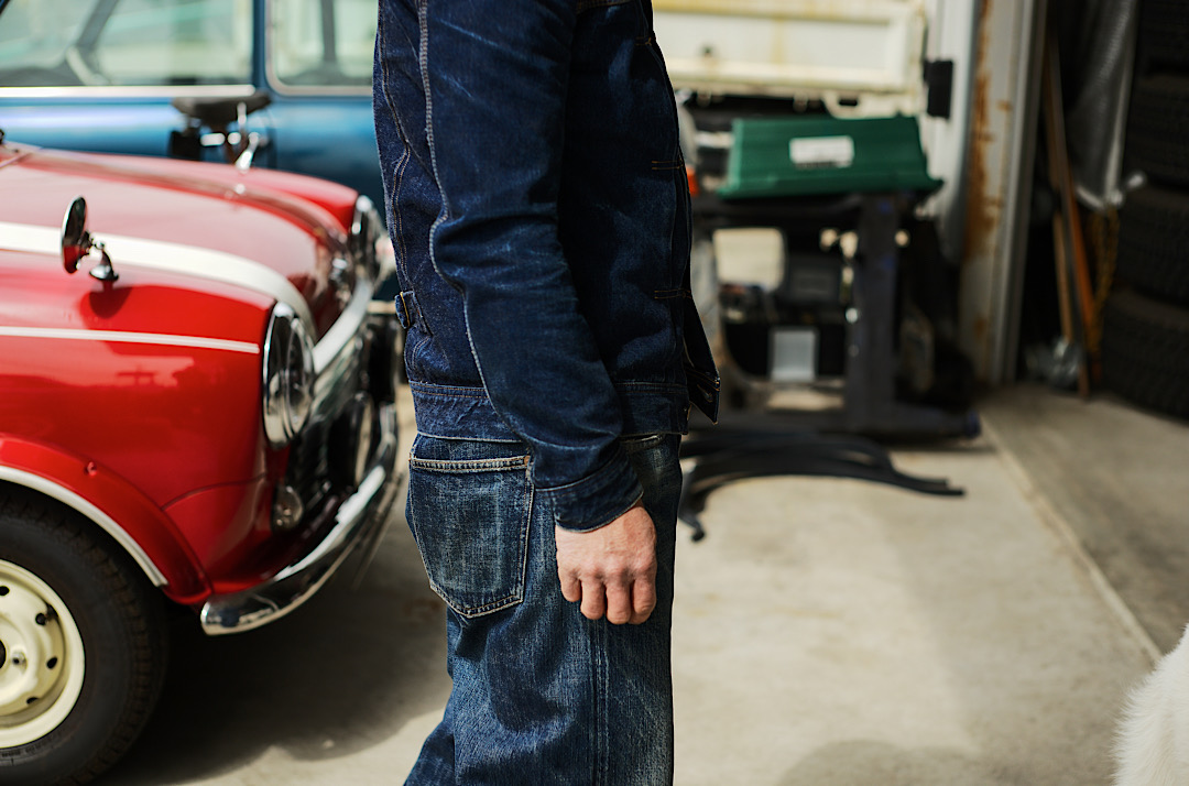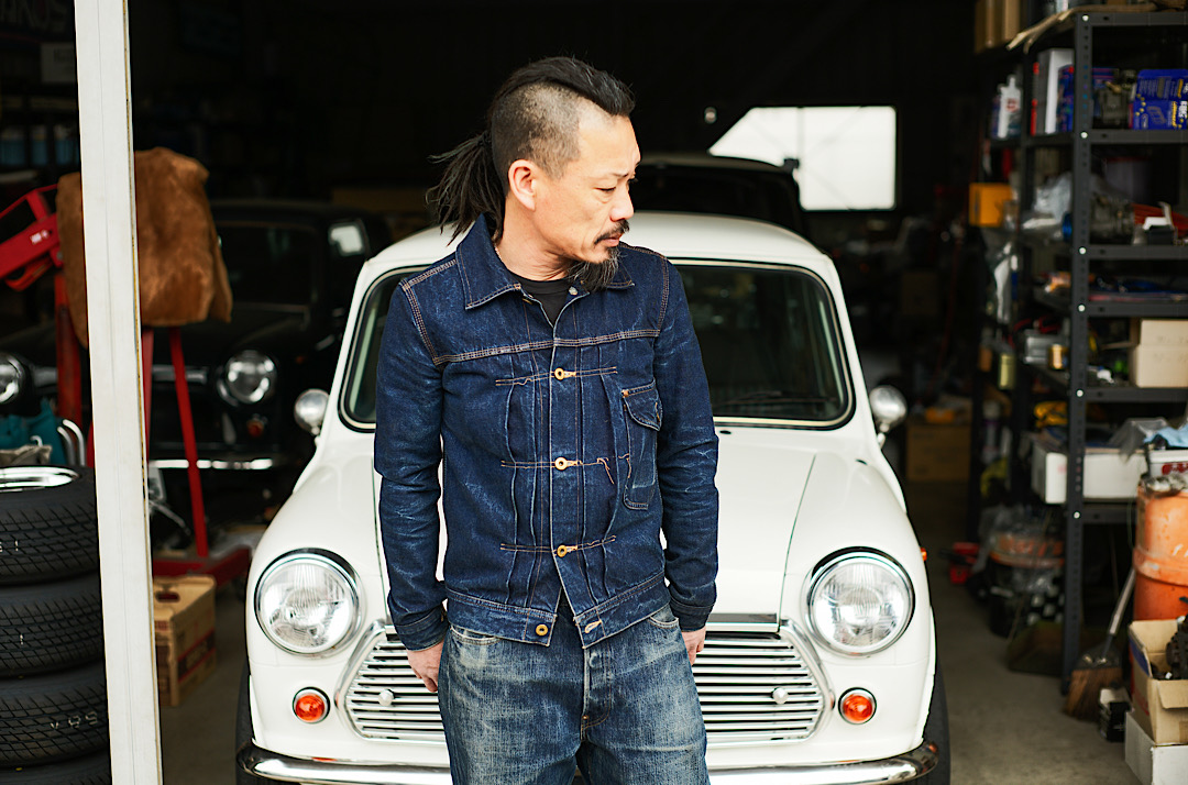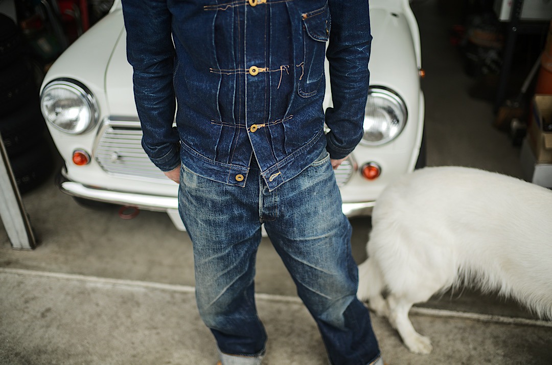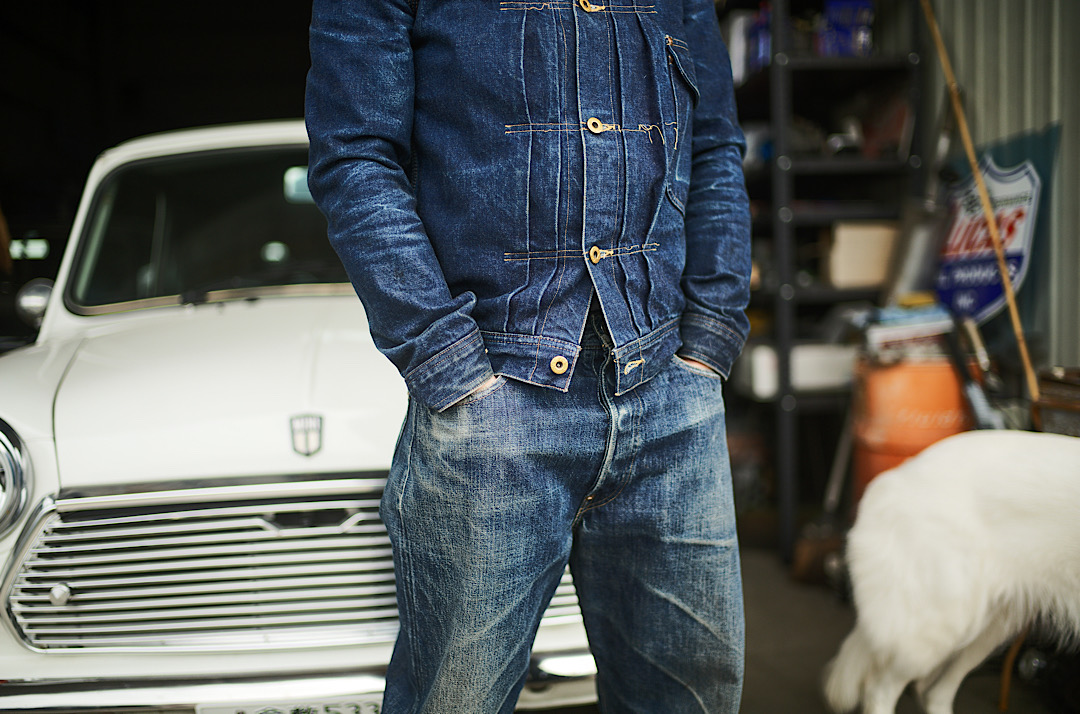 Kiriyama-san wears our Cat Boy Jacket & 20’s Jeans tux. We tend to recommend the tux made of the same fabric but there’s no rule about how you style! Different denim tux is of course cool!