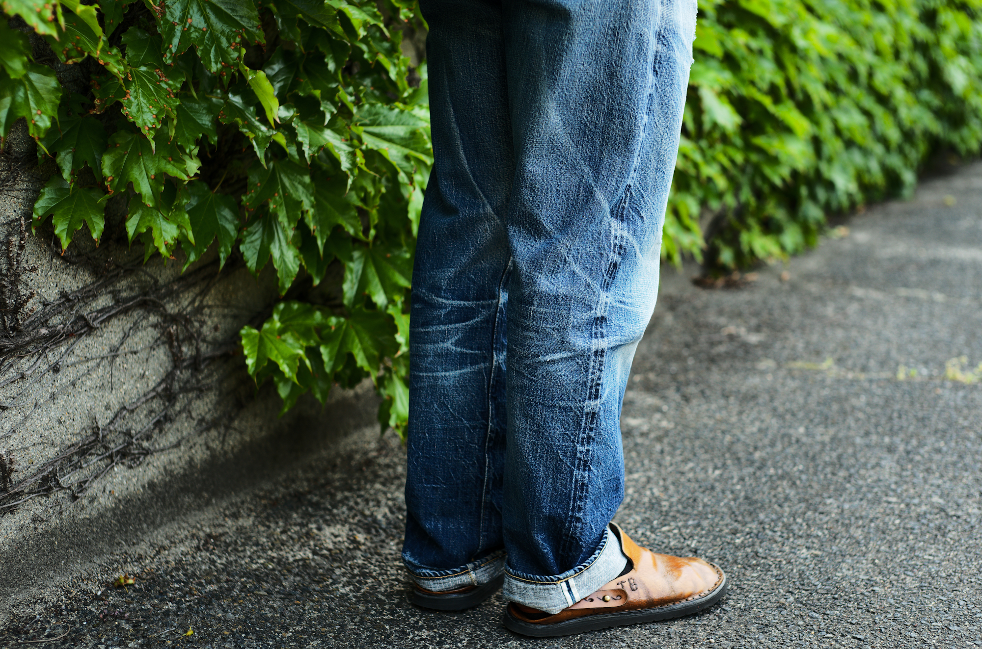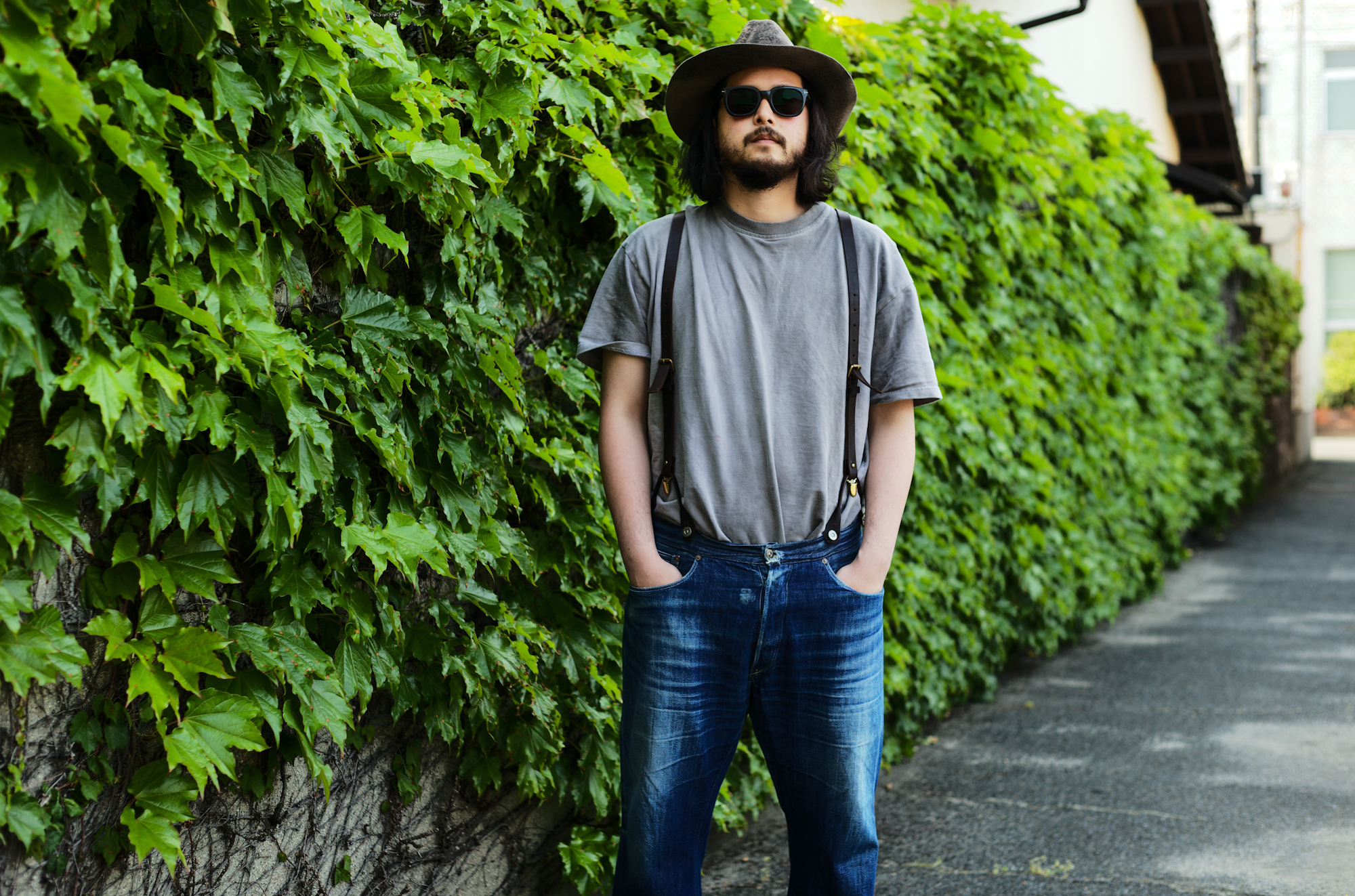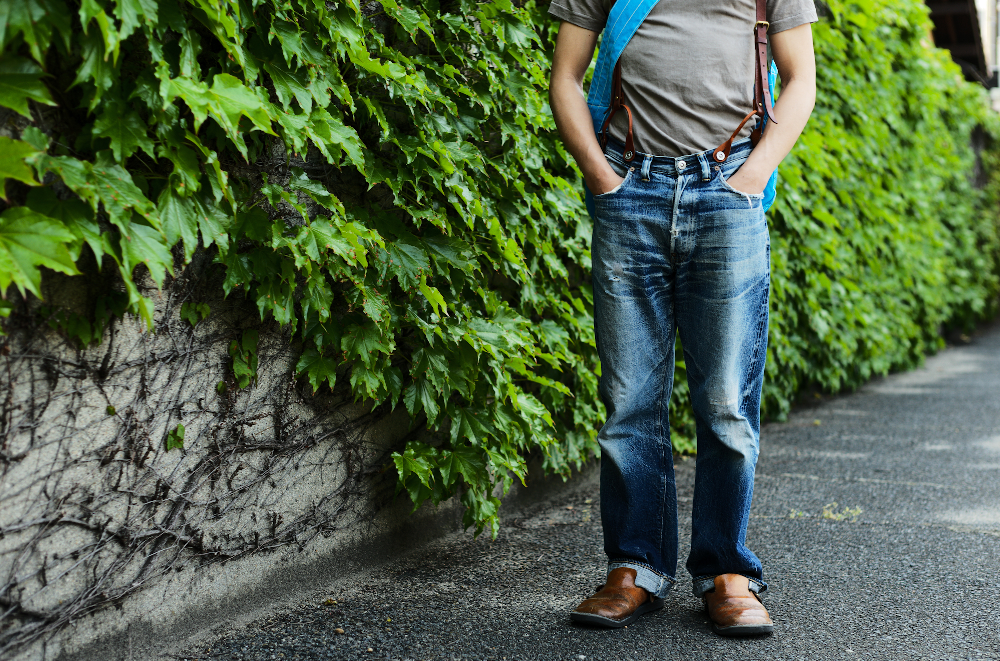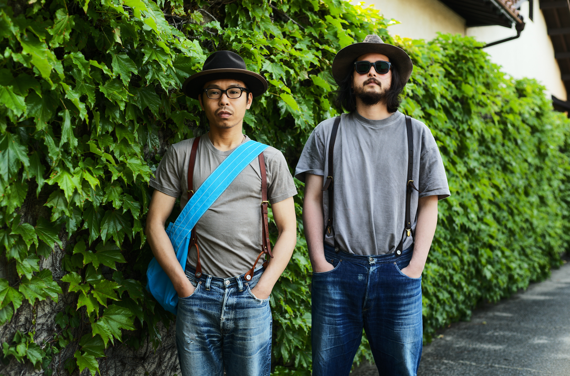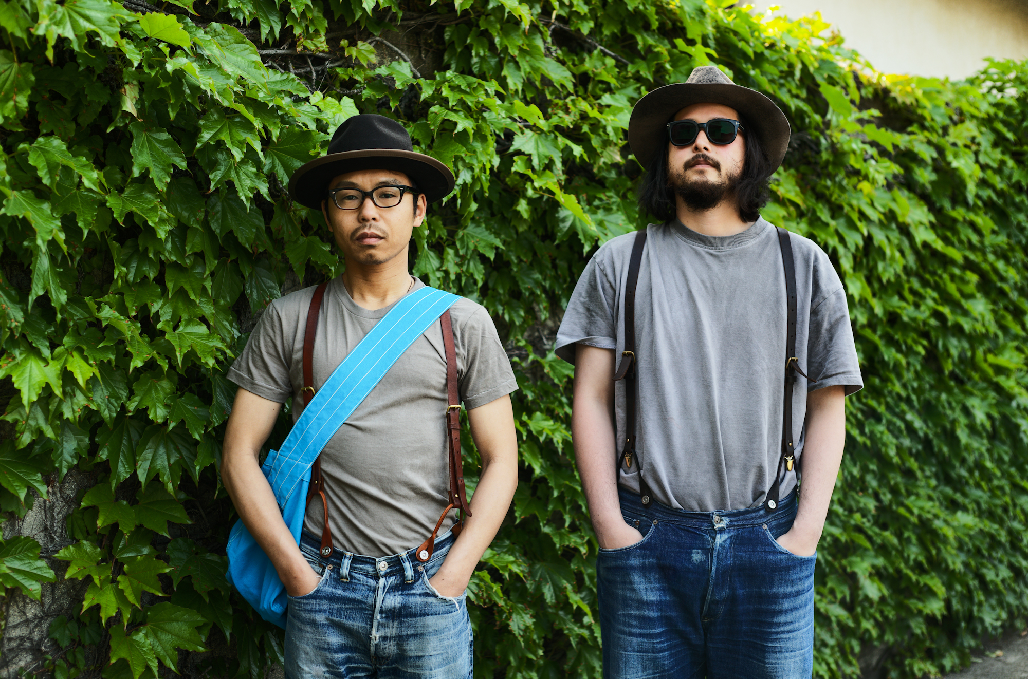 I feel that Spring has just arrived and it made me feel like taking some pics of jeans with suspenders. I told Ryo and Shiba to style jeans with suspenders and coincidentally they appeard with very similar outfits! Our 20’s Jeans and Waist Overall are equipped with suspender buttons but if you would like us to attach the buttons on any jeans model, we can do it for free of charge.