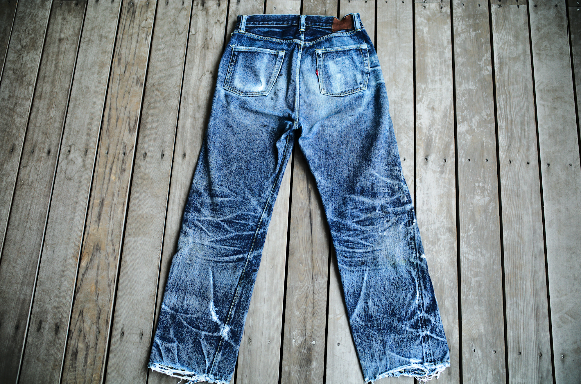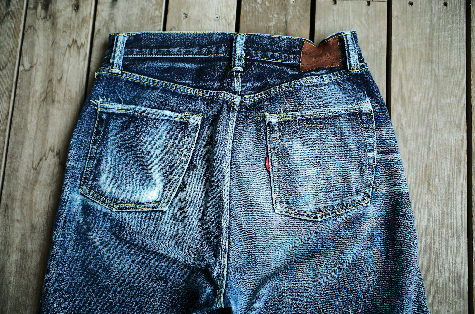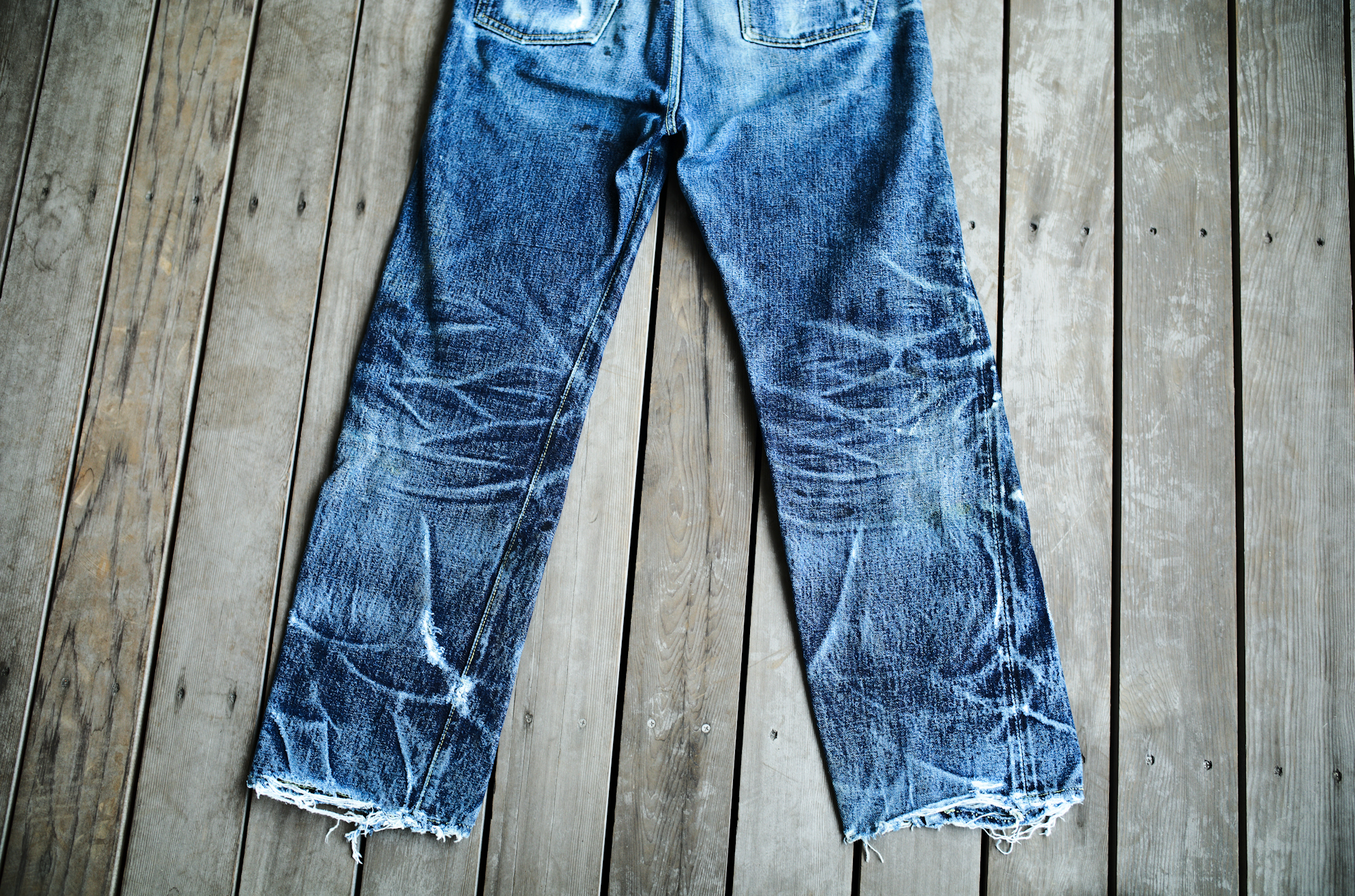 It depends on you guys whether you find them beautiful or dirty but on the contrary to the pictures of 60’s yesterday, the indigo color of our S40’s is extra deep and thanks to the hard-spun threads, deep creases can be easily settled. I find these beautiful because the fades reflect his job or his life style well.