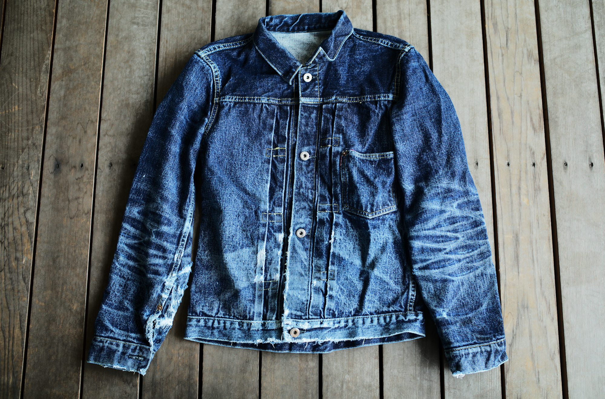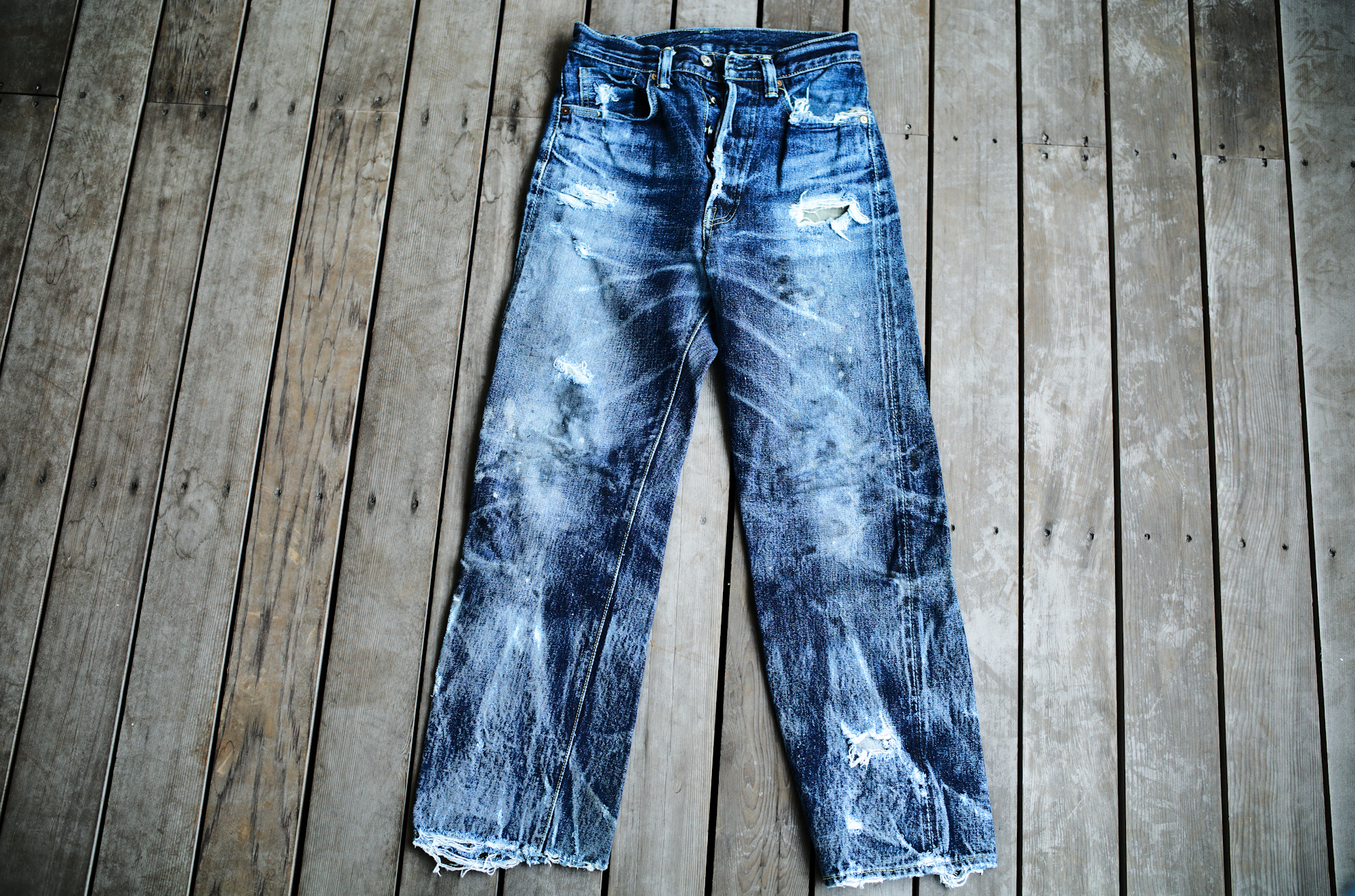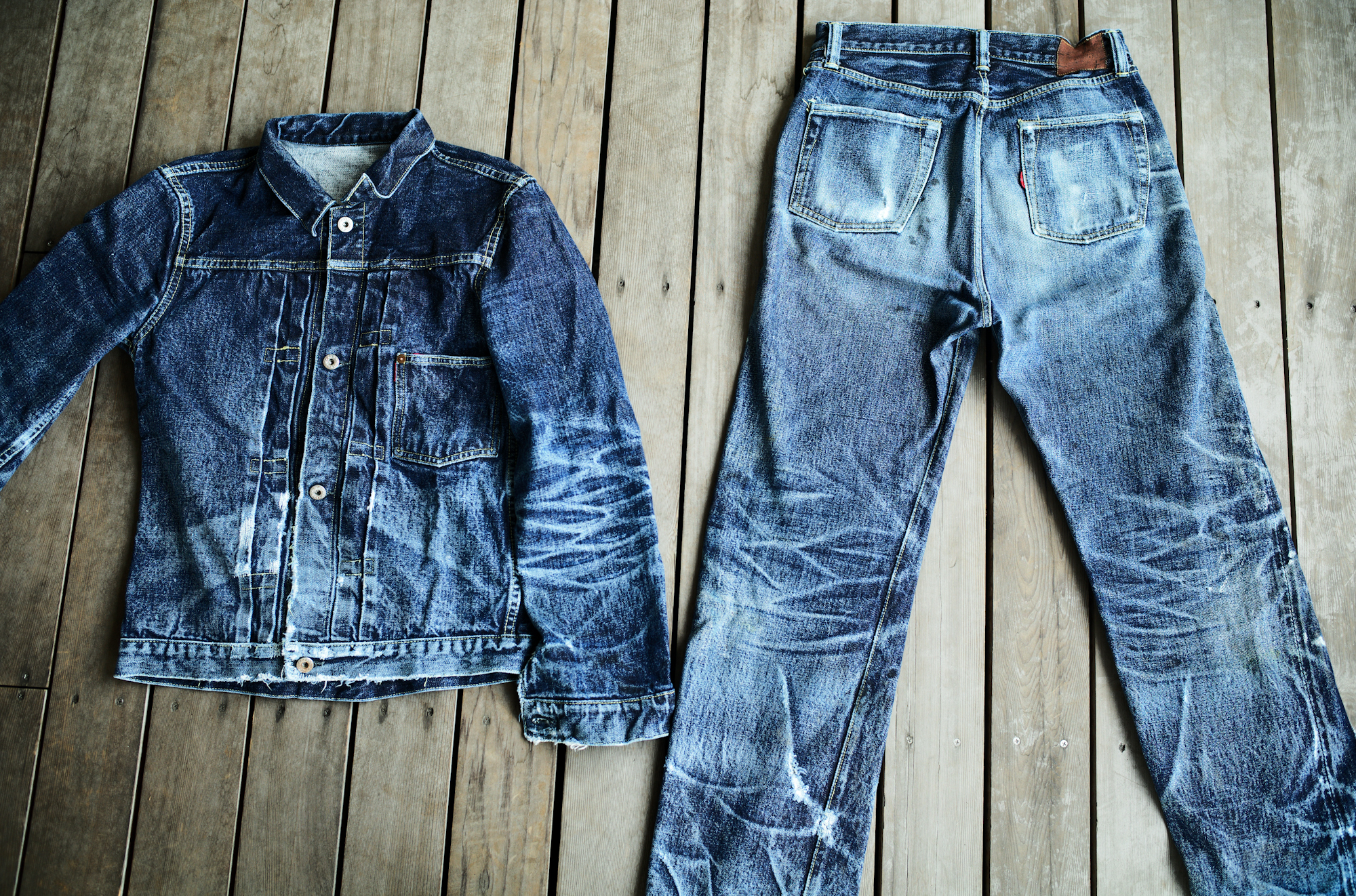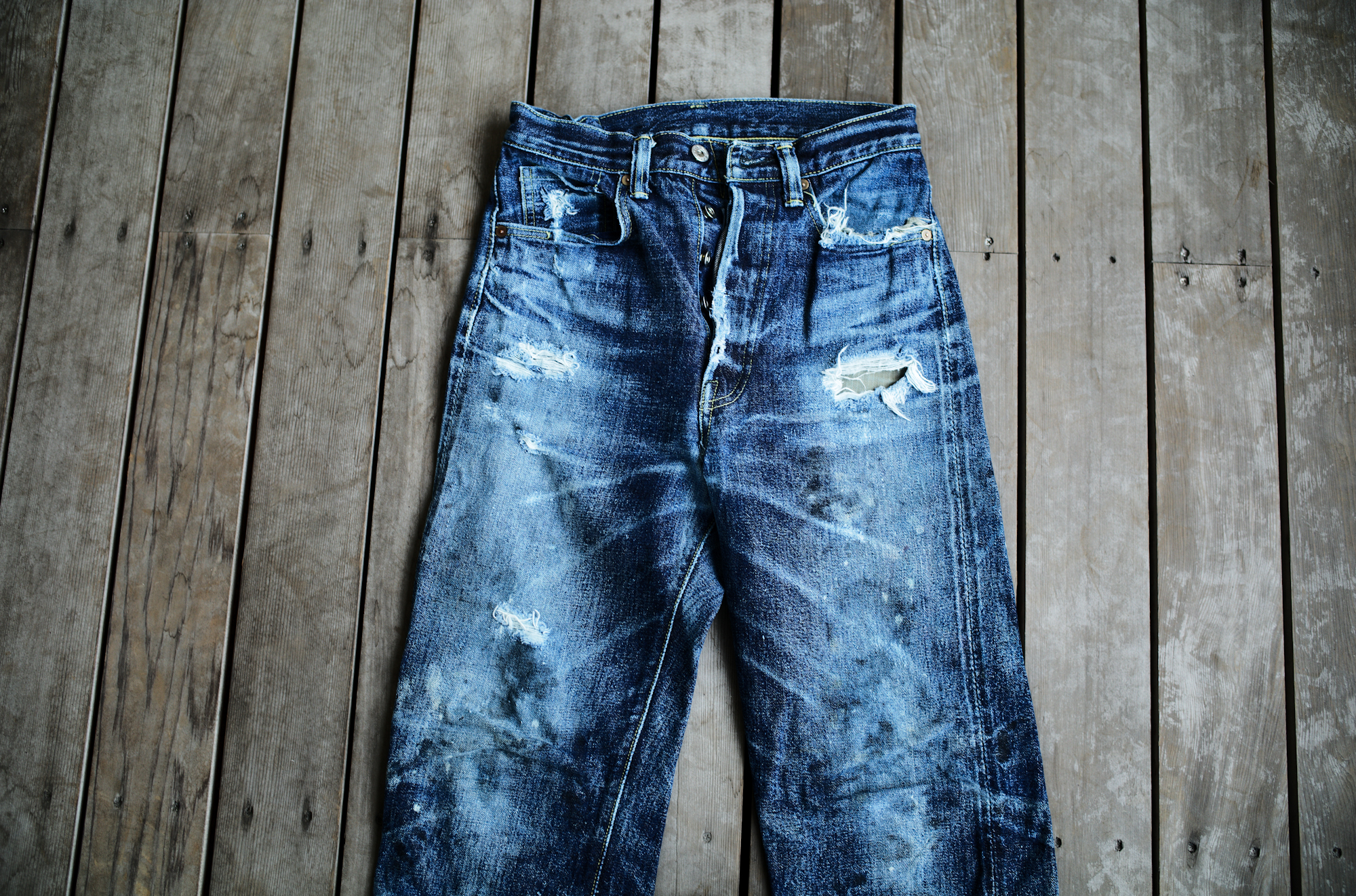 It depends on you guys whether you find them beautiful or dirty but on the contrary to the pictures of 60’s yesterday, the indigo color of our S40’s is extra deep and thanks to the hard-spun threads, deep creases can be easily settled. I find these beautiful because the fades reflect his job or his life style well.
