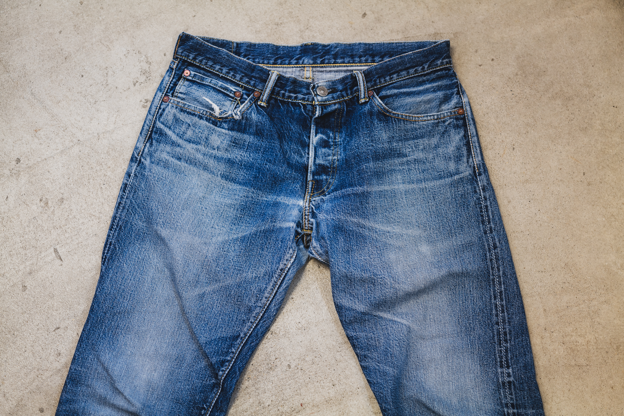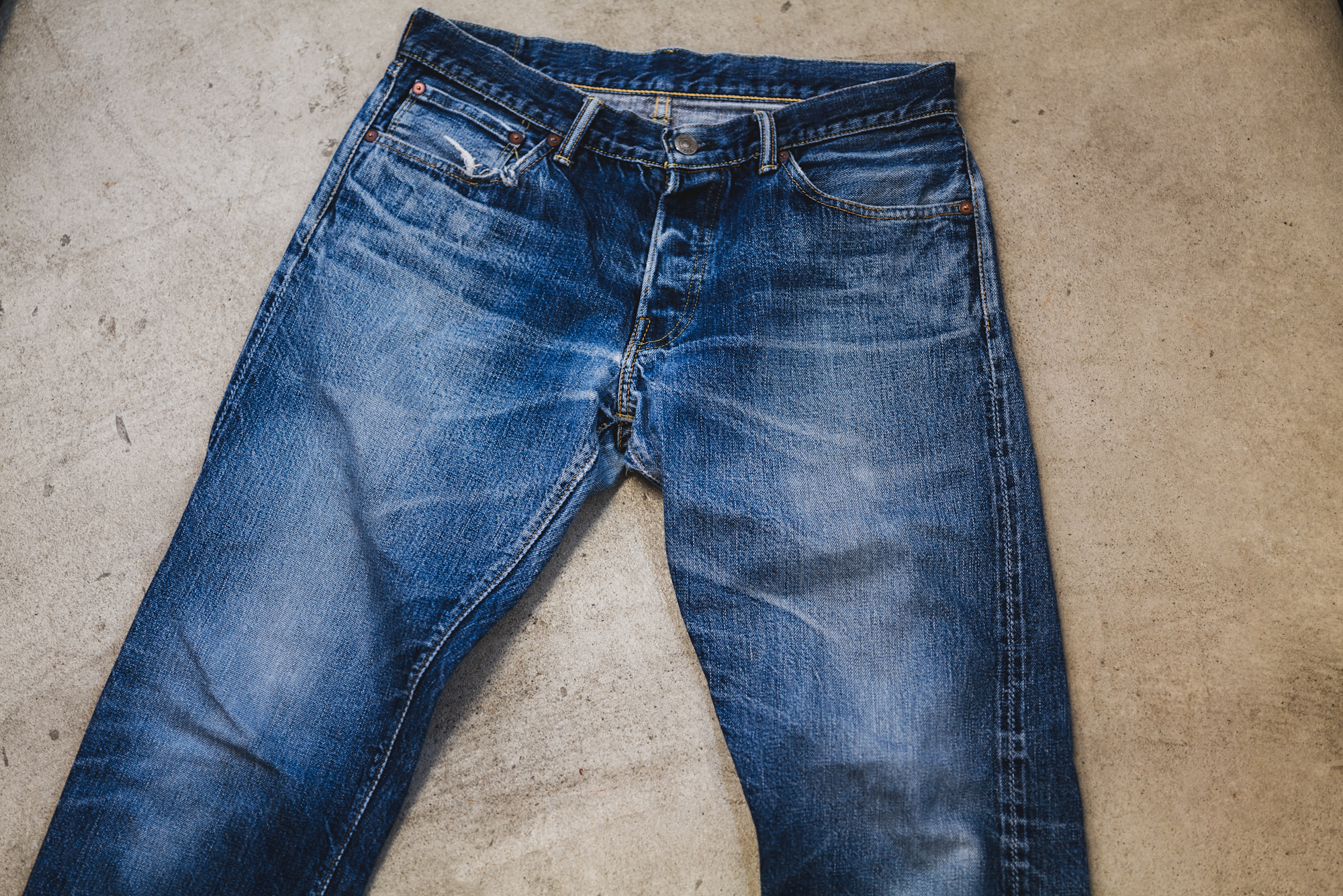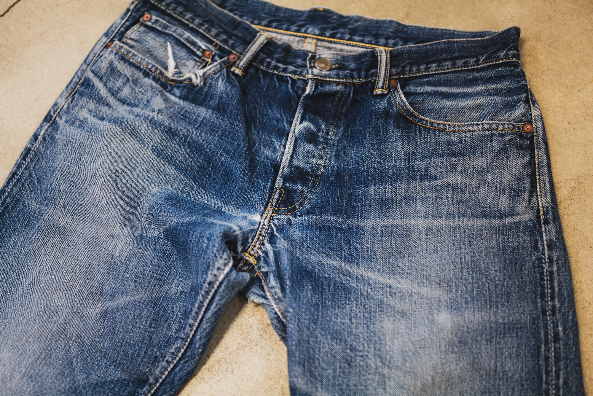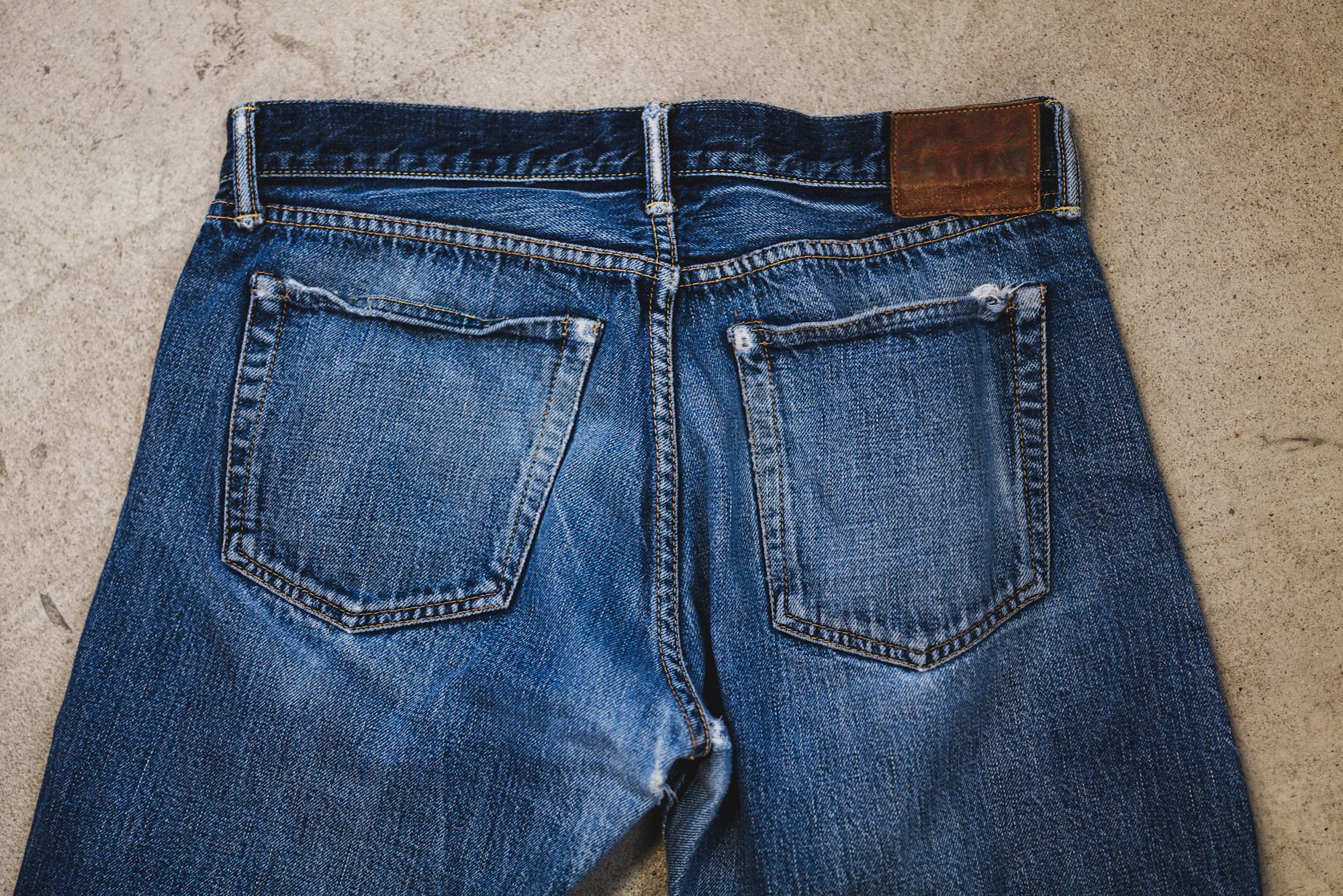 The pictures show some good fade of Slim 50’s sent back to TCB for a repair. The pictures don’t show everything but the slubby look is good and resembles the fabric of 50’s. The machine setting of lap seam is exactly what I intended back then.