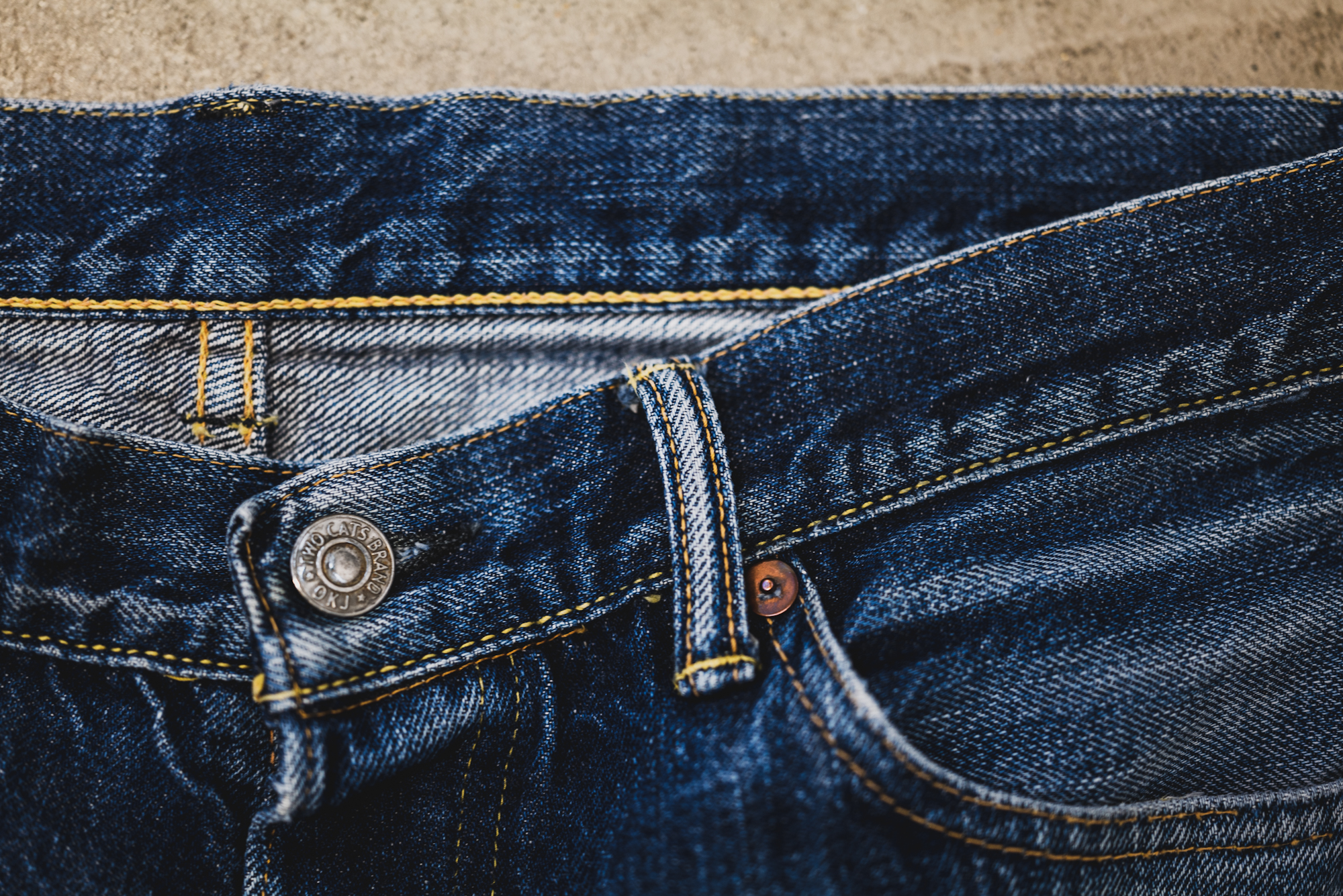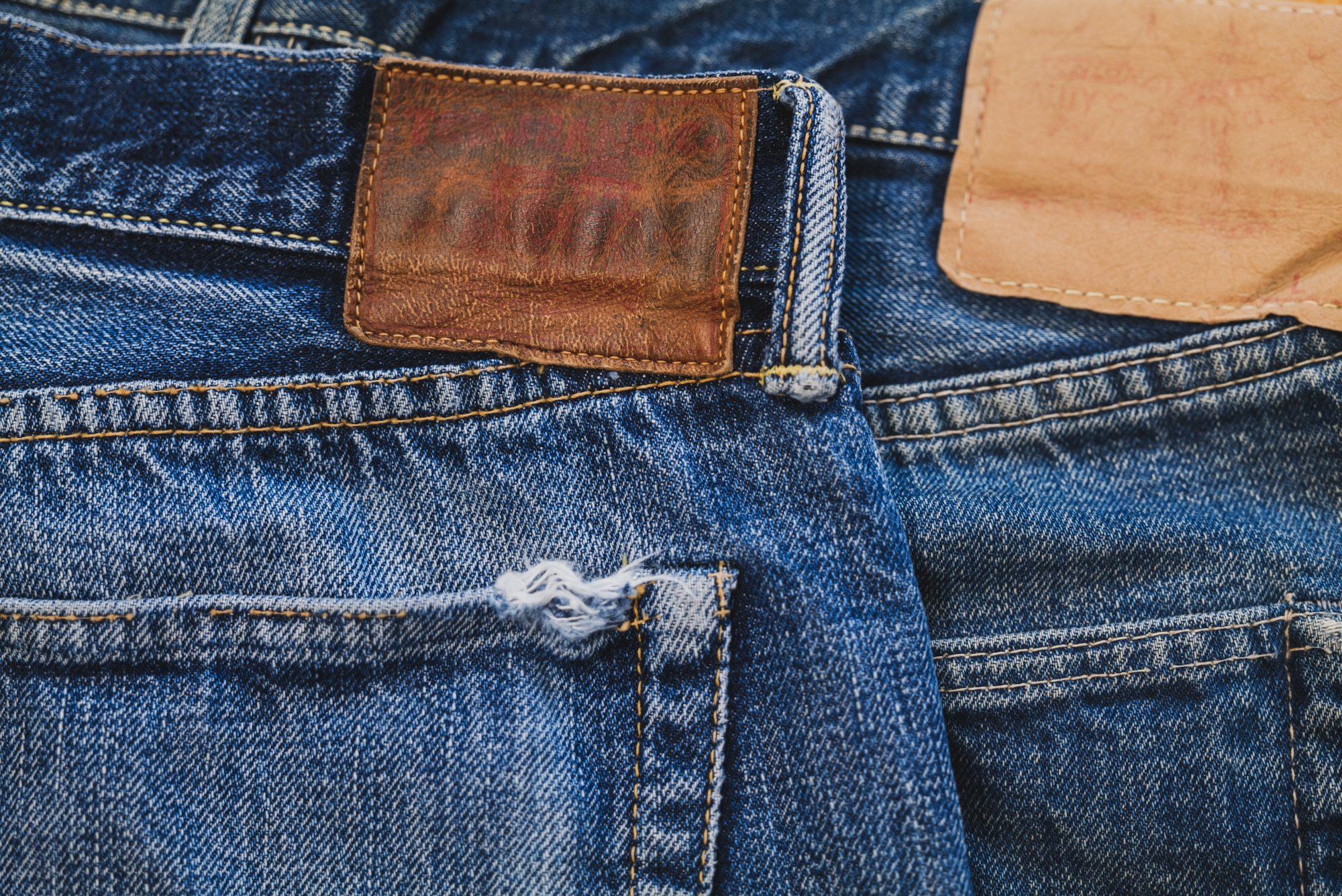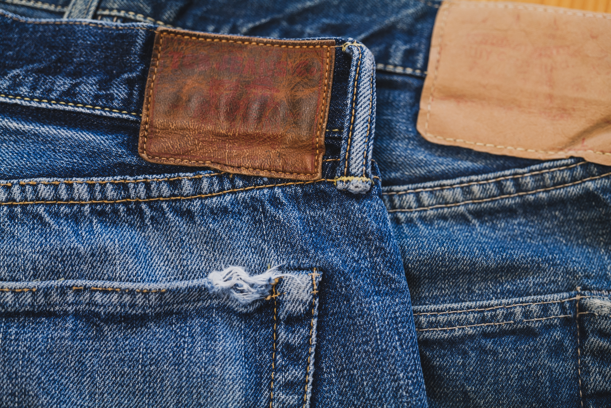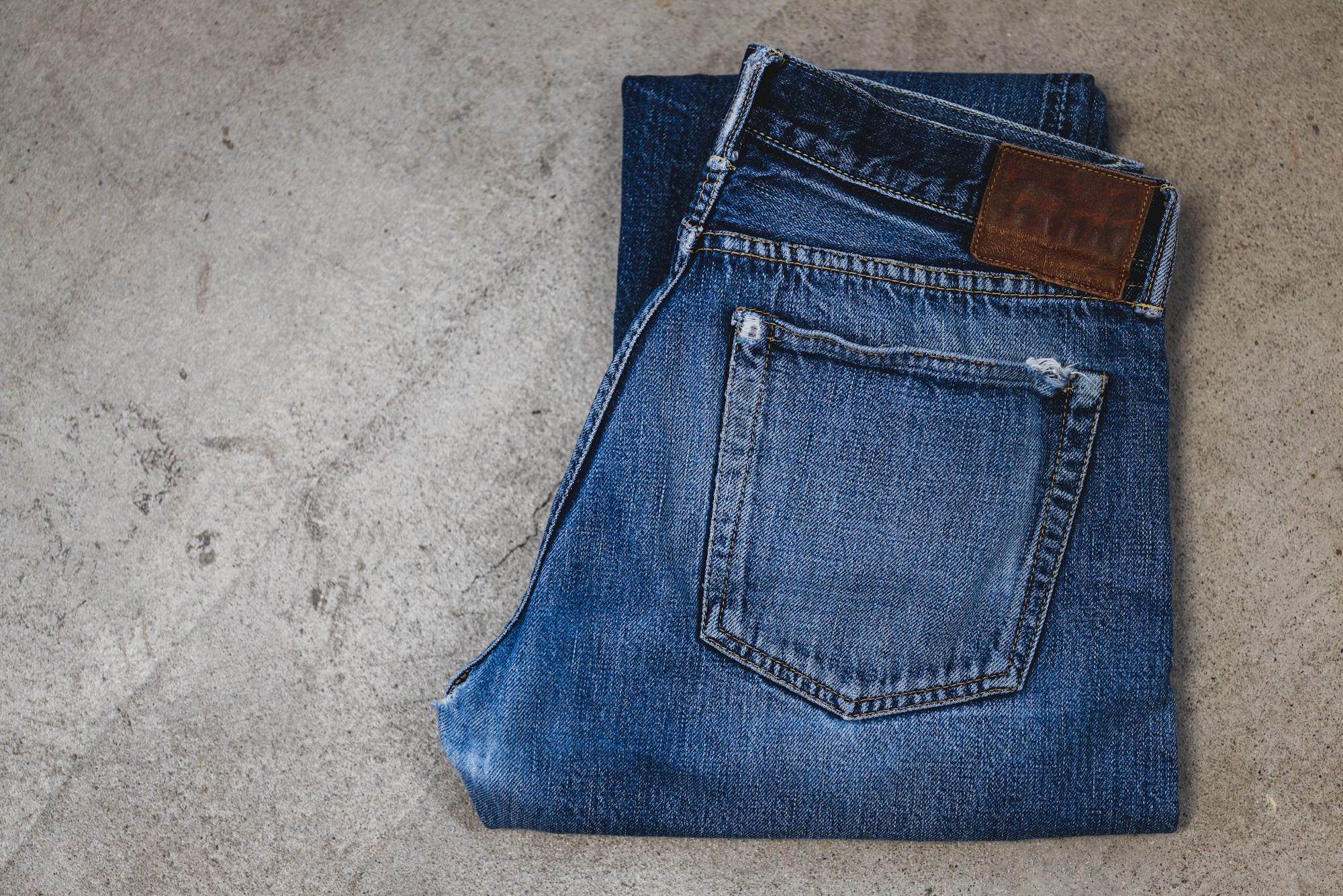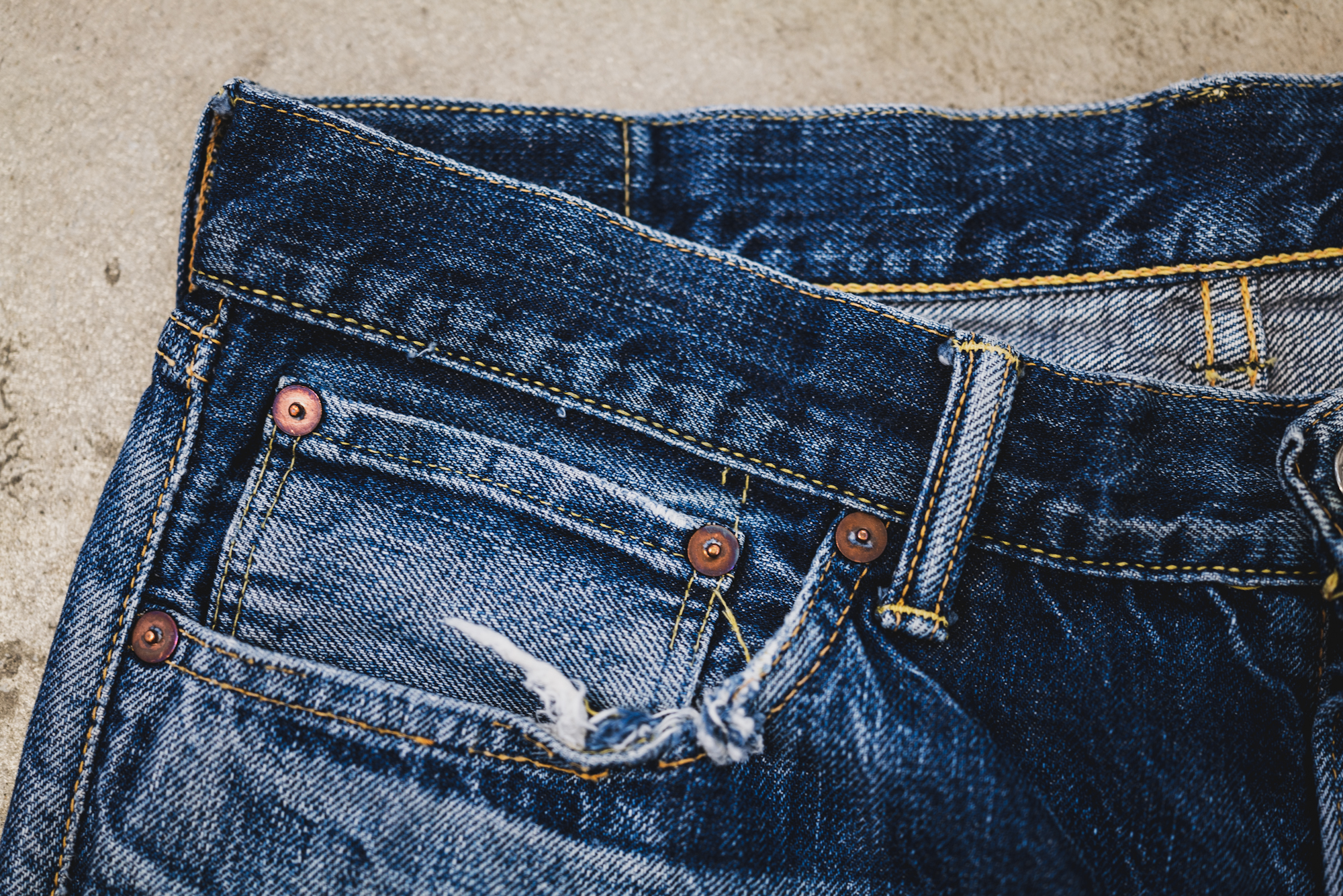 The pictures show some good fade of Slim 50’s sent back to TCB for a repair. The pictures don’t show everything but the slubby look is good and resembles the fabric of 50’s. The machine setting of lap seam is exactly what I intended back then.