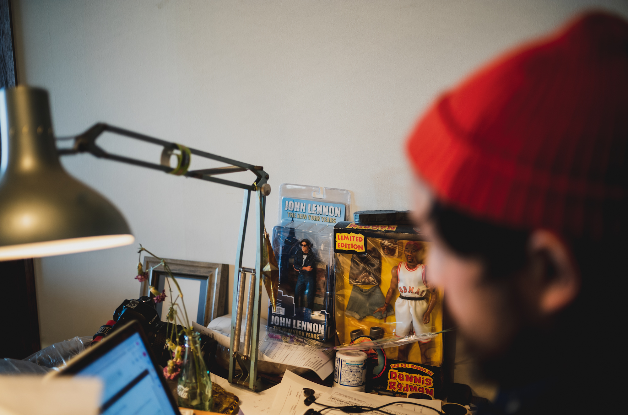 彼のデスクは子供部屋?部室?を彷彿させる雰囲気で彼の働きぶりをJohn LennonとDennis Rodmanのフィギュアが見守ってます。