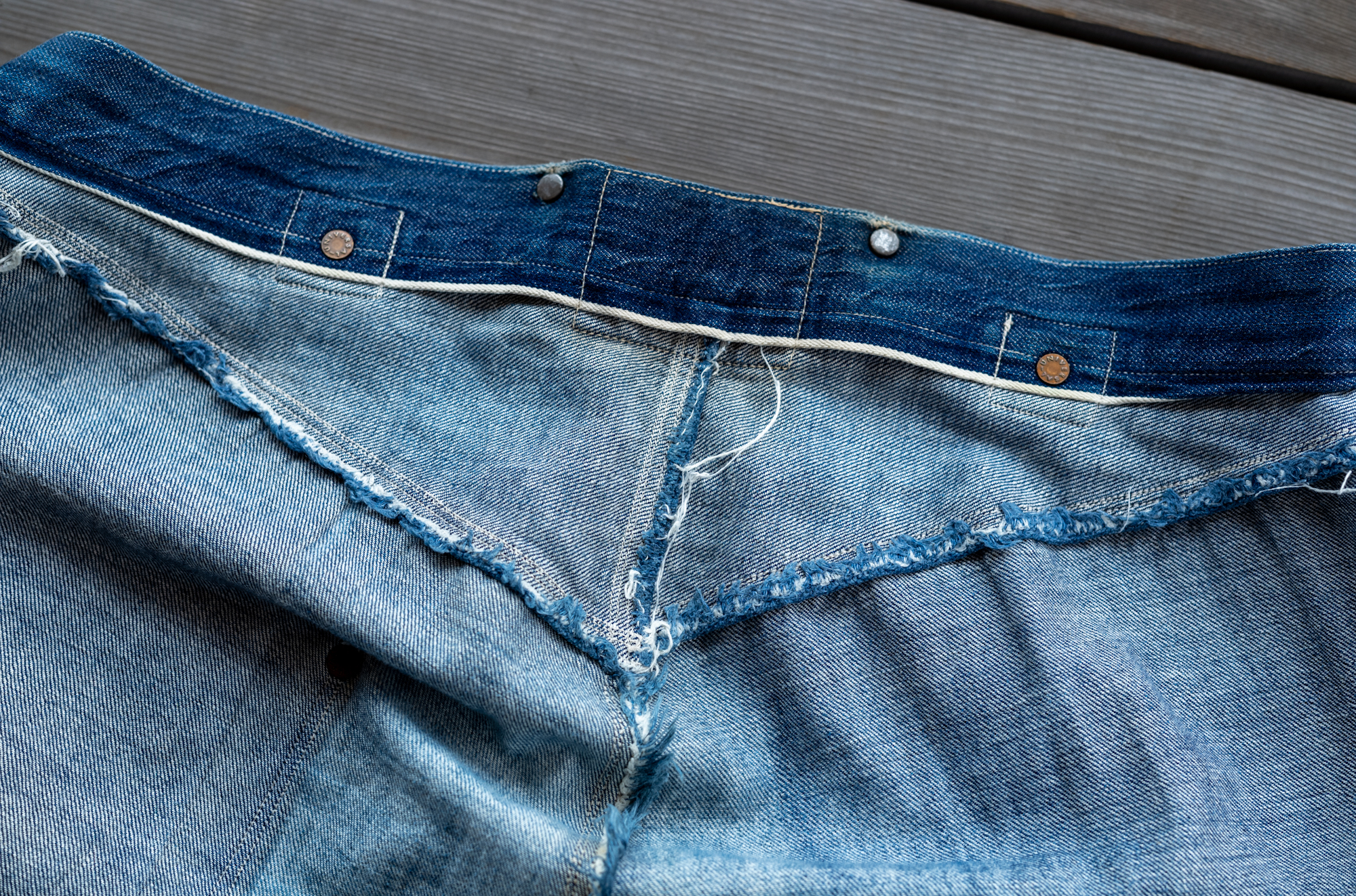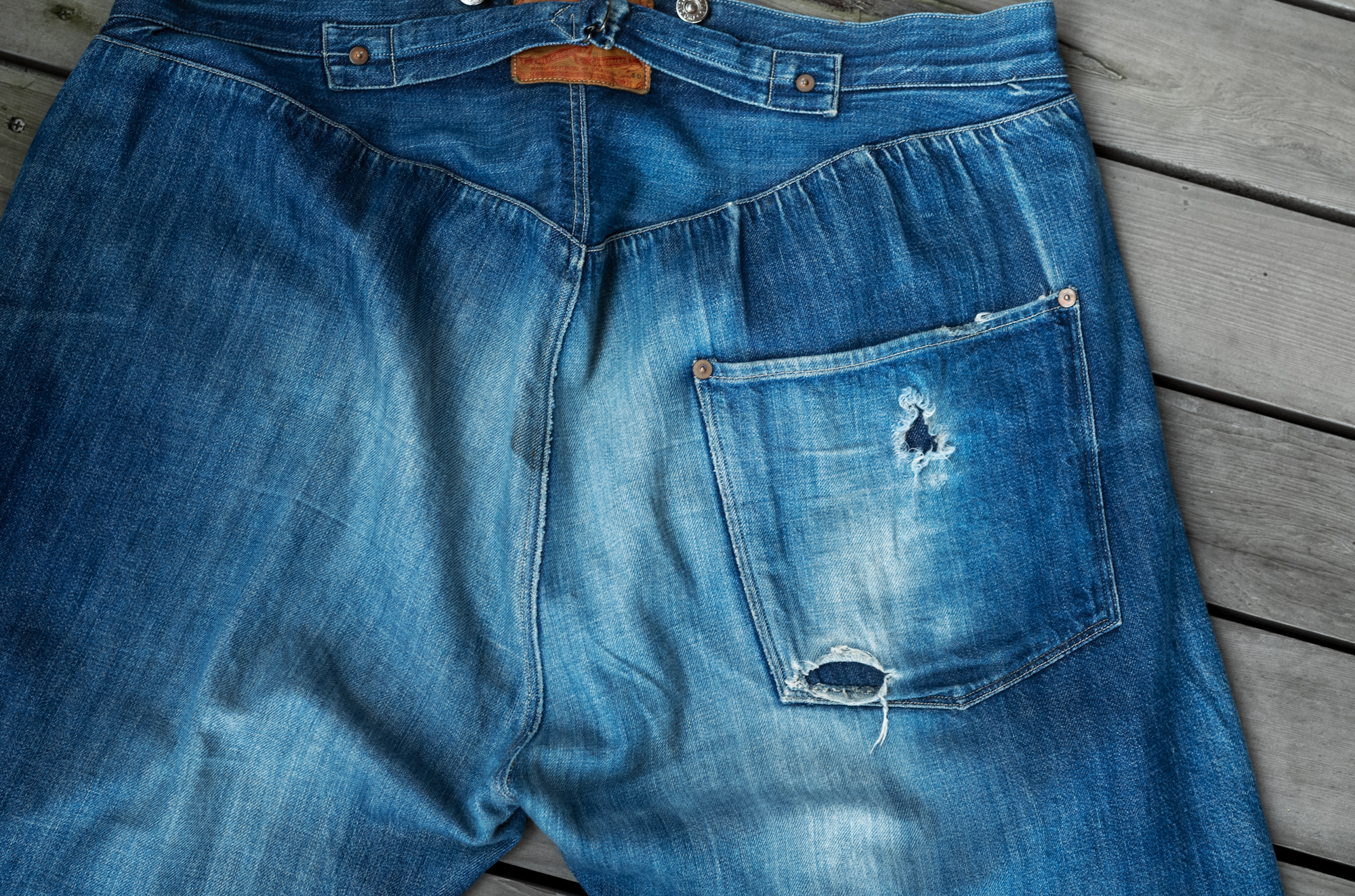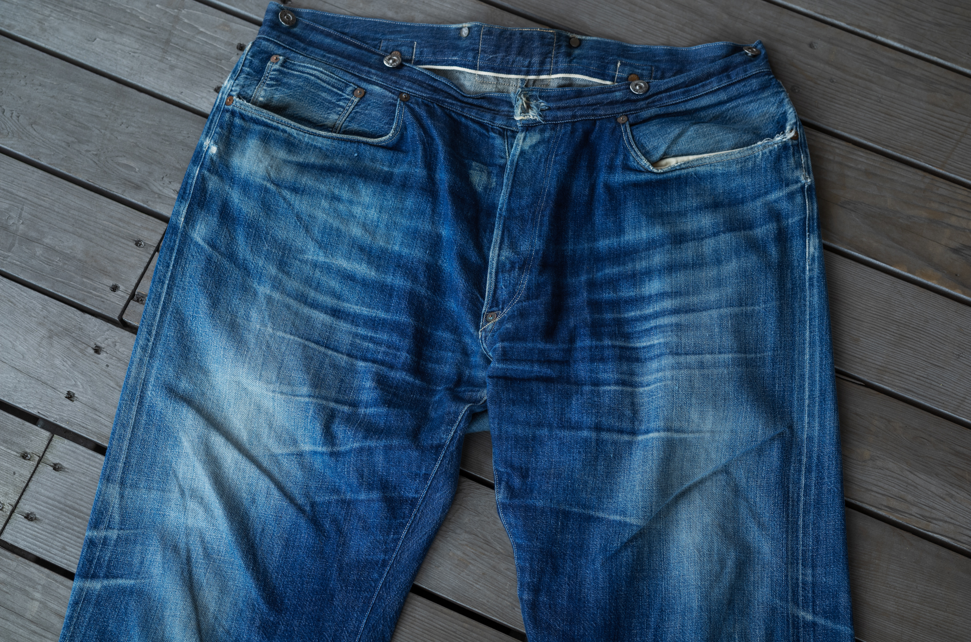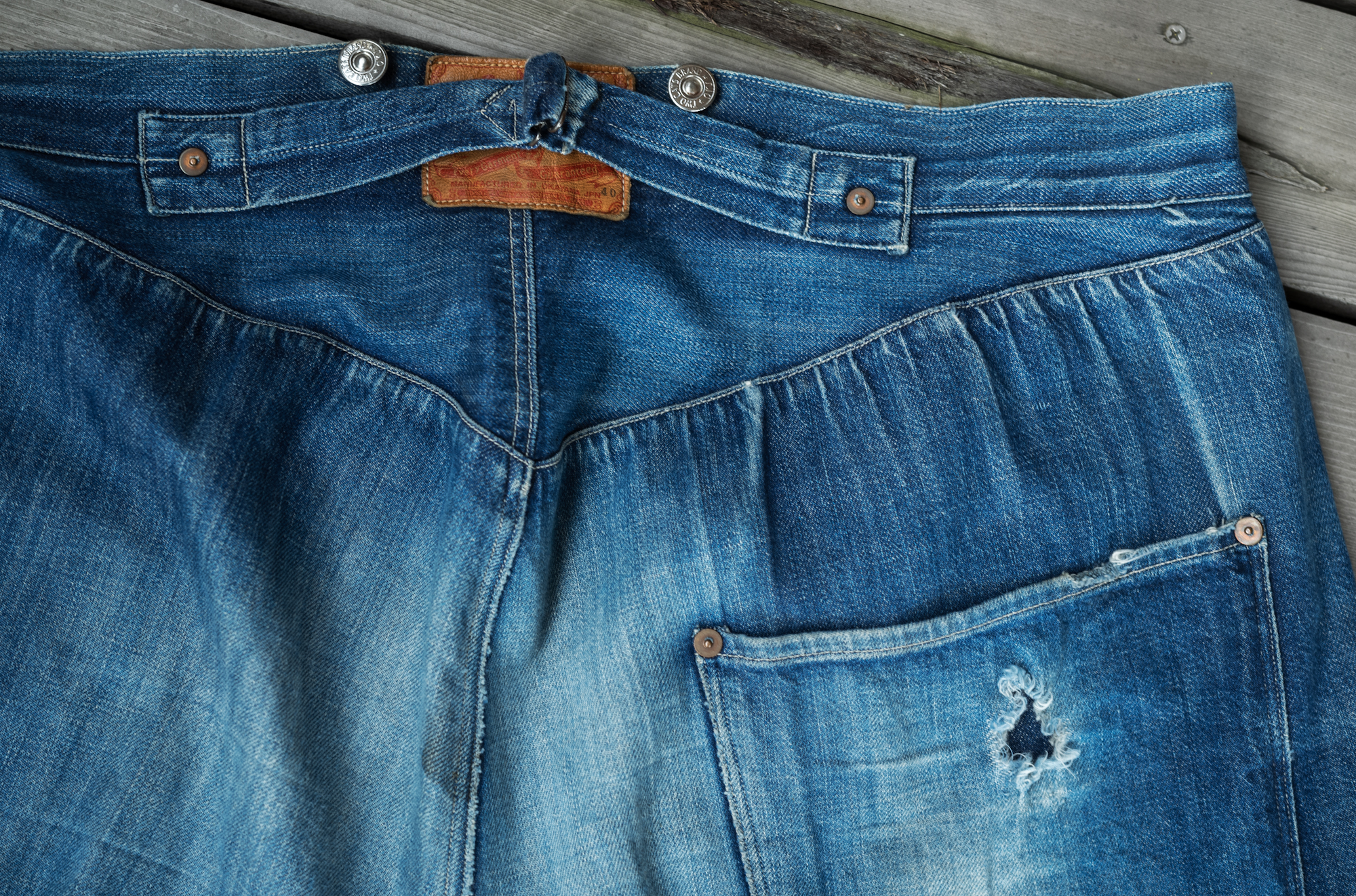 I haven’t still got a chance to see the original vintage pair os this model. When we released our Waist Overall, we reproduced the fabric from a piece of Amoskeag fabric most likely from 1880. Back when the original jeans were sold, the synthetic indigo was not invented yet so that we had to start at the stage of searching a dyeing factory who could do the pure indigo dye.