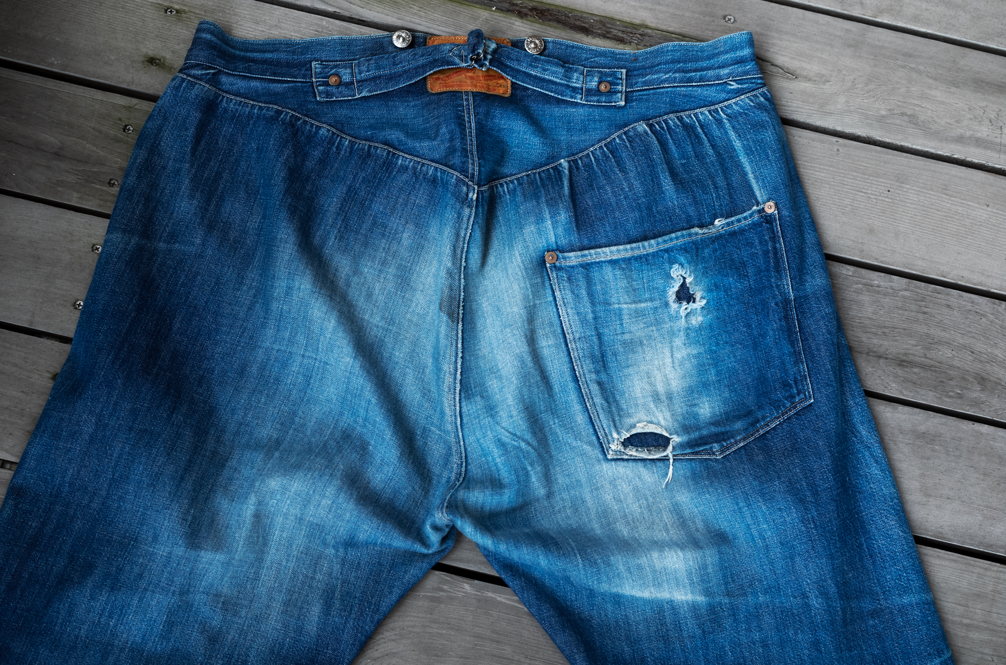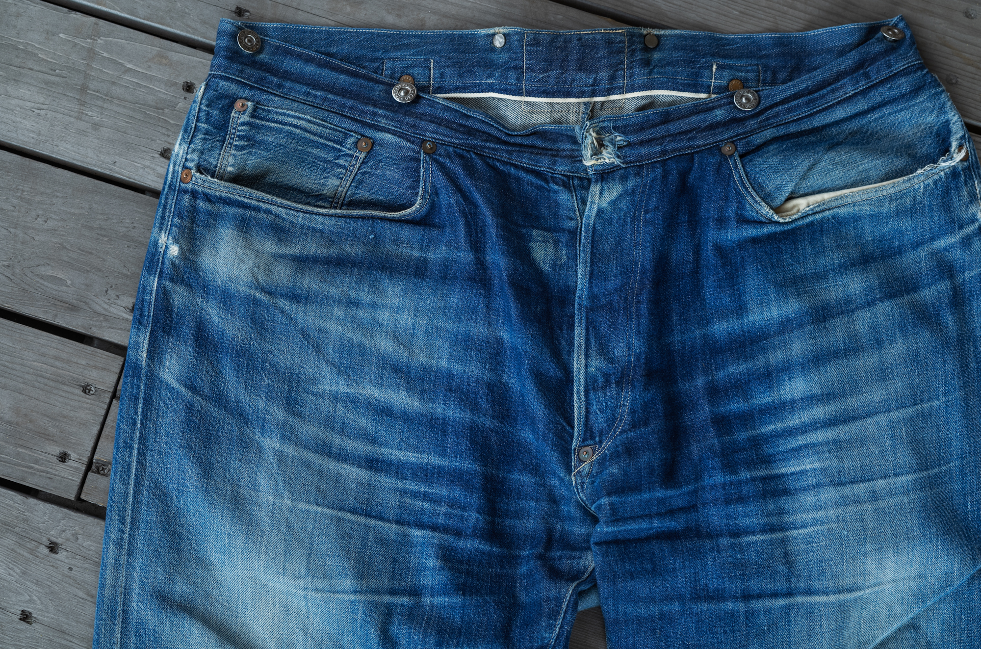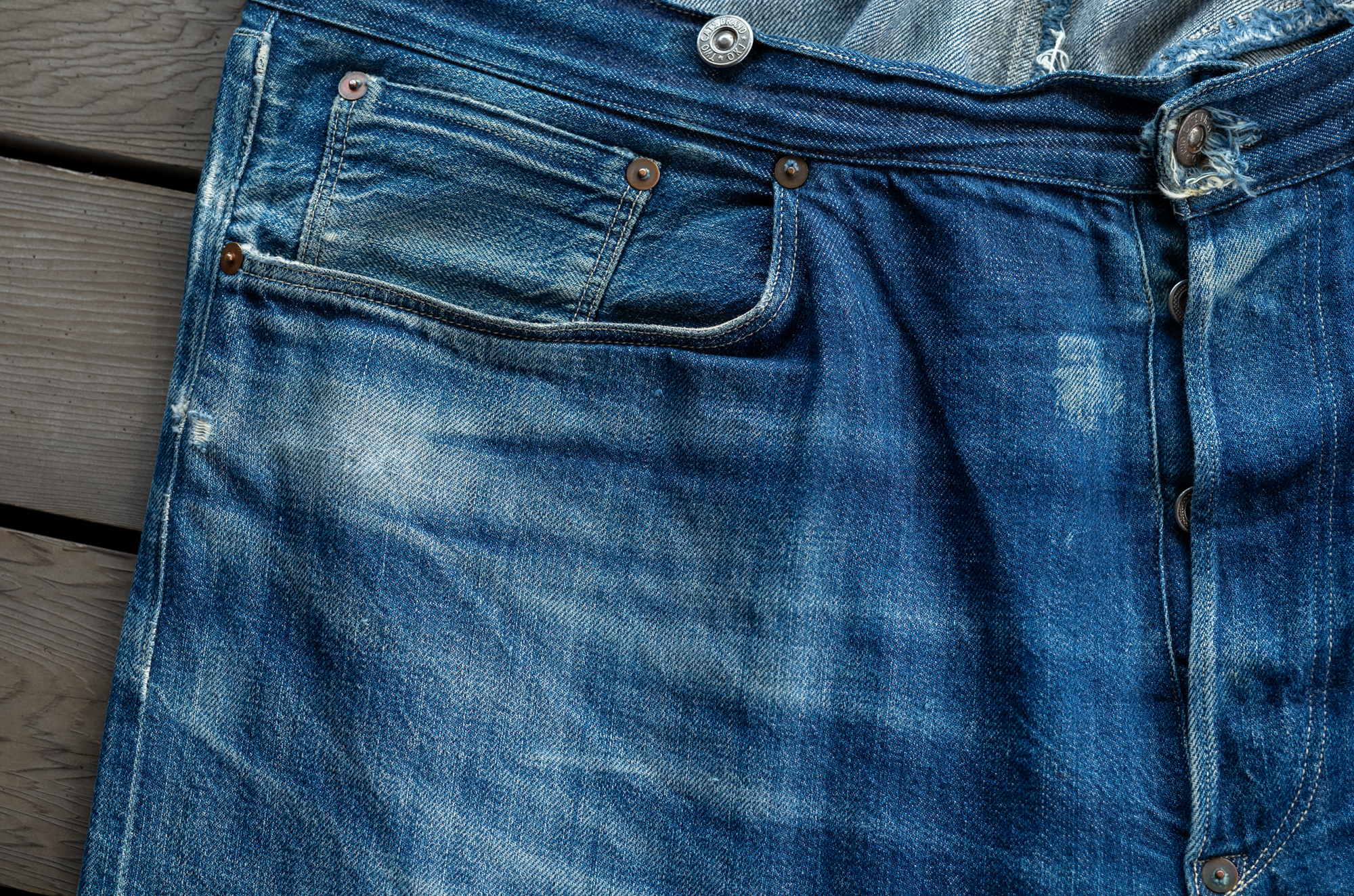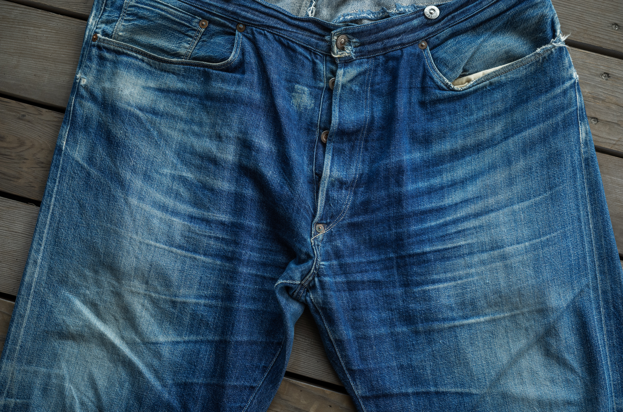 I haven’t still got a chance to see the original vintage pair os this model. When we released our Waist Overall, we reproduced the fabric from a piece of Amoskeag fabric most likely from 1880. Back when the original jeans were sold, the synthetic indigo was not invented yet so that we had to start at the stage of searching a dyeing factory who could do the pure indigo dye.