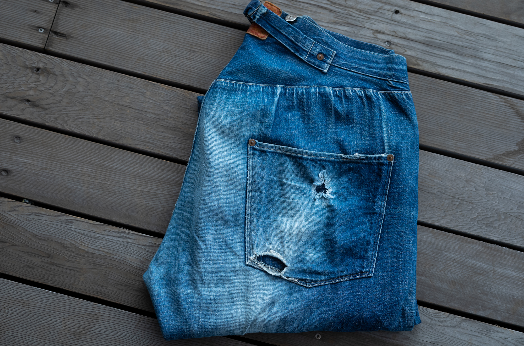 I can’t tell you about the exact process of the dyeing because the pure indigo dyeing by rope-dye method is confidential even to the orderer (TCB) but with the top secret method, we were able to get the fabric done right! Due to the characteristic of any pure indigo dye, the tinge tends to get lighter but the indigo itself perpetrated to the core of each yarn, meaning that it takes more time to fade. In addition, it can also be said that this fabric has a wider range of the indigo color on jeans than the normal synthetic dyed fabric so the fade reflects more individual differences than the normal jeans.