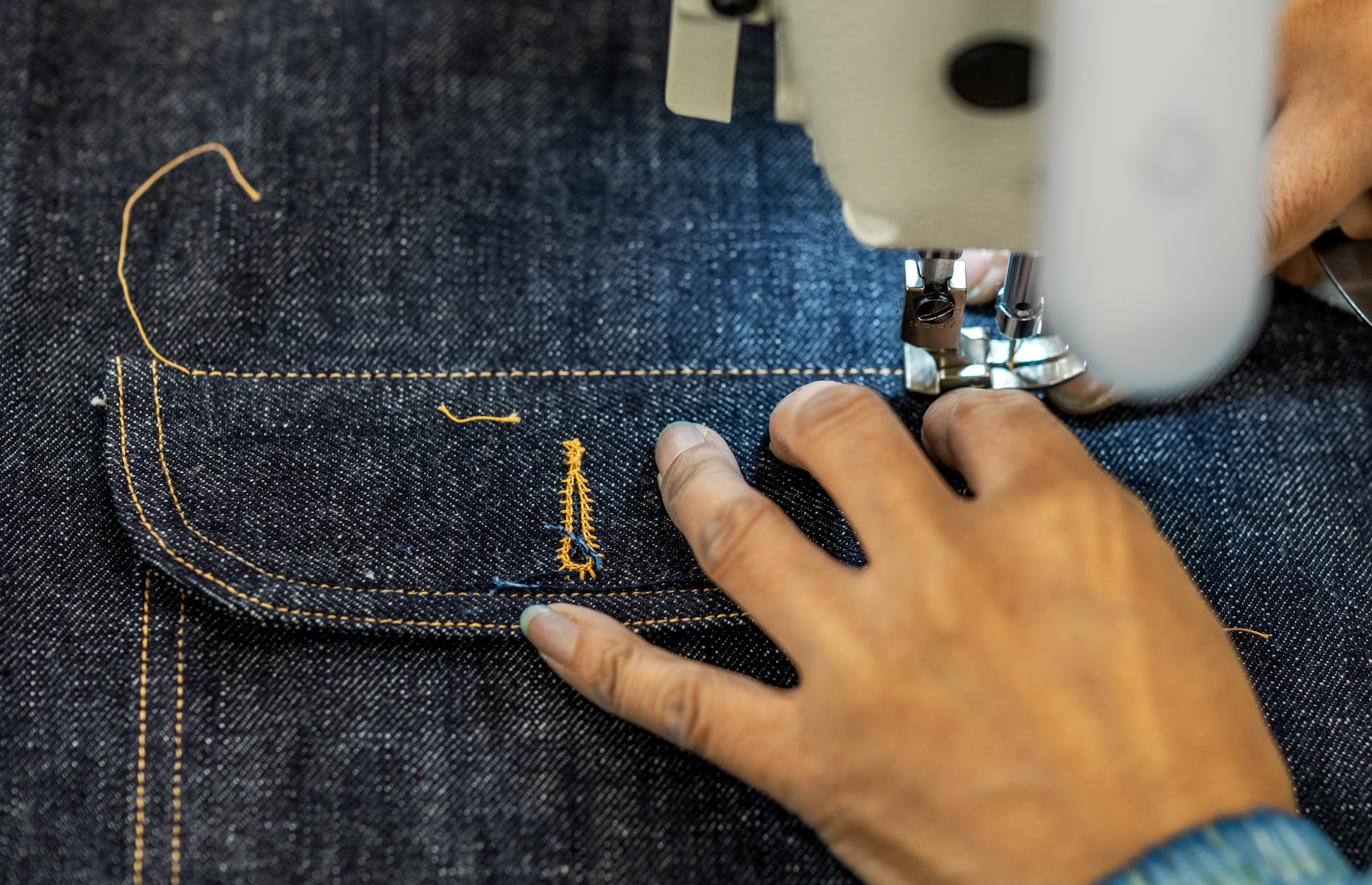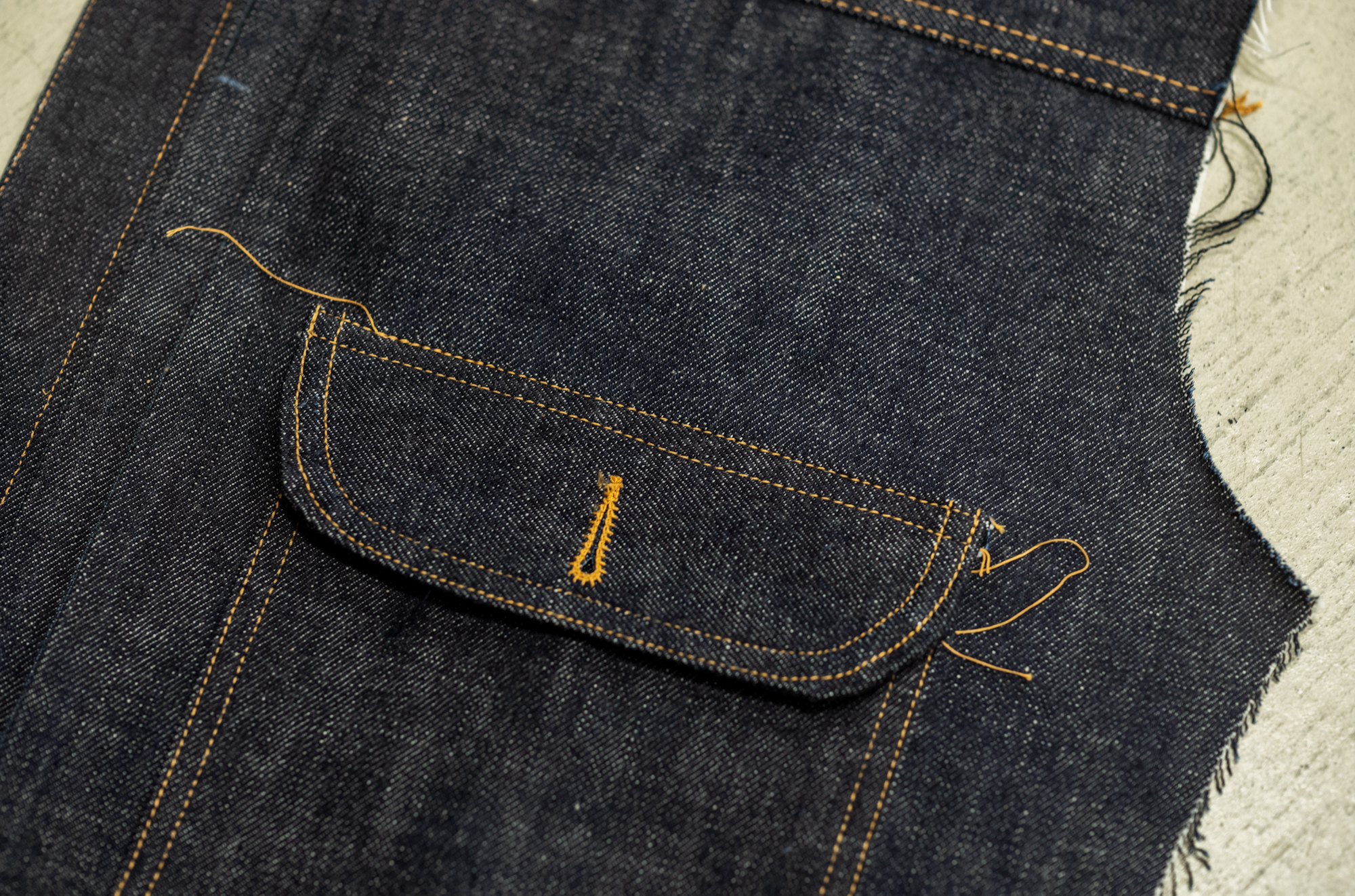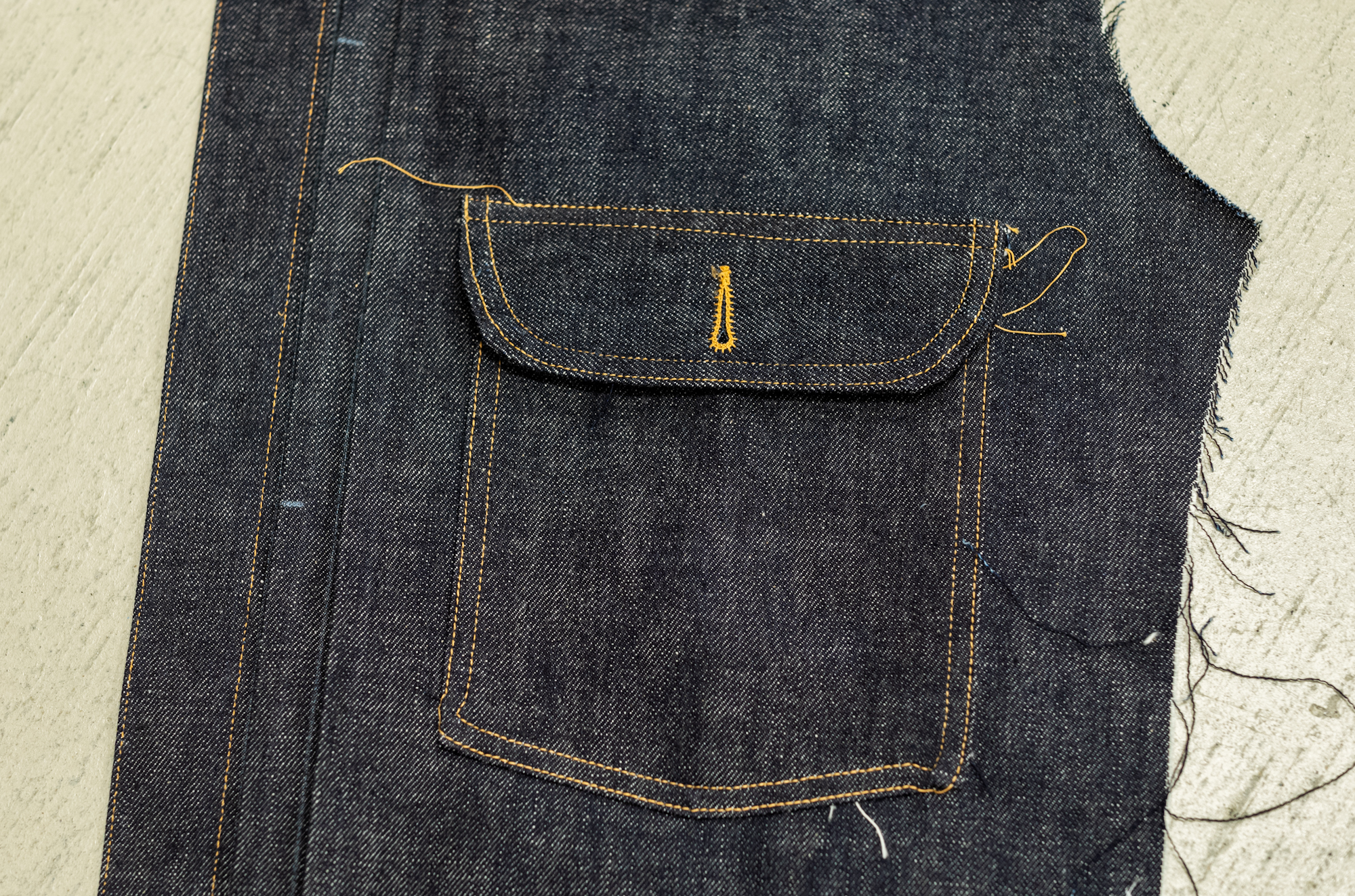 After attaching the pocket to the body by a two-needle sewing machine, we attach the pocket flap by a single needle machine as the next process. Usually the pocket and its flap are sewn together in one-go after the two-needle machines prevailed in the US. But, it seems it was two separated processes in the 30’s.