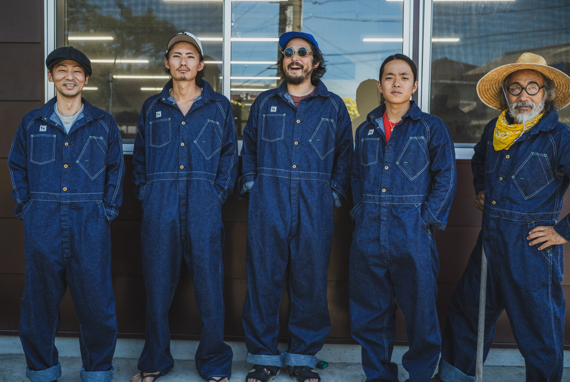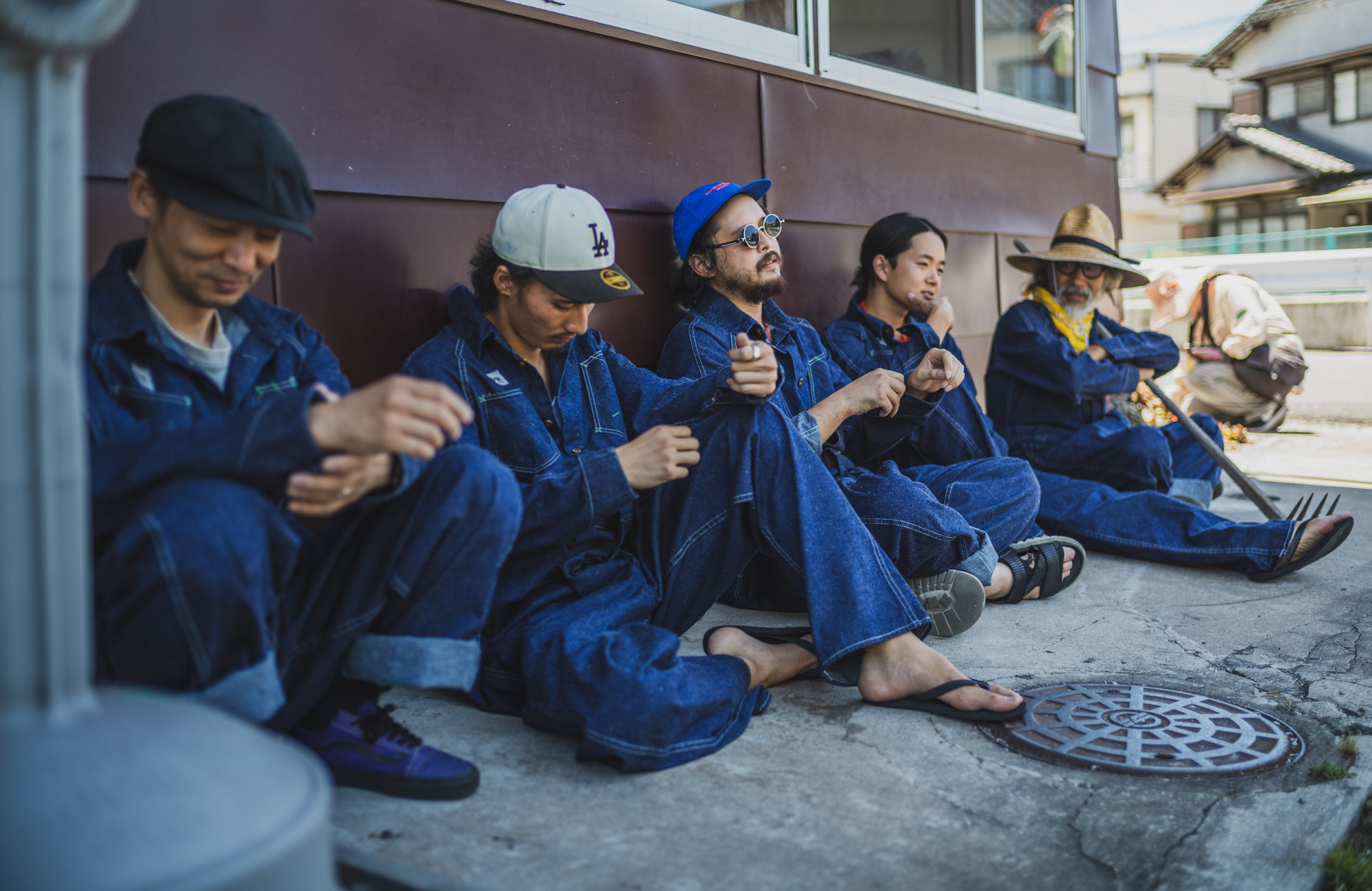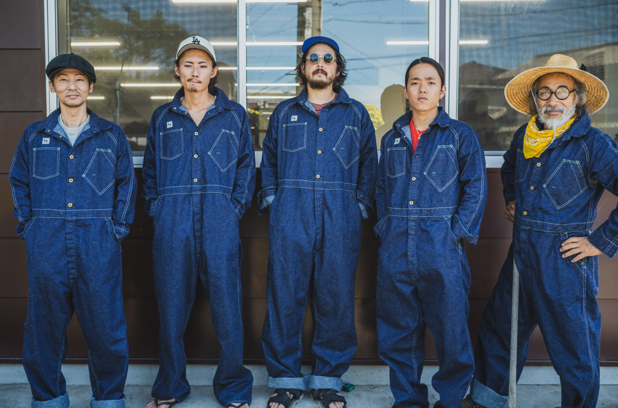 But after 10 years passed since its beginning, I now have my/our crews, who I’d better call comrades, such as Taka, the production manager, Kick, the grandmaster of fabric cutting, Yuko, the sample master, Ryo, the neo hippy, and Sena and TK, the young boys who remind me of my own youth days. One day when I was puzzling over what to release as our 10th anniversary product, our young boys came to me and said, ” Hey boss, it’s TCB’s 10th year, right? We wanna wear a TCB jumpsuit and let’s take some cool group photos like the ones you see from old mining companies. And that did remind me of the conversation with Mr. Tateno and I thought that’s it!