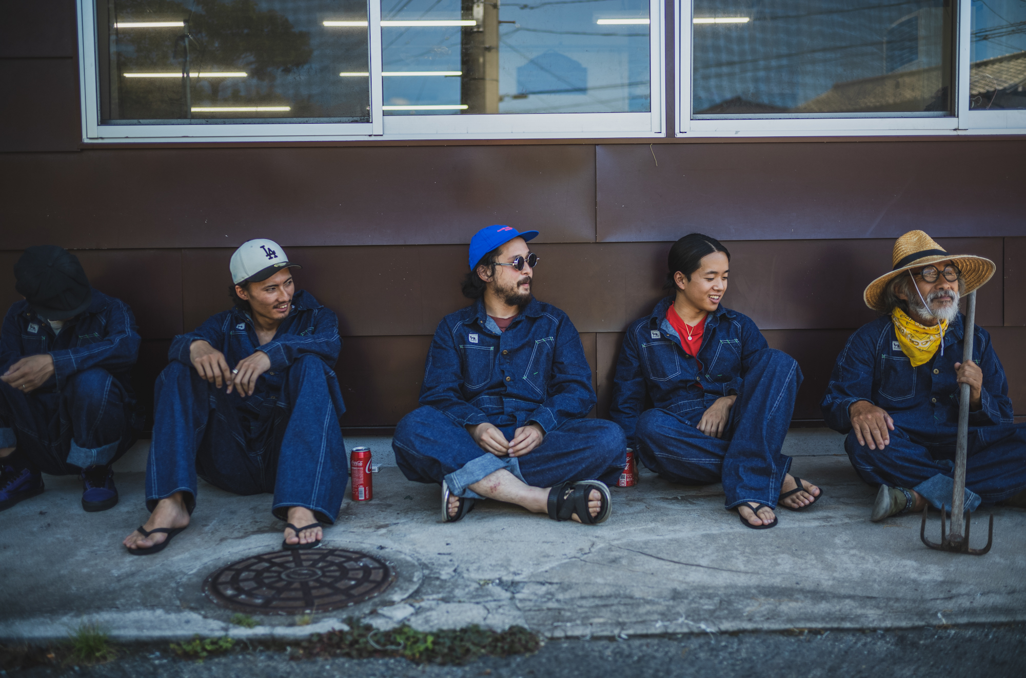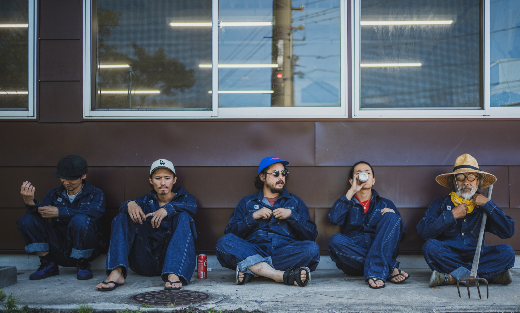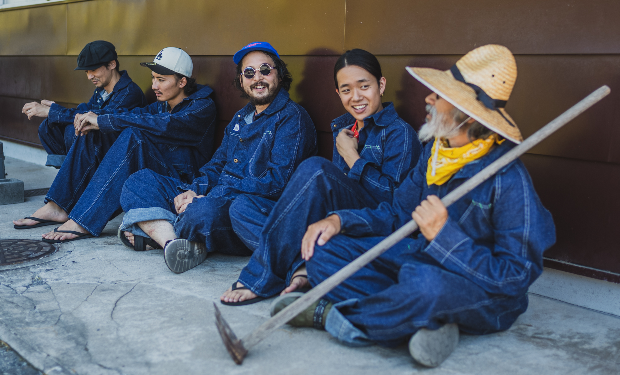 But after 10 years passed since its beginning, I now have my/our crews, who I’d better call comrades, such as Taka, the production manager, Kick, the grandmaster of fabric cutting, Yuko, the sample master, Ryo, the neo hippy, and Sena and TK, the young boys who remind me of my own youth days. One day when I was puzzling over what to release as our 10th anniversary product, our young boys came to me and said, ” Hey boss, it’s TCB’s 10th year, right? We wanna wear a TCB jumpsuit and let’s take some cool group photos like the ones you see from old mining companies. And that did remind me of the conversation with Mr. Tateno and I thought that’s it!