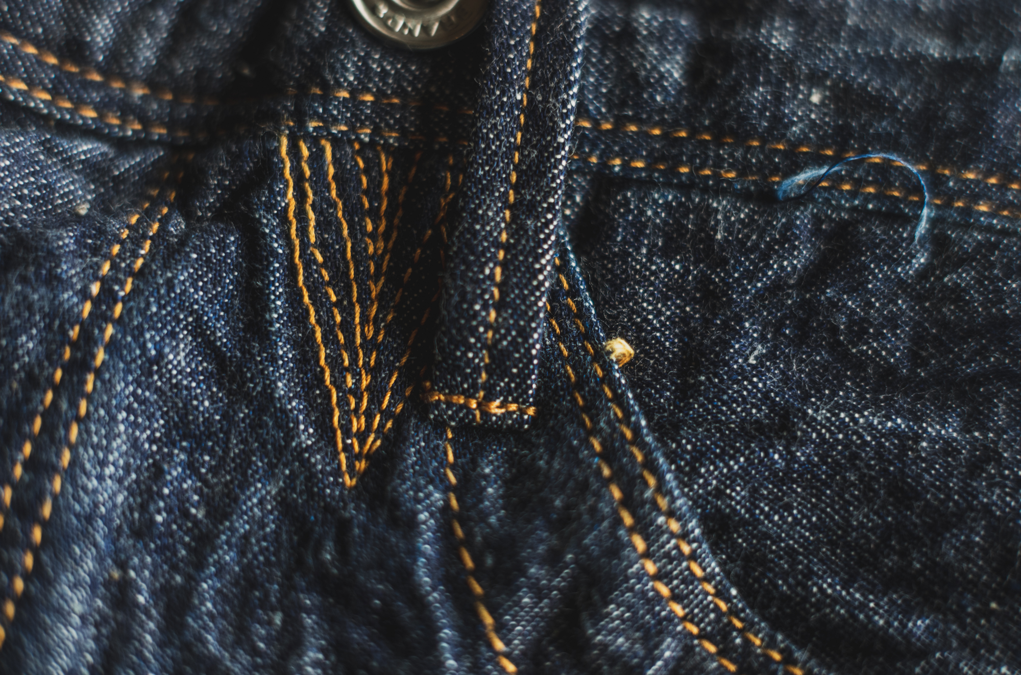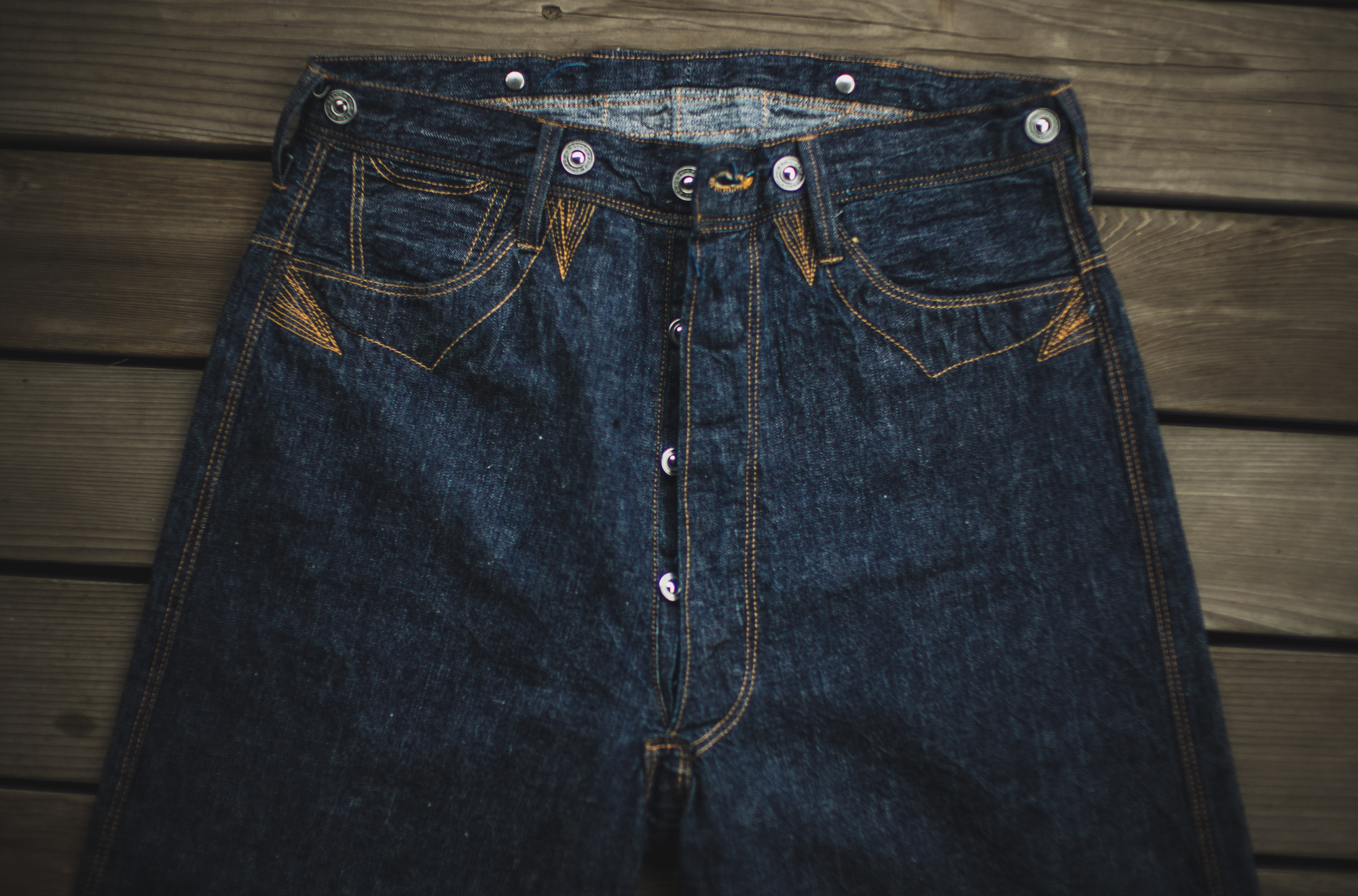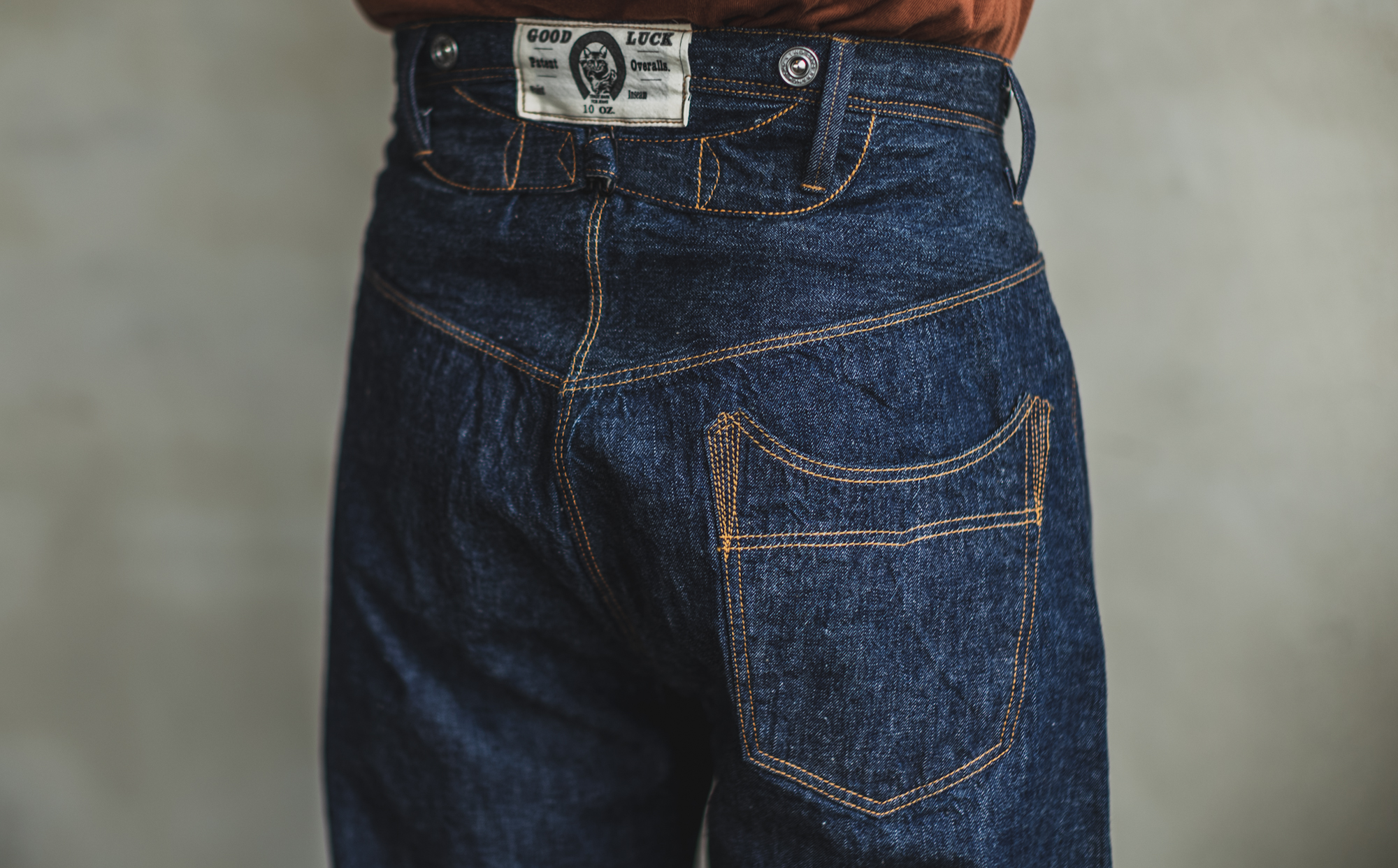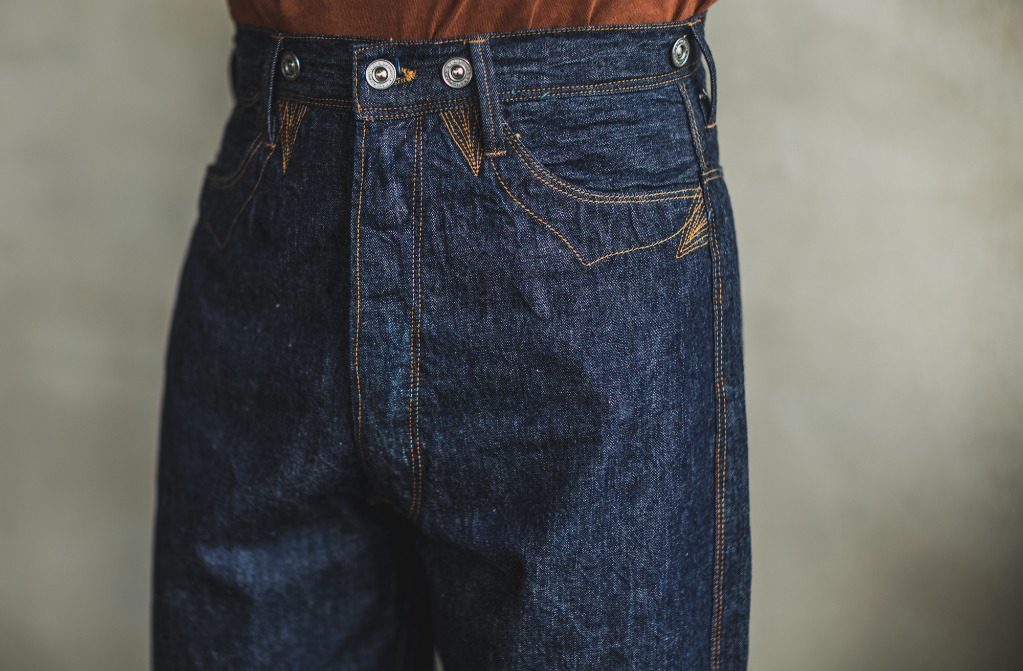 Back then, the double needle machines didn’t exist so the belt loop is also sewn by single needle machine. As the jeans have the patch in the middle, the back belt loops are attached to the cinch strap. When it comes to the number of the belt loops for jeans, 5 is the usual number but this pair will have 6. At that time, bar tuck machines didn’t exist either so they are sewn by single stitch too. In terms of durability, we sew them 3 times for long use so no worries about it!