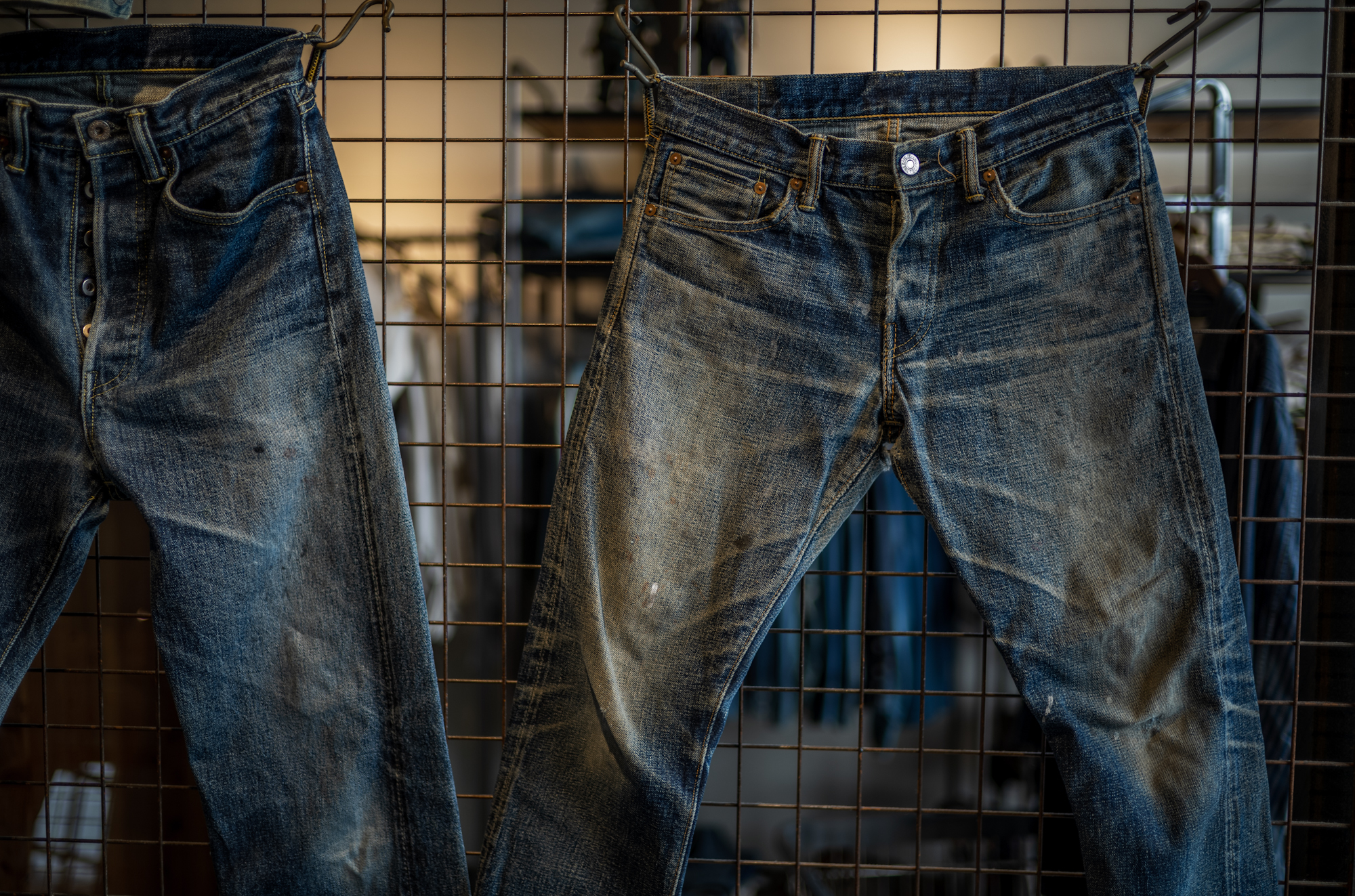 The photos show the former slim 50’s but the fabric is the same. With slim jeans it’s much easier to develop strong whiskers too!
