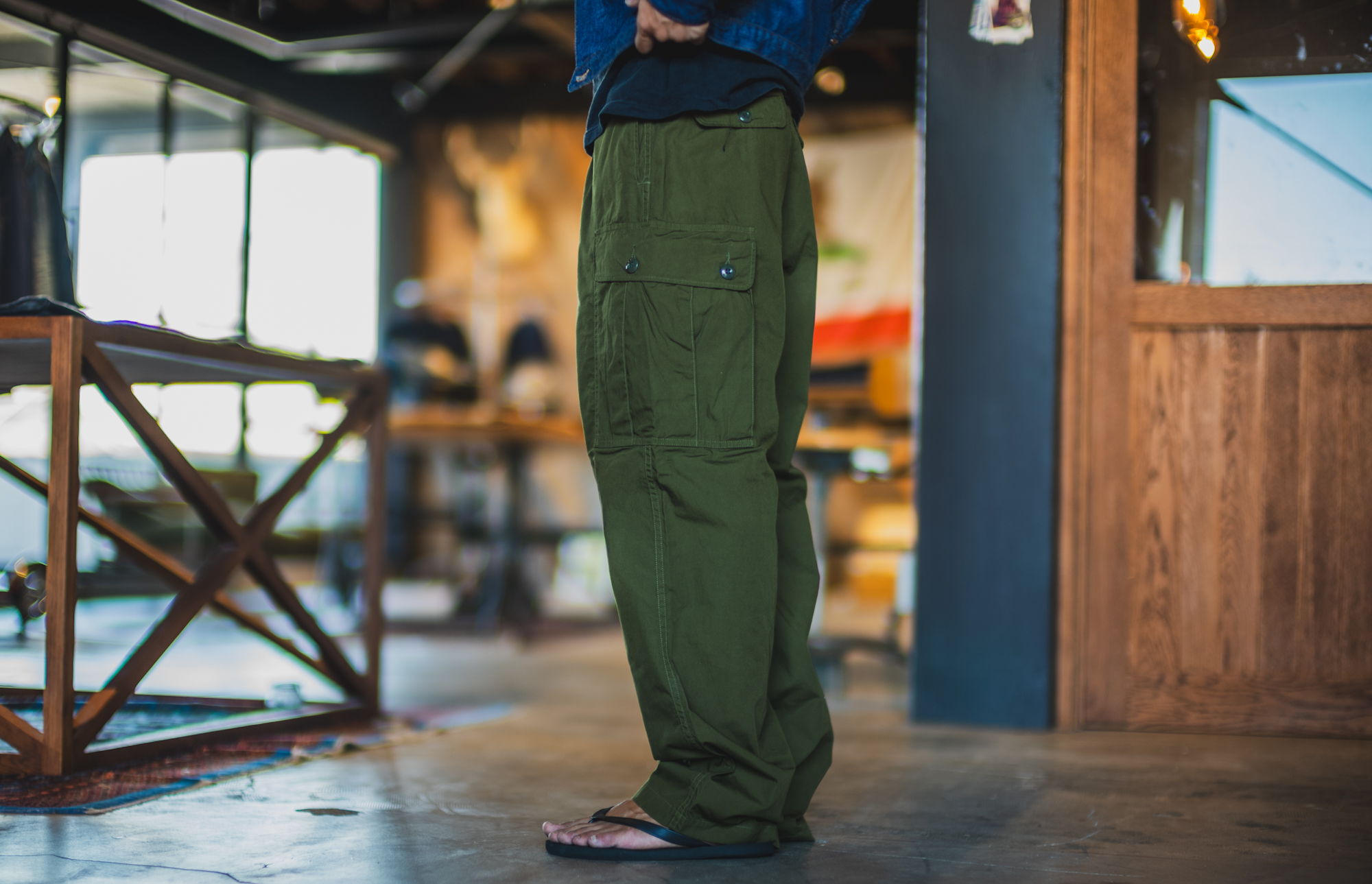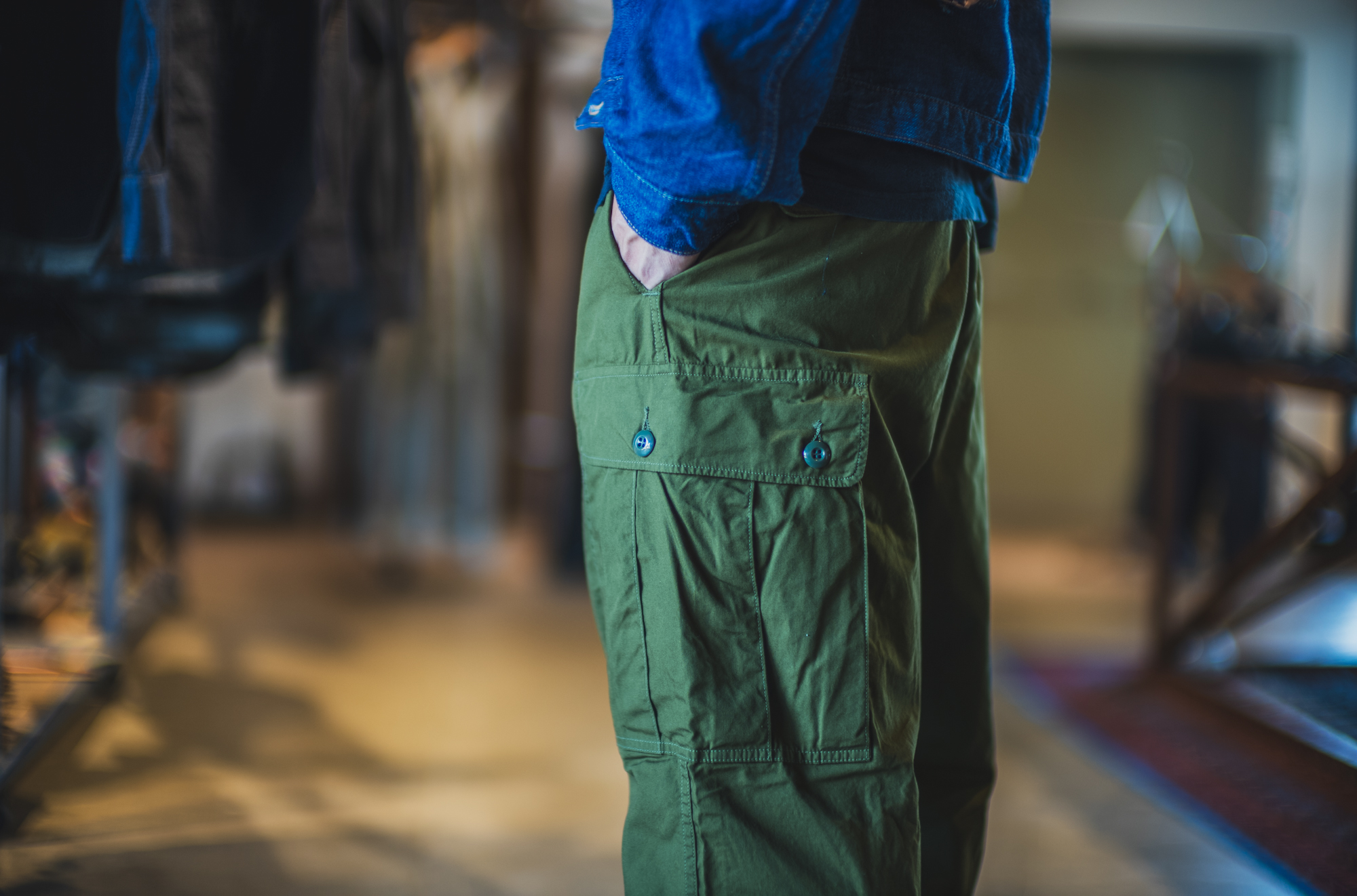 It’s originally made as field pants for tropical climate. On the later model, the side pockets are switched to snap buttons but the 1st model had these sewn-on buttons, which I personally like.