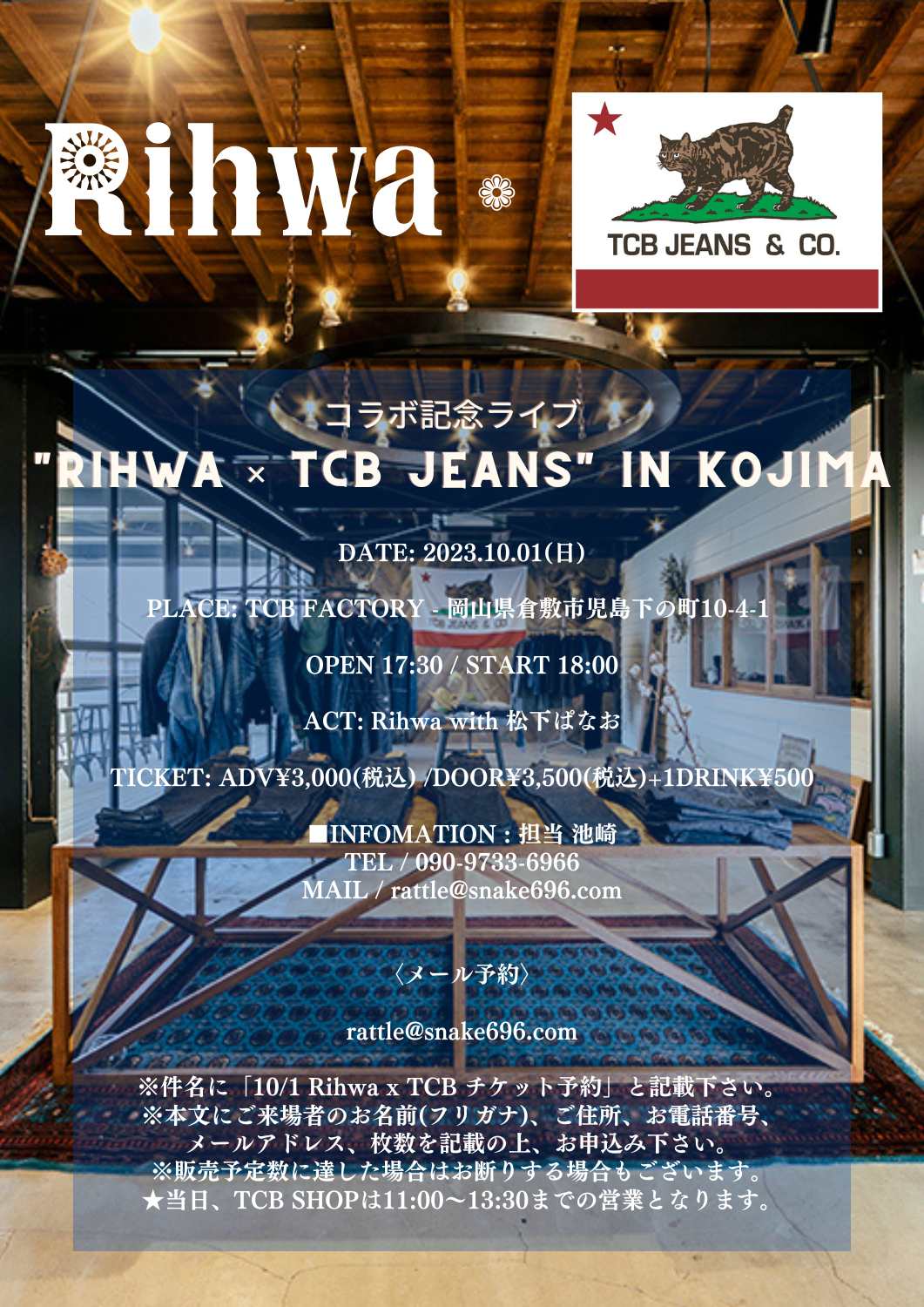 10月1日(日)に岡山・TCB FACTORY児島店にて、新作GOODSコラボを記念した「コラボ記念ライブ “Rihwa × TCB Jeans” in KOJIMA」を開催いたします!