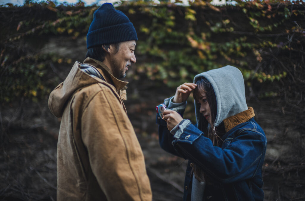 日曜の撮影だったのに心配性のお父さんは勝手に付いてきて撮影途中、娘が前髪をチェックするのに風で乱れないように前に立って壁になるという溺愛っぷり。