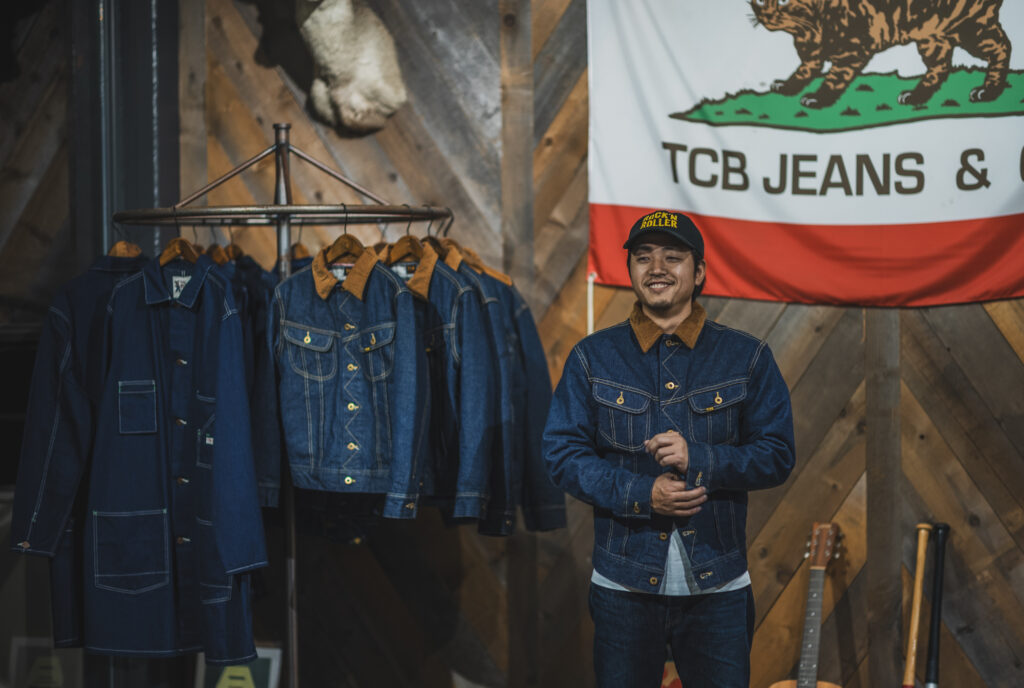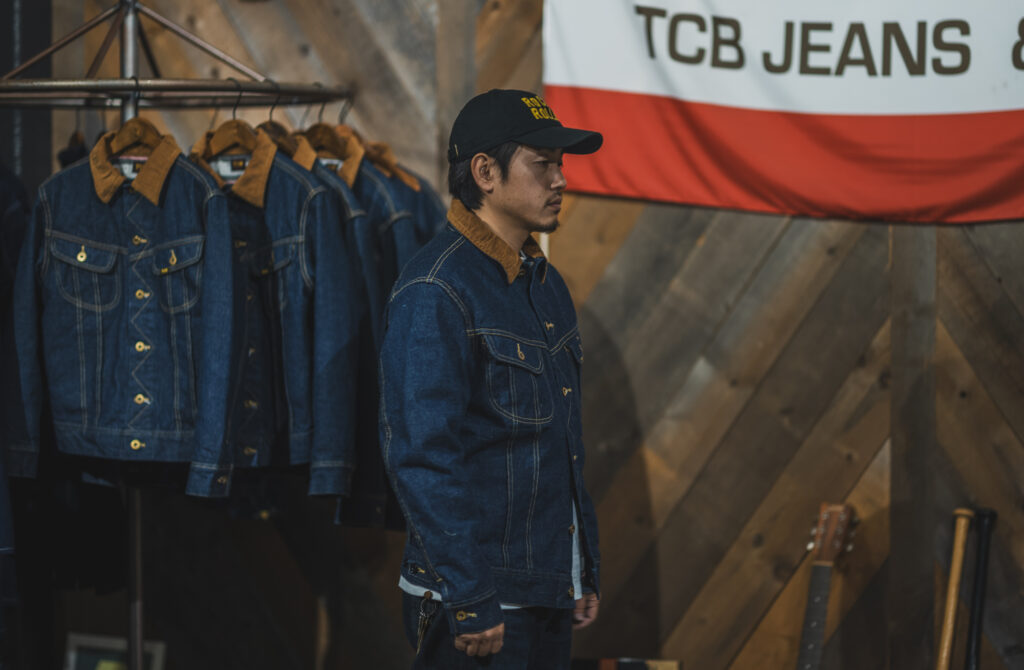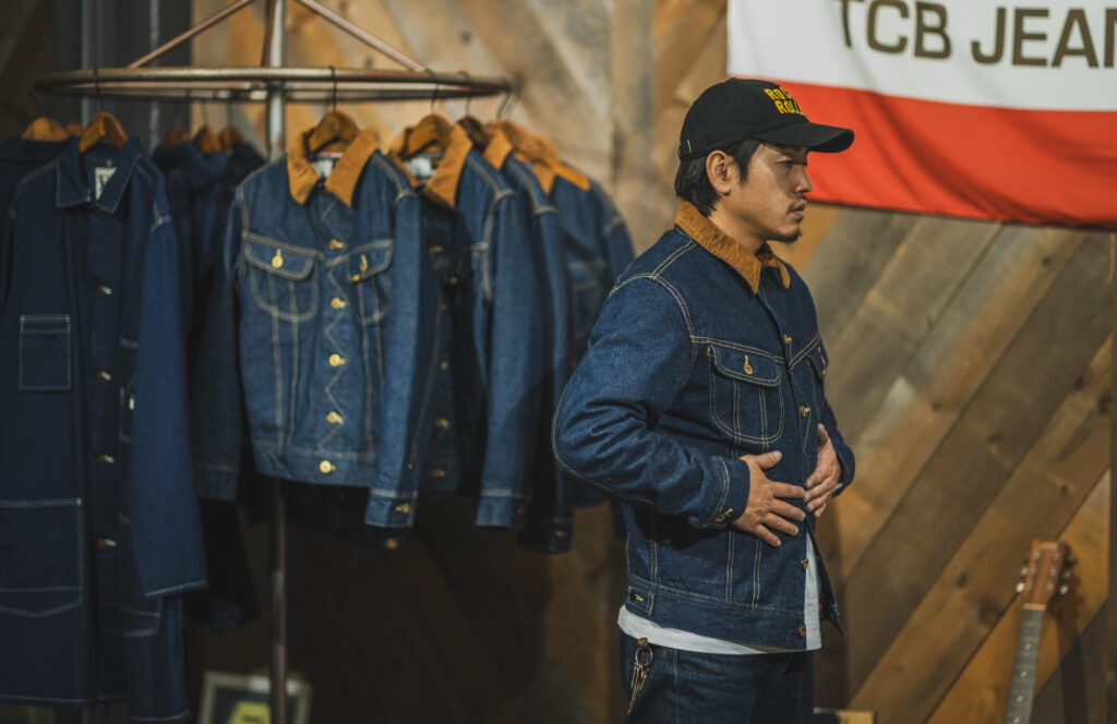 TCBでは採用してませんが、ジーンズに砂を吹き付けて穿き込んだ表情を作る仕事をする井元くん。