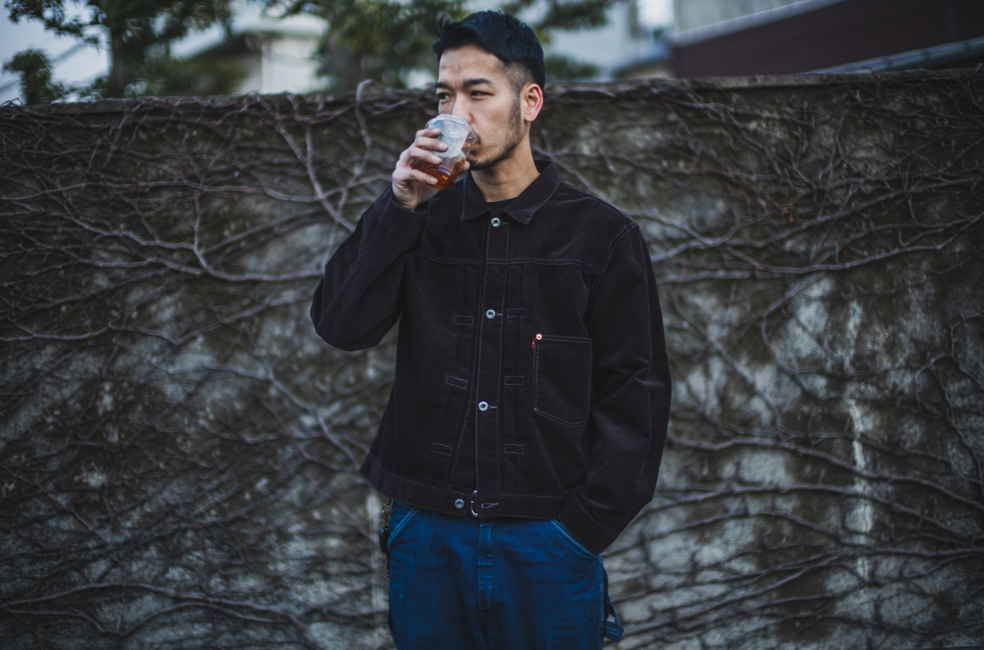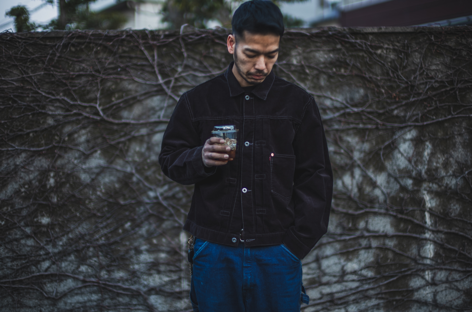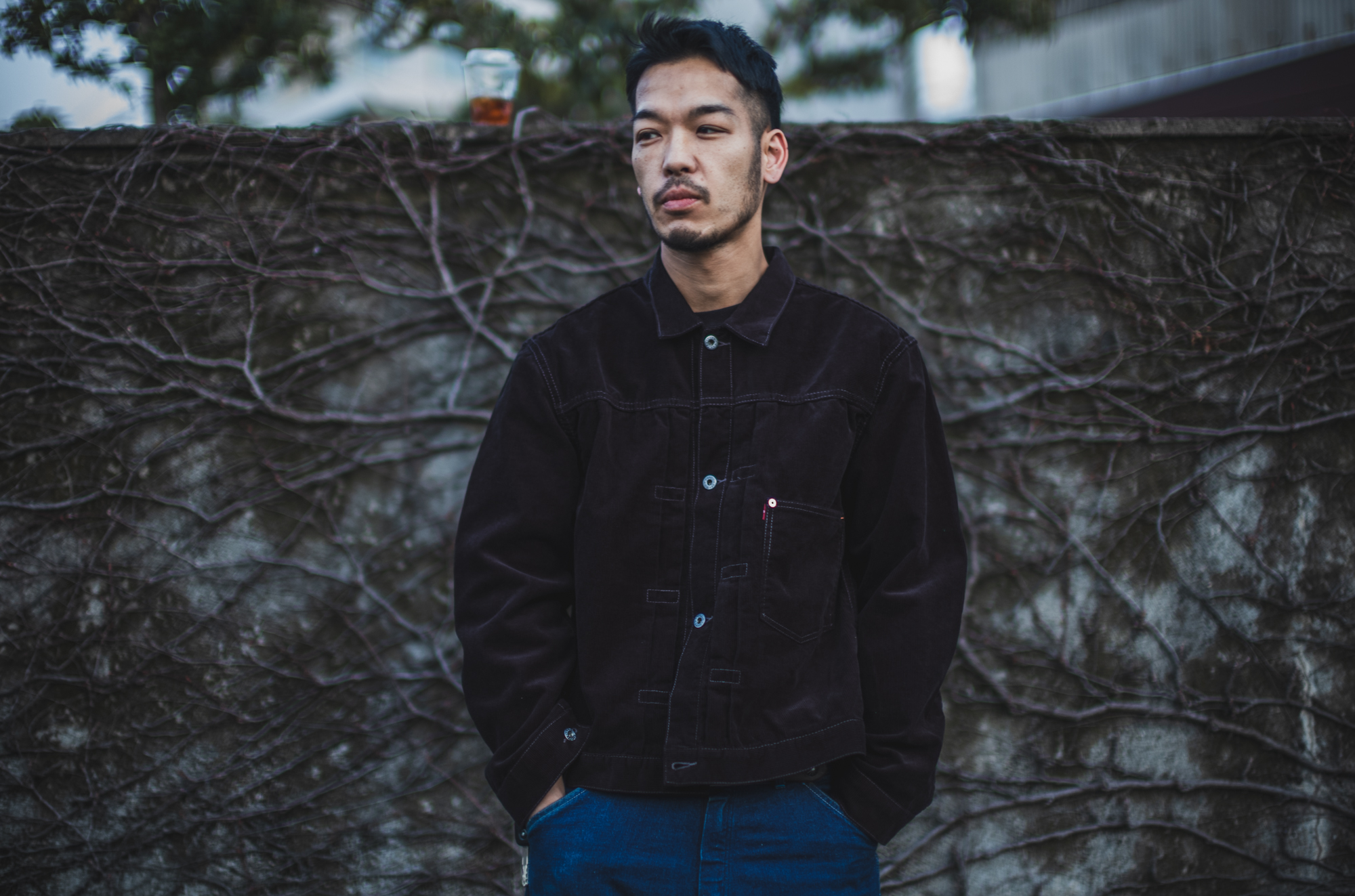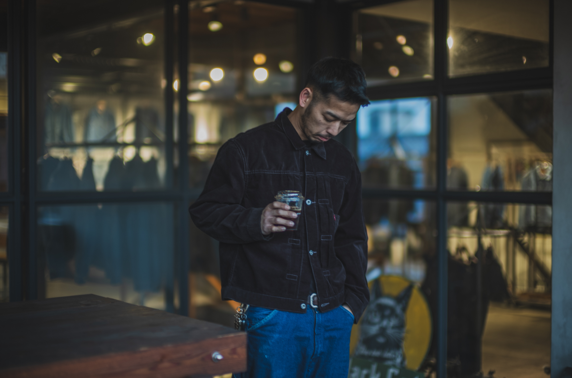Drinking black coffee wearing the black cord jacket.