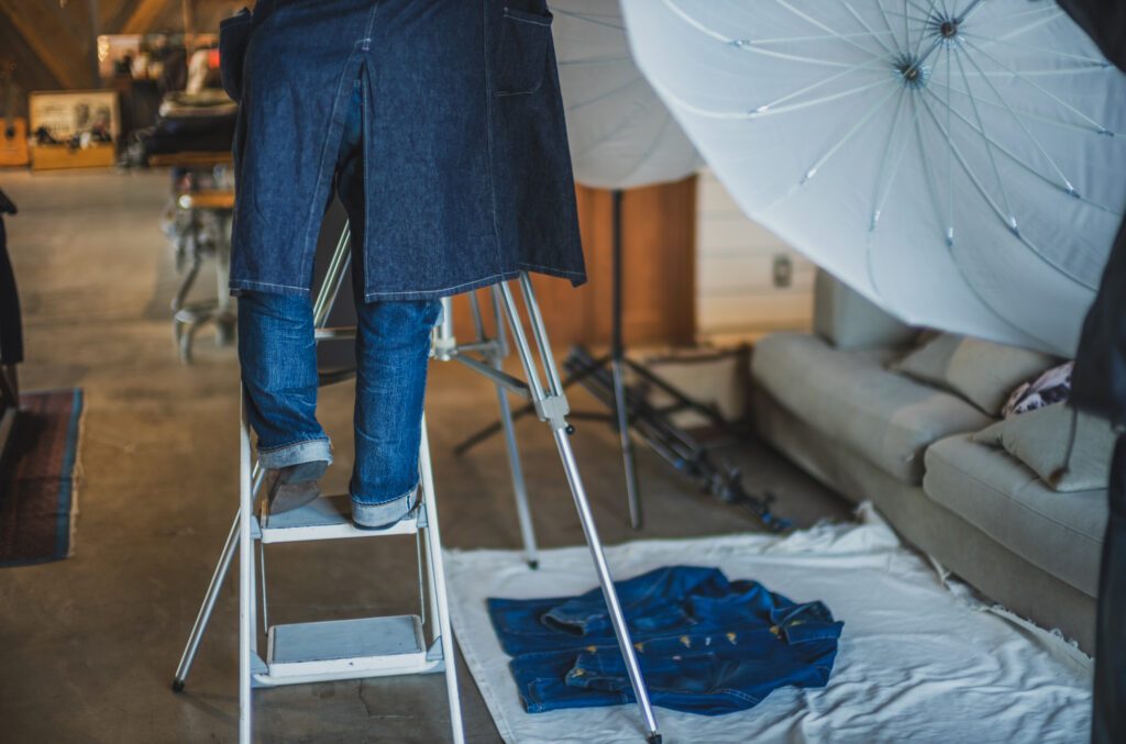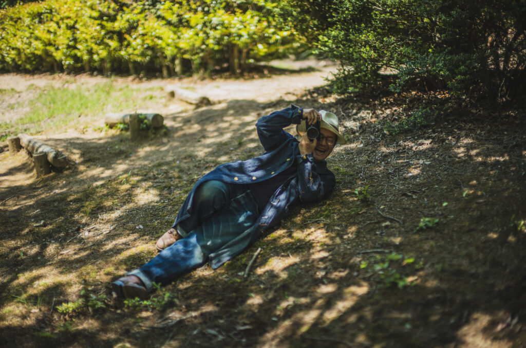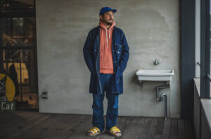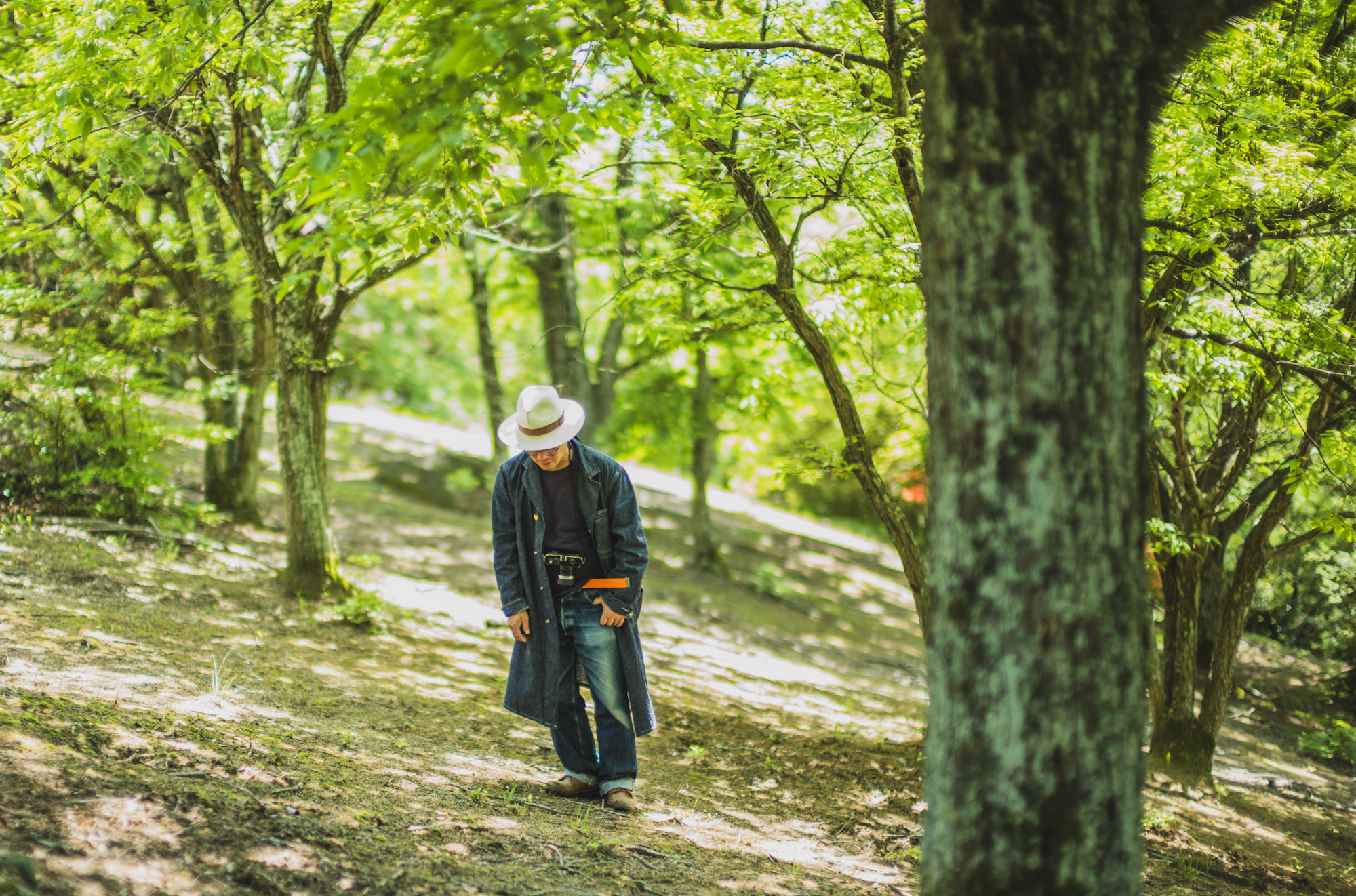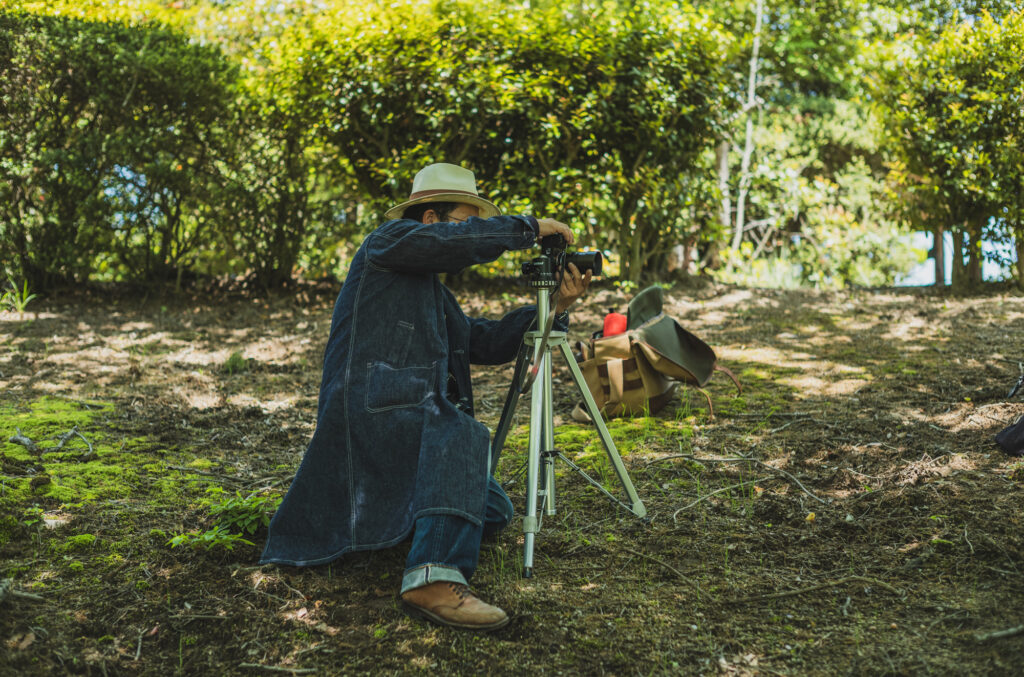 I’m basically a top-to-toe denim guy all the time so in order to give it some twist, we went into the forest where only the sound of woodpeckers drumming echos. It seems his go-to work wear now is this Cathartt Traveller Coat. He often crouches, lies down, walks around to find the best angle and I hope to see some beautiful fade on his coat!