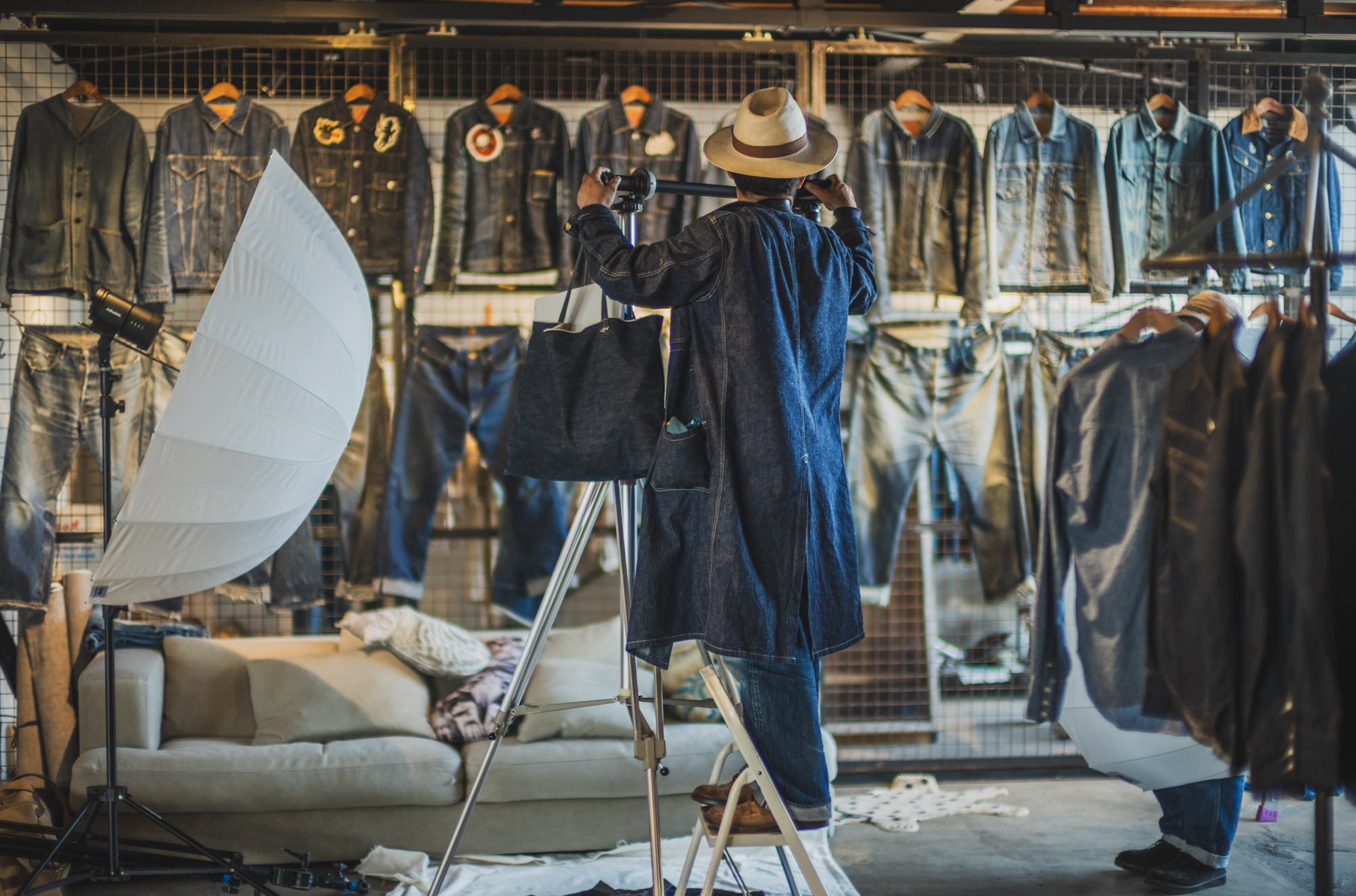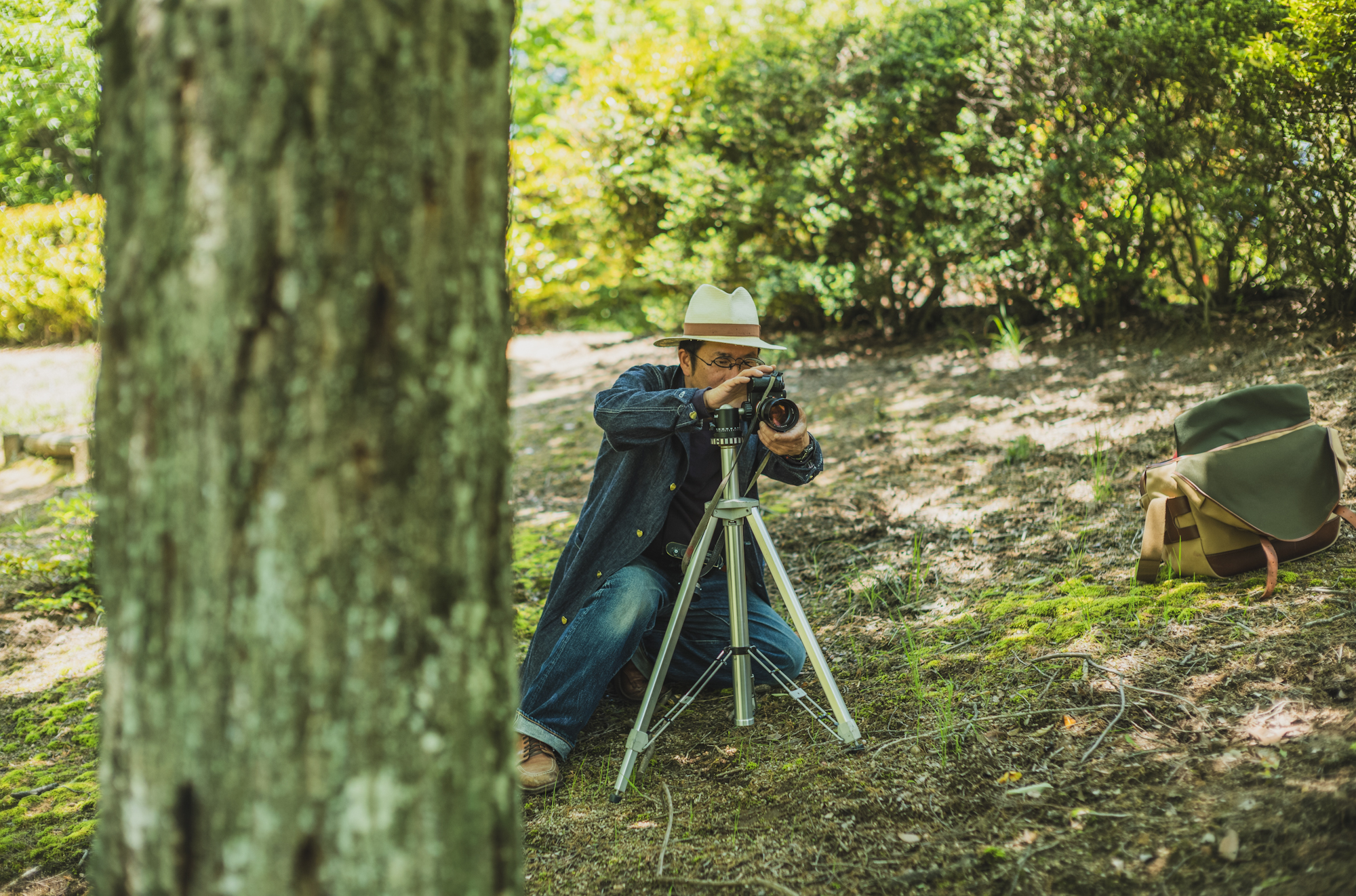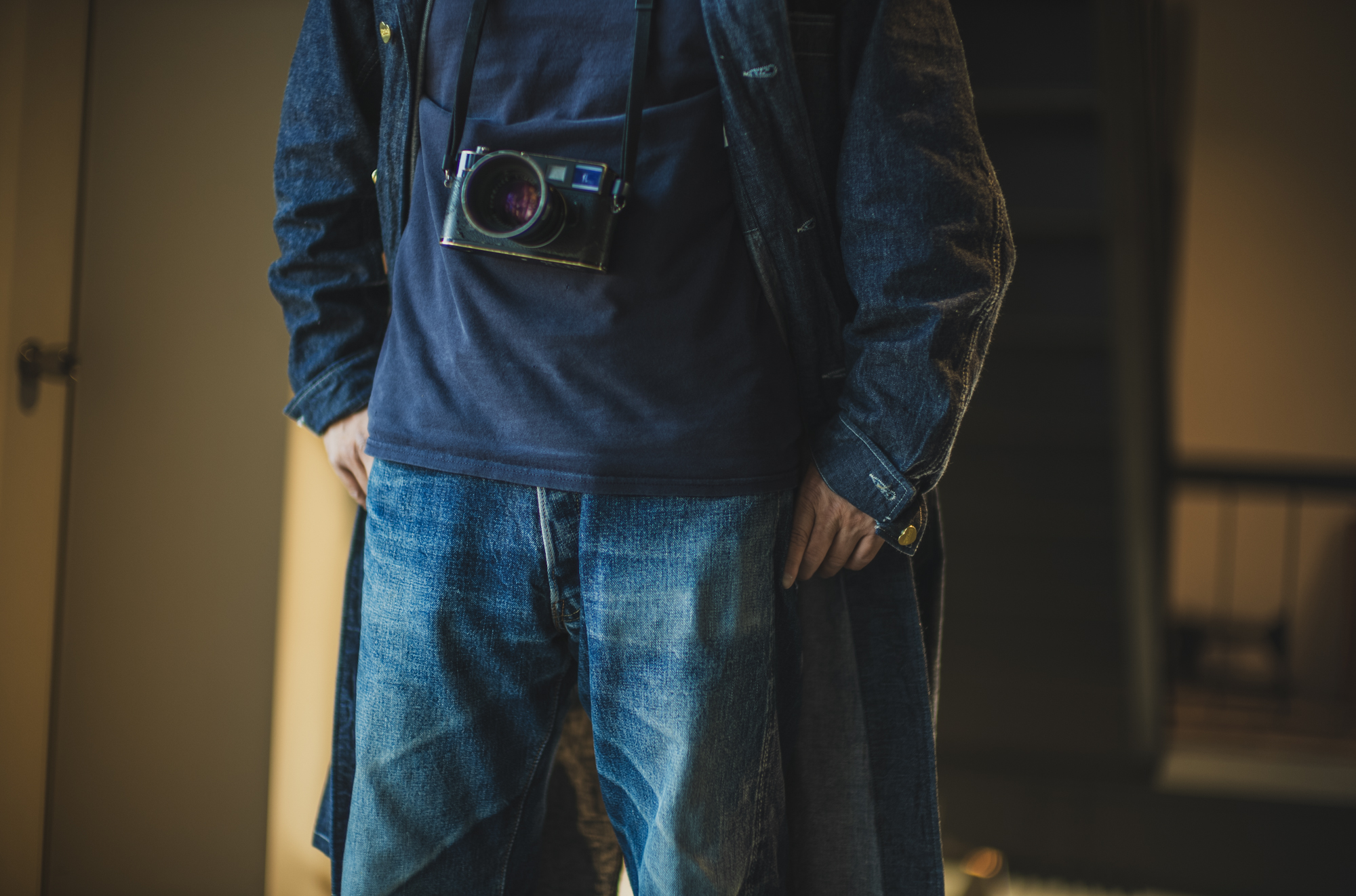 I’m basically a top-to-toe denim guy all the time so in order to give it some twist, we went into the forest where only the sound of woodpeckers drumming echos. It seems his go-to work wear now is this Cathartt Traveller Coat. He often crouches, lies down, walks around to find the best angle and I hope to see some beautiful fade on his coat!