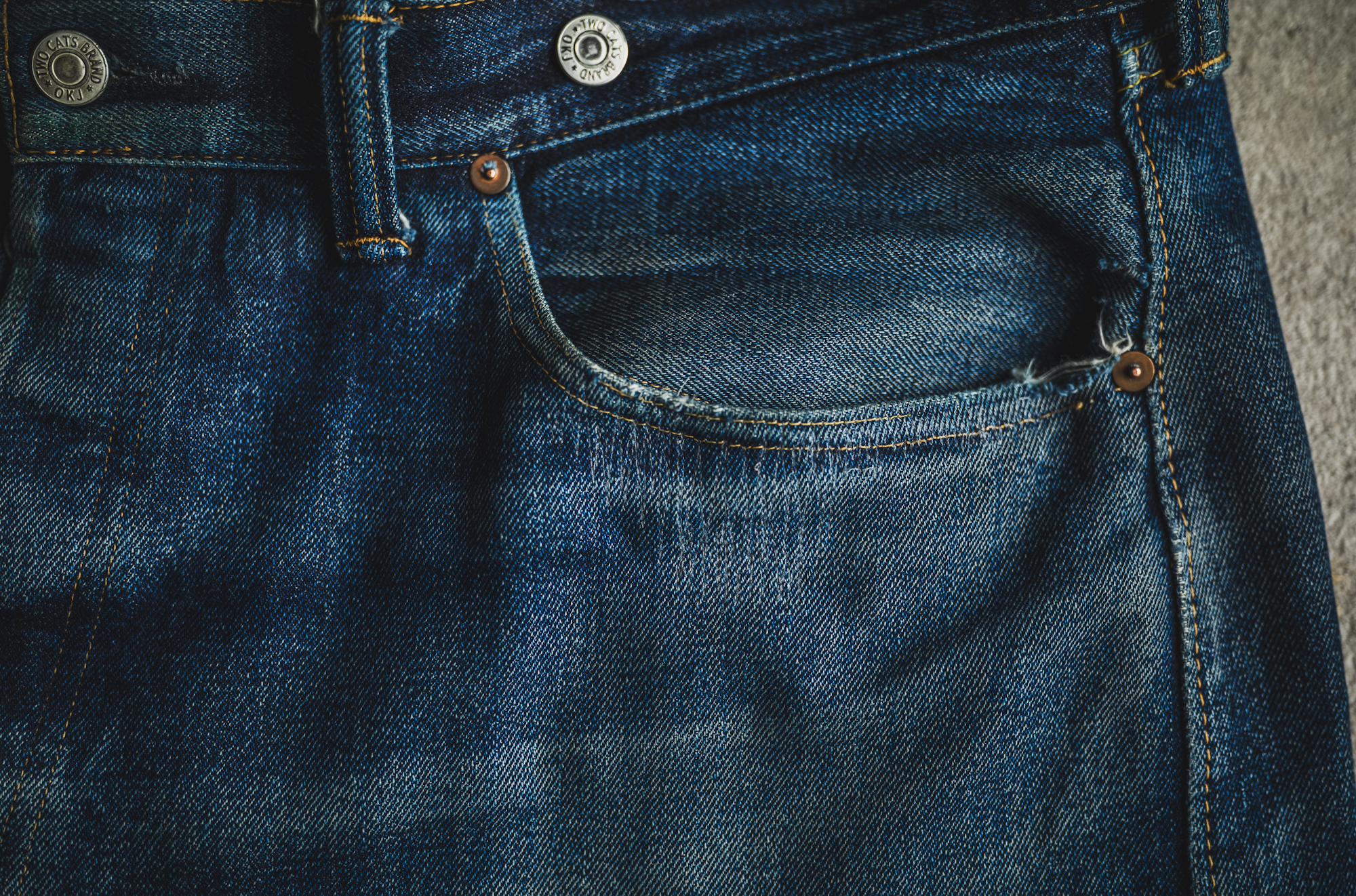 1年半穿いてる30’sJeansの前ポケット口がボロボロでいつ無くし物をしてもおかしく無い状態だったので急遽その場で脱いでパンツ一丁の状態でセルフでリペア。