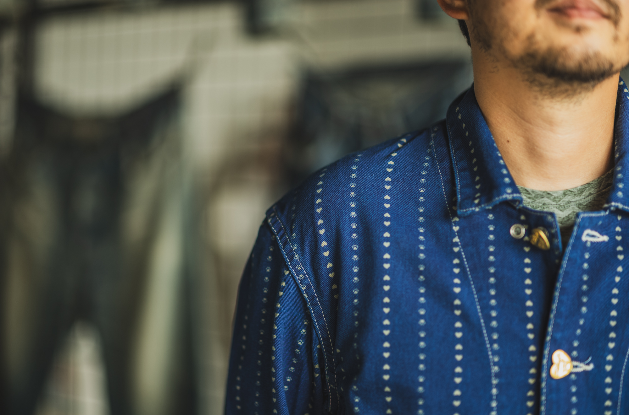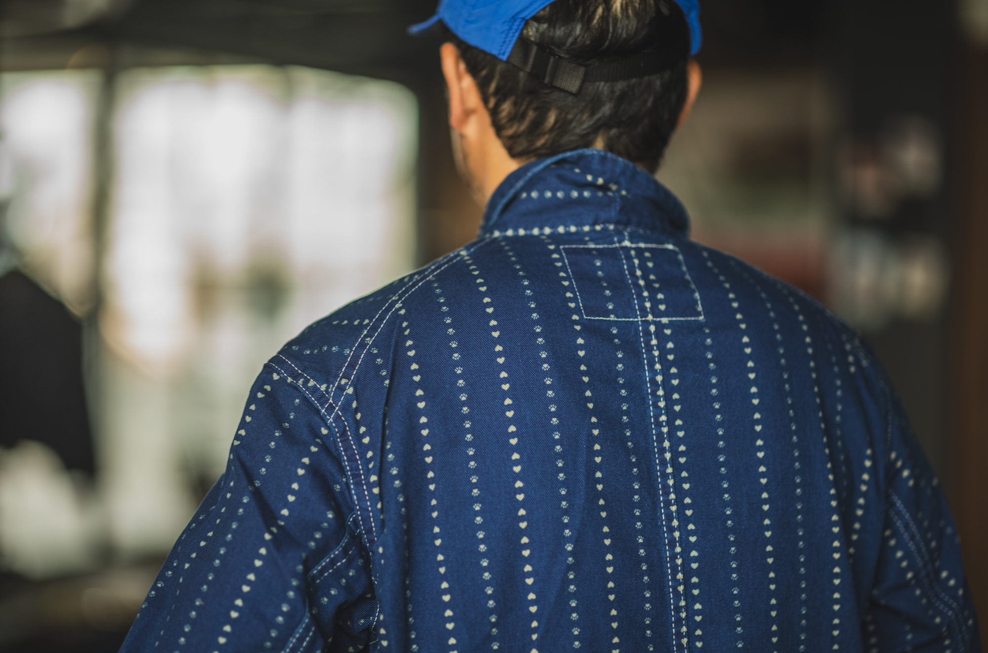 ハンガーに掛かってるのを見るとハートと肉球のストライプでハートのボタンは着れないなって思う方も多いかもですが、実際に着用すると、しっかりワークな不思議なジャケットです。