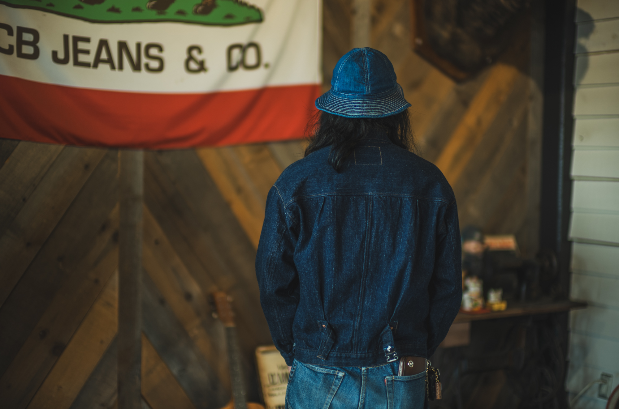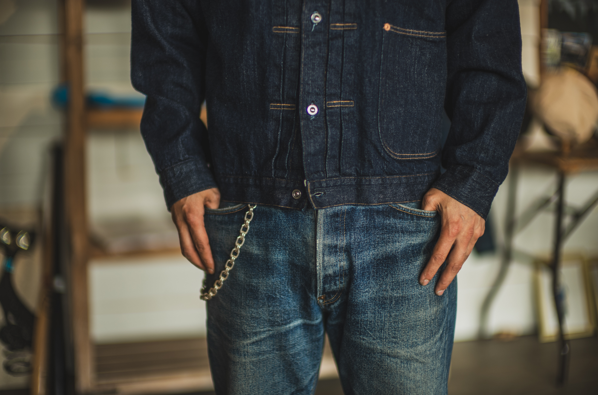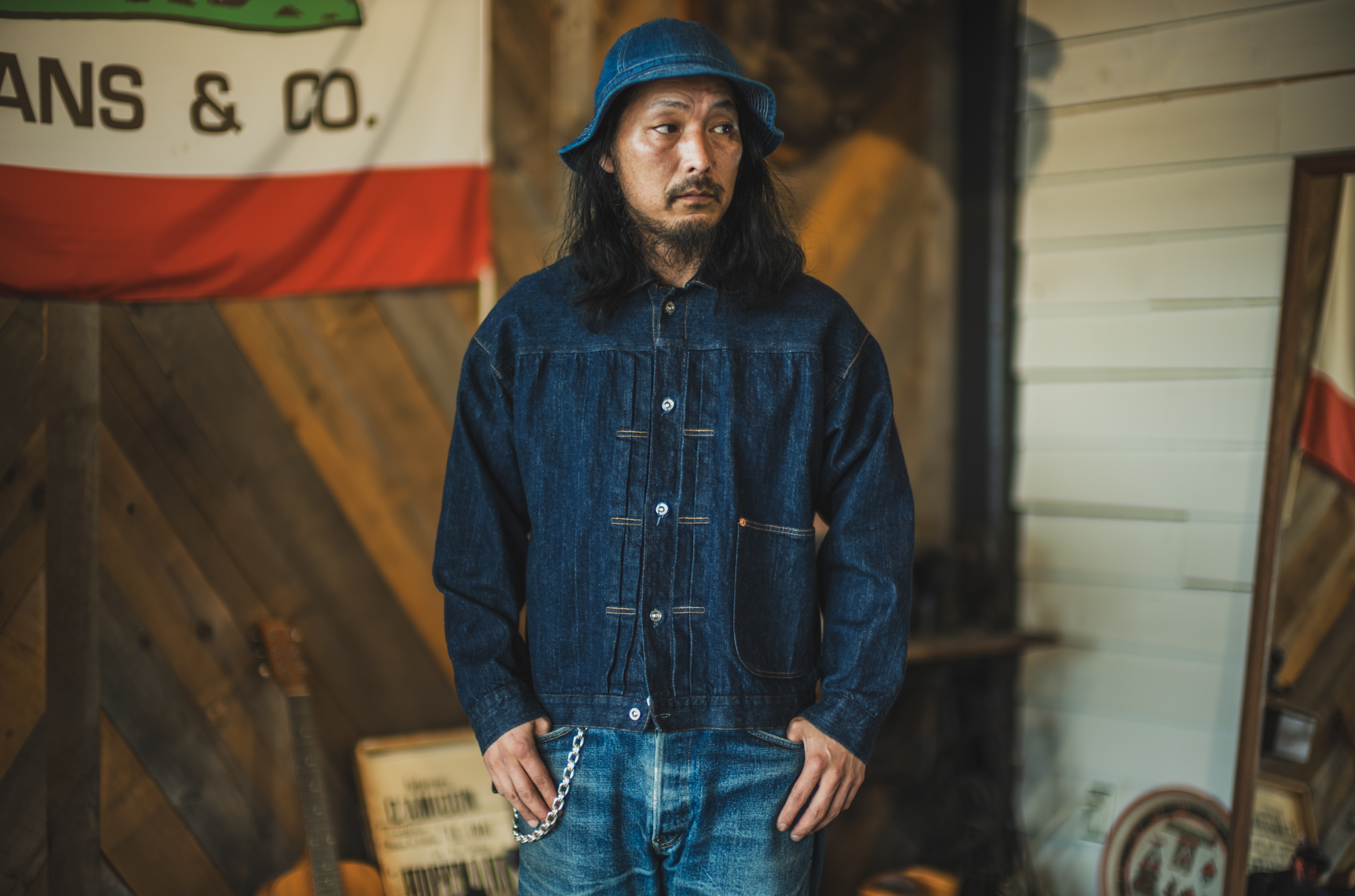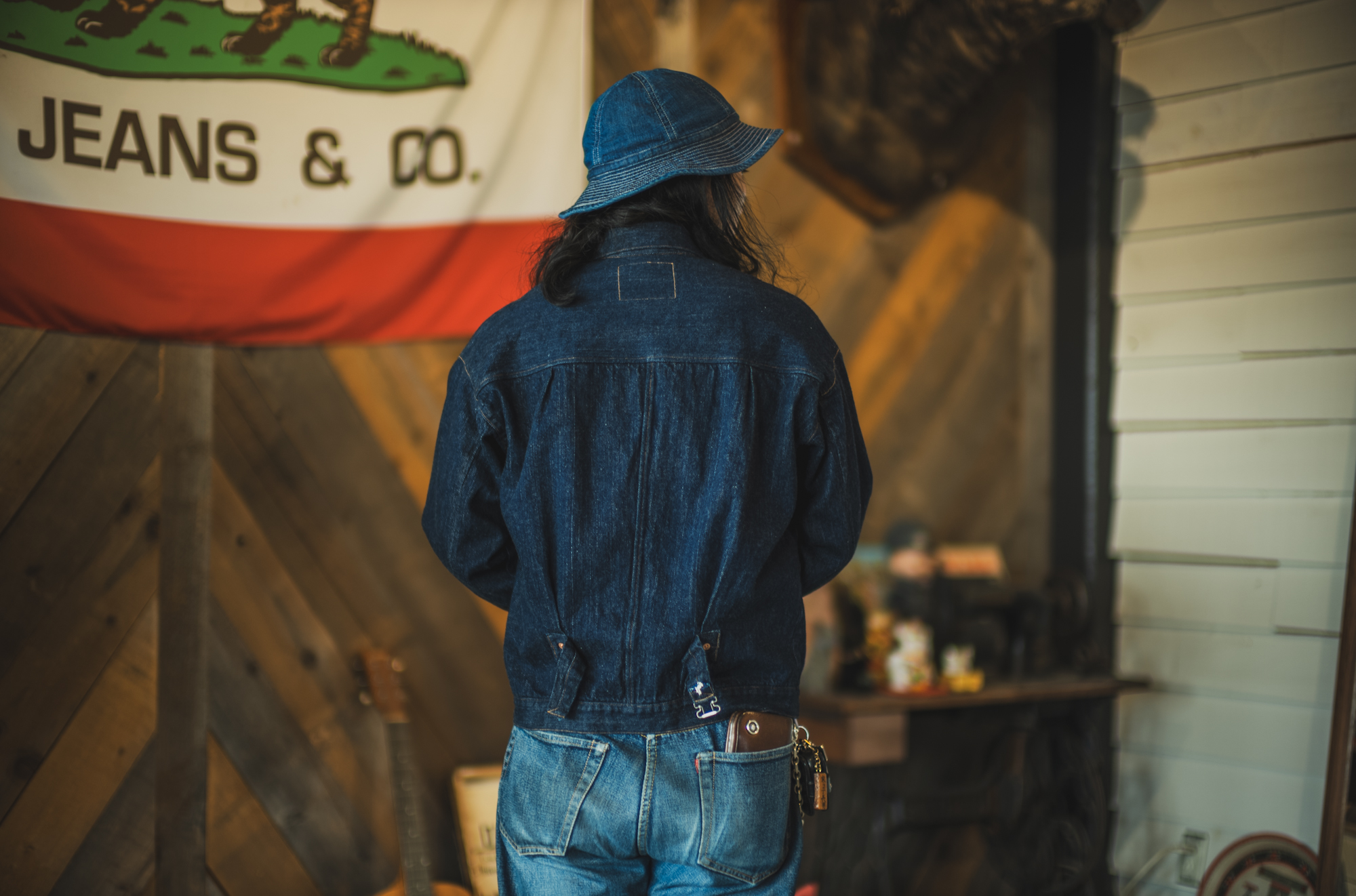 Our regular customer, Yoko-san, enjoys his denim tux, No.2 Blouse & 30s Jeans C.