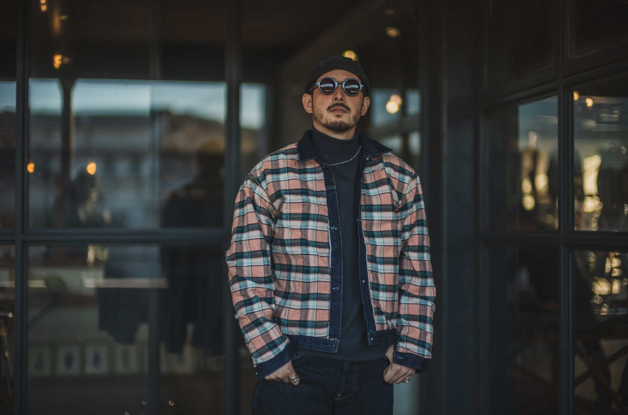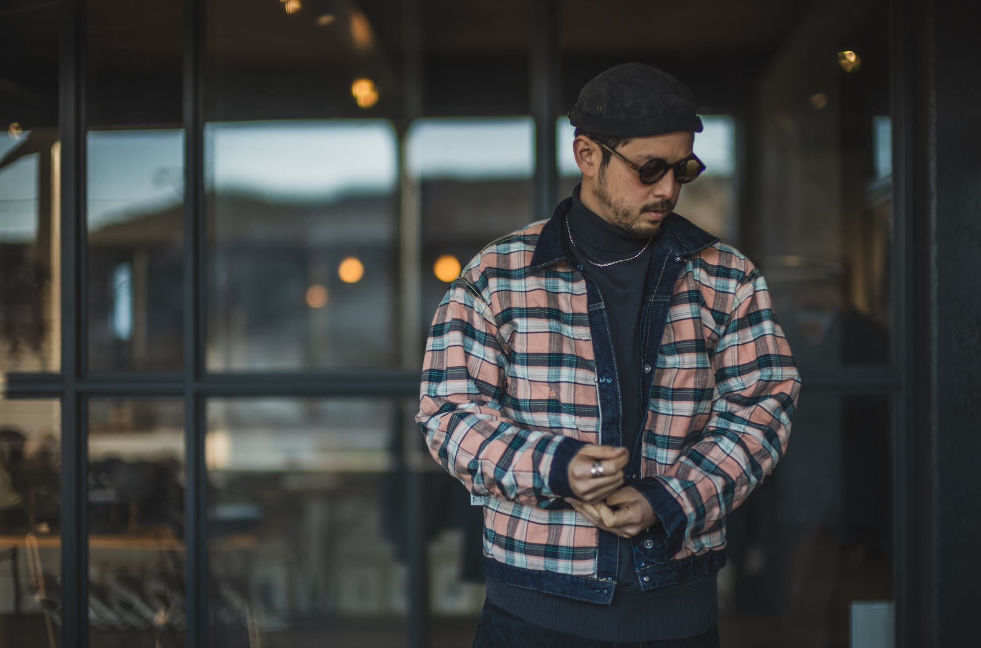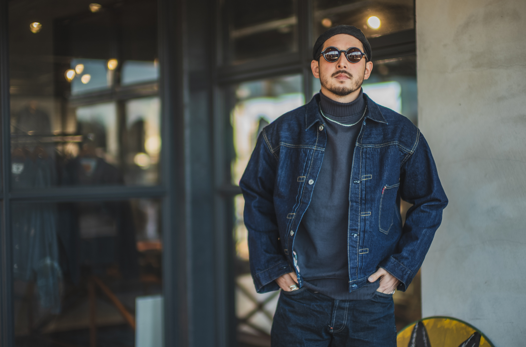 RYO, who has lived in Europe, has a style that has some reminiscent of British feel with his checked denim jacket, and a European fisherman’s feel with his Workers’ turtleneck and a French brimless hat. I was able to realize again that one of the charms of denim is that it can be made to look elegant or casual depending on what you wear with and size you pair it with. For me, denim is like rice. I never get tired of eating it every day, and it’s versatile enough to be used in any dish. Maybe for RYO, it’s like bread lol. 180cm 78kg, wearing size 44. 42 fits just right, but he prefers a bit relaxed fitting of 44.