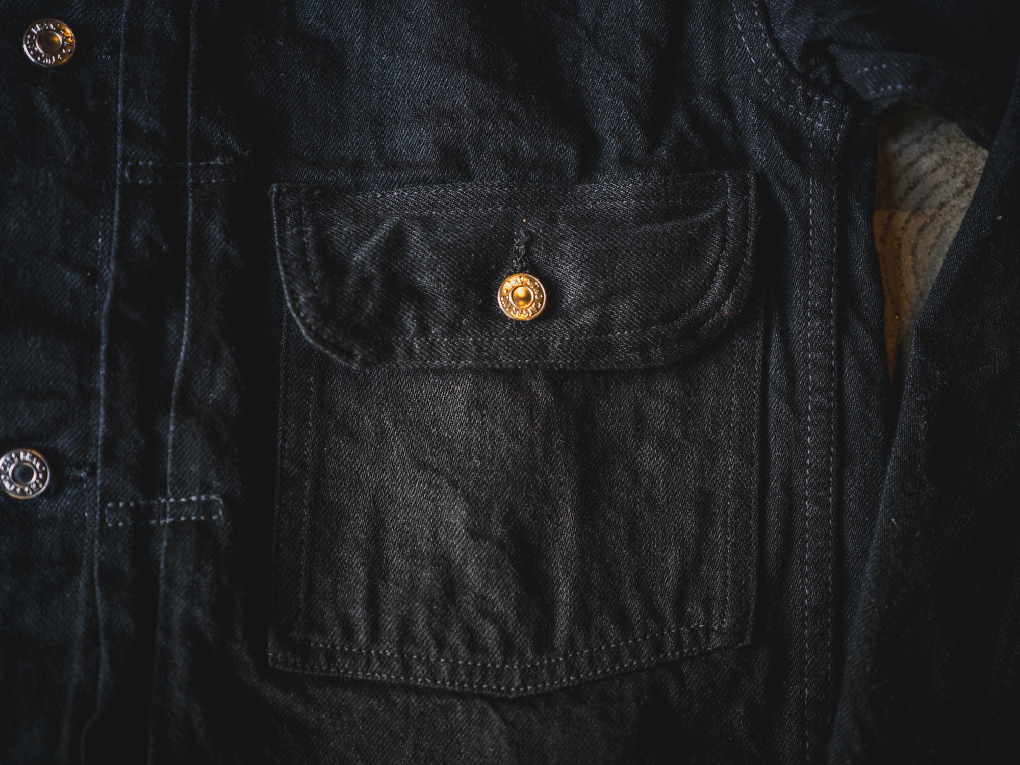 20’s Jackets have its iconic details such as small buttons, a square collar that spreads out horizontally, and a rounded flap pocket done with wonky stitches. I’m sure it’s some details that are appealing even to both those who already have regular type 1 and those who own the WW2 JK. The fabric is 12.5oz just like the Indigo 20’s, and it’s rope dyed so you can enjoy the monotone fading of the black & grey.