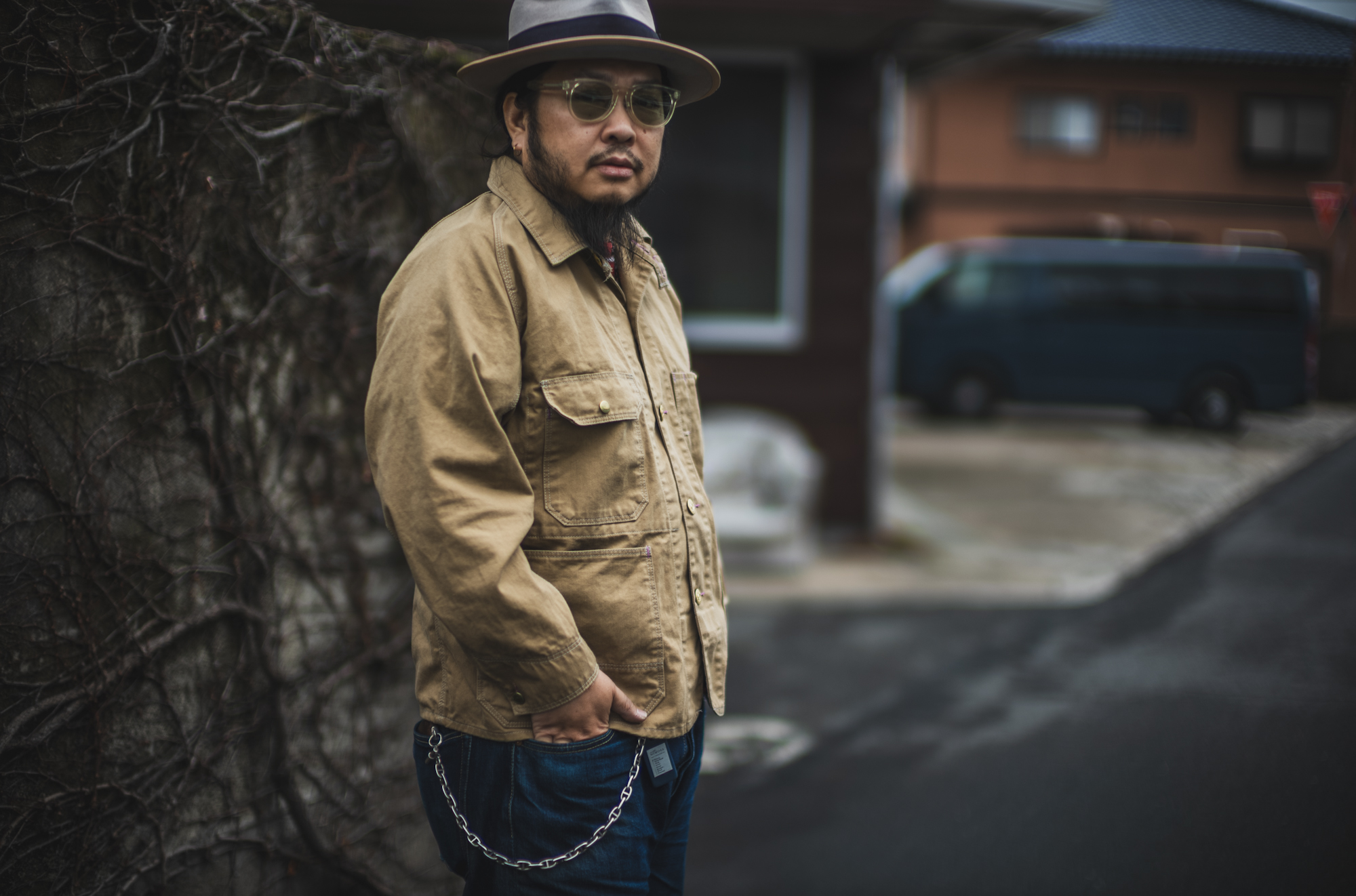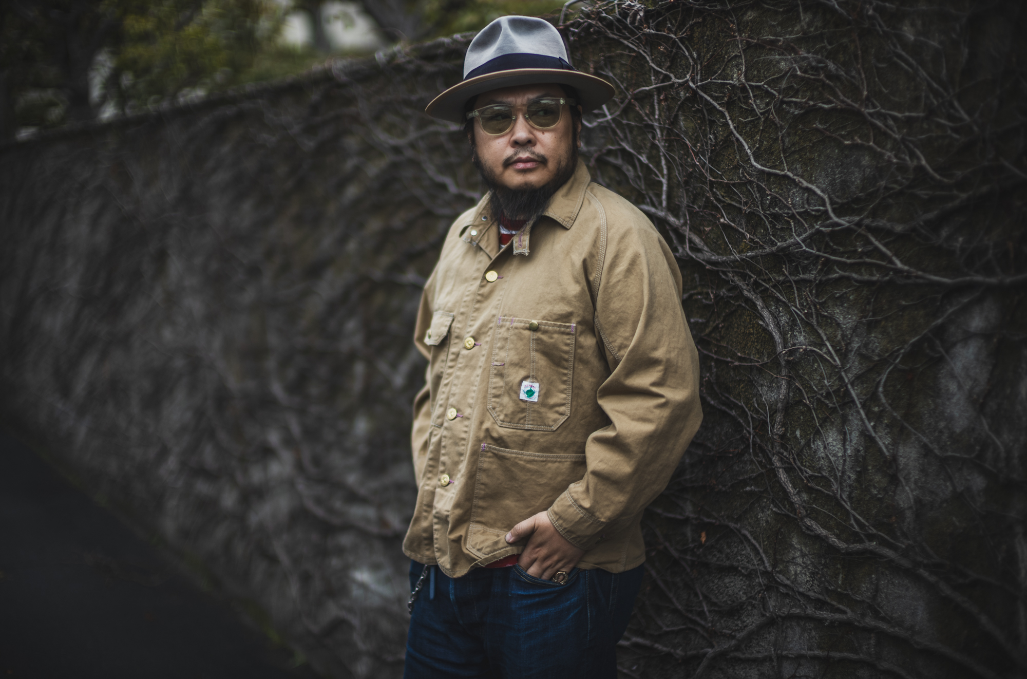 And this time, we would like to use an interesting fabric. Today, we will be announcing the khaki drill ver. This fabric is a reproduction of the fabric used in a Carhartt shop coats from the 1940s and 1950s. 9oz warp threads 12 and weft threads 10. The fabric has an uneven texture because it uses rough uneven yarn. Unlike fabrics used for elegant trousers, the weave is rough, so it has a work-like feel.