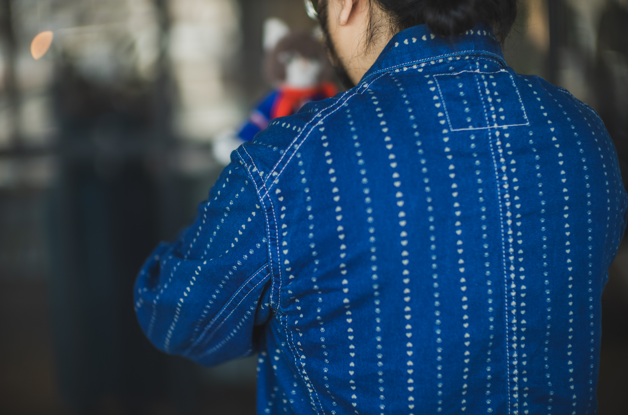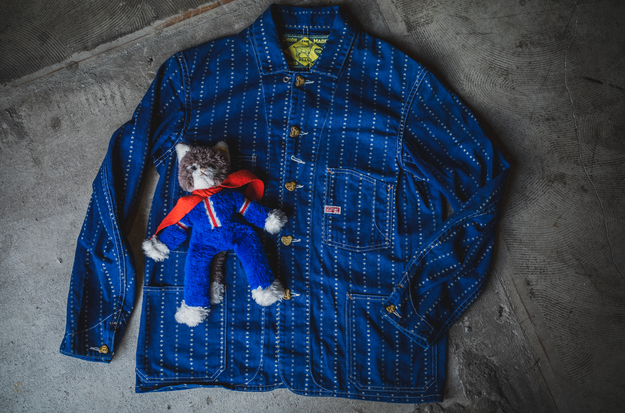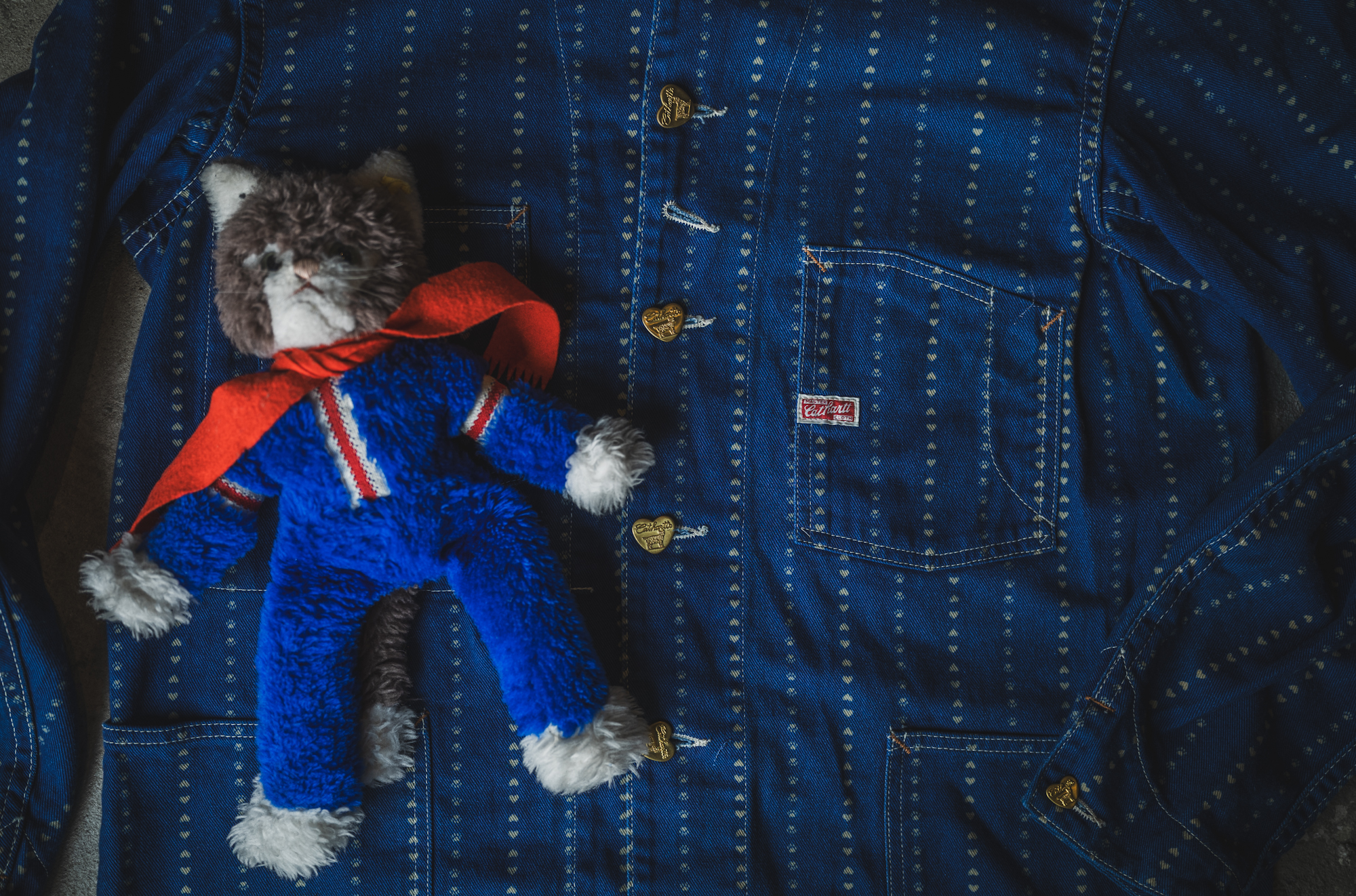 The fabric is a unique combination: a heart-patterned stripe inspired by vintage Carhartt archives, blended with a touch of cat paw prints.
