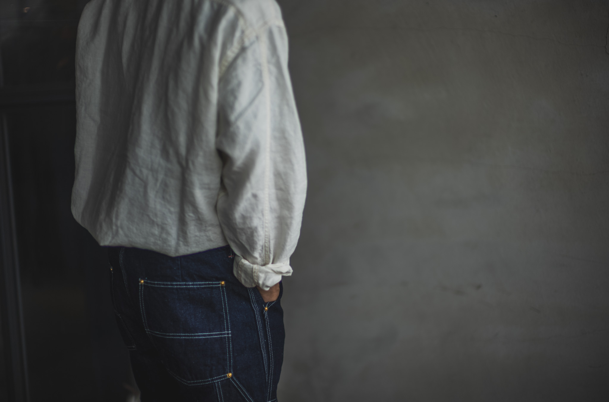 The left pocket has a wide, rounded opening for an easy access to your pocket watch or keys for today. Cat’s eye buttons used for the placket, oftens seen from the vintage work shirts. In the early 1900, the line between tailoring and workwears was still quite vague so that it can be sometimes found that a shirt has both the influences. This goes for our shirt too. At the first glance, it looks like a pull over shirt but is actually a normal button shirt. The hemline of this shirt has an uncommon rounded shape suitable for tuck-in but it gives a flair to the shirt even when untucked.