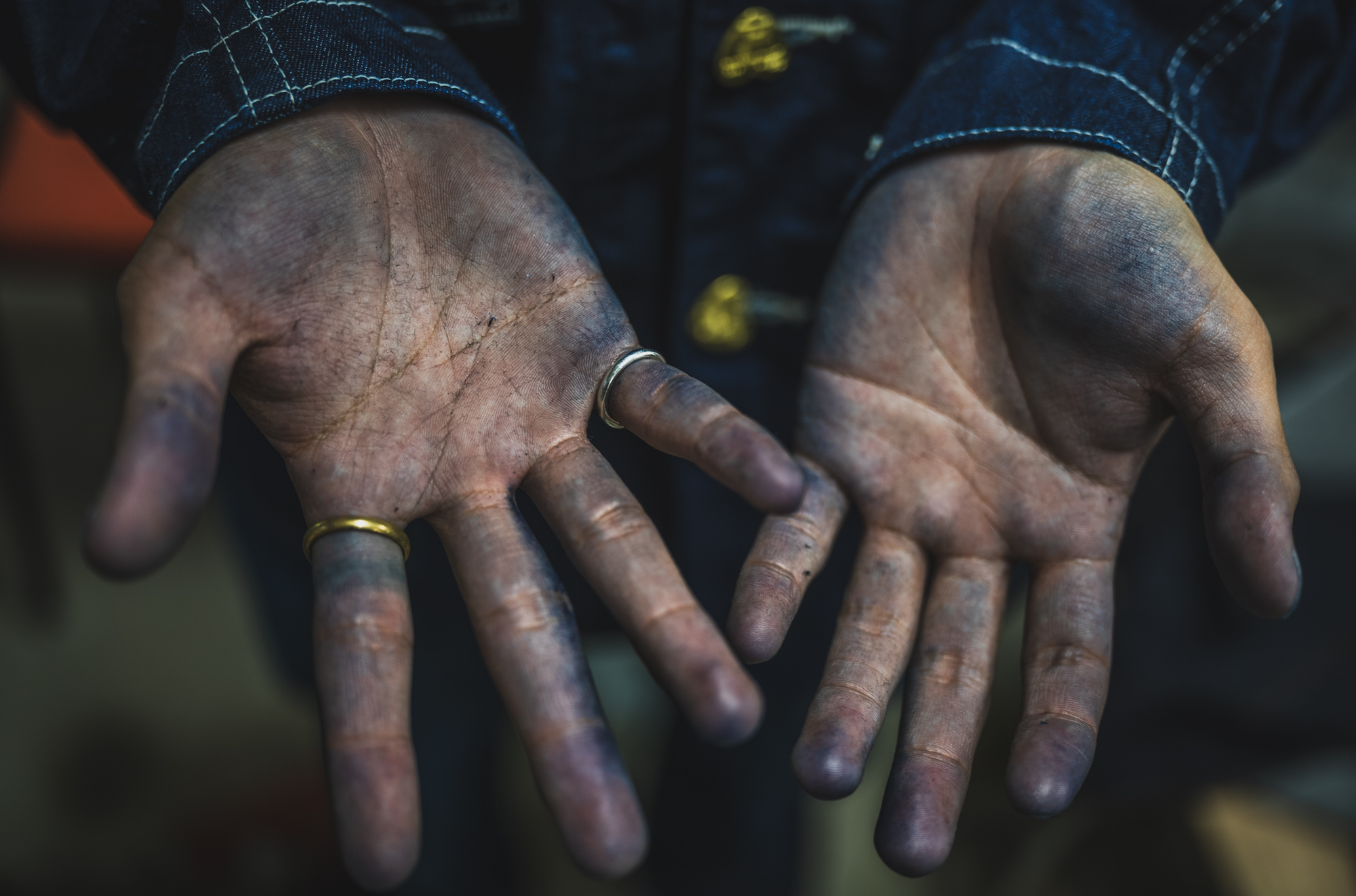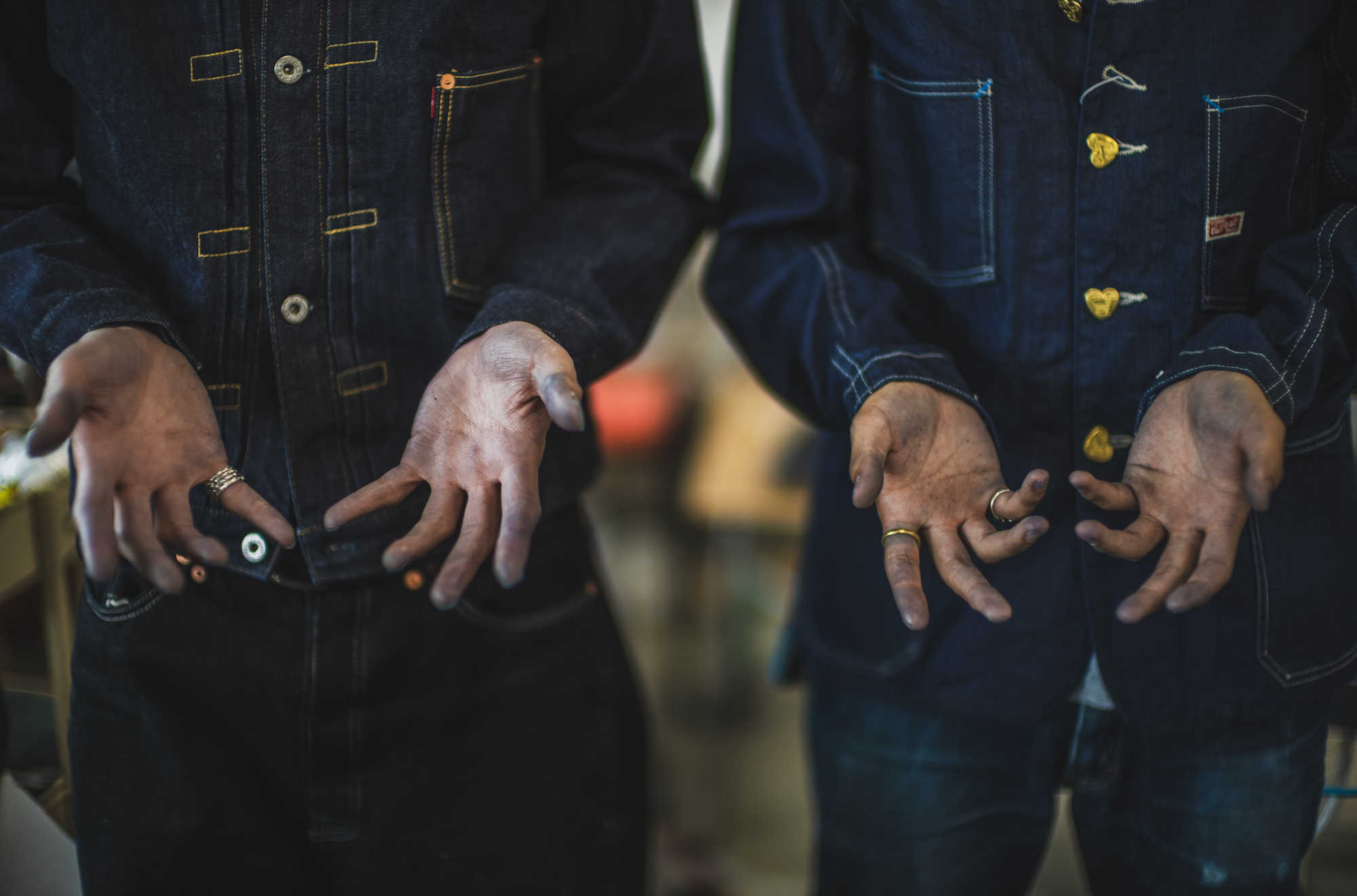 TCBの生地のラインナップの中でも1番濃色なS40’sを縫ってる日の工場の就業間際には、みんなの「青く染まった手」が並びます。