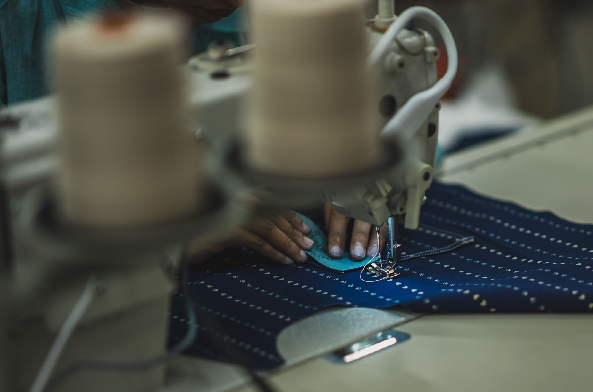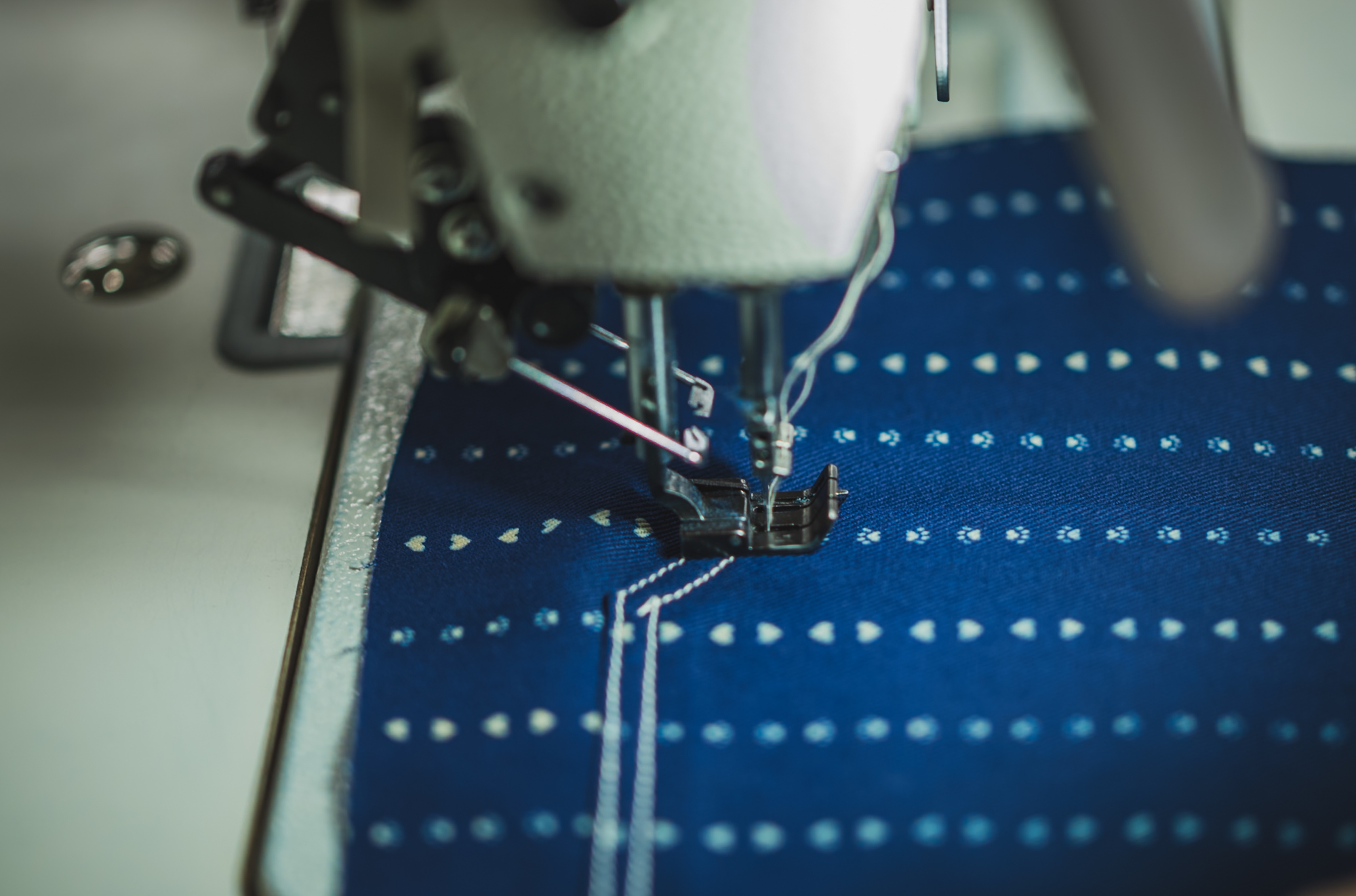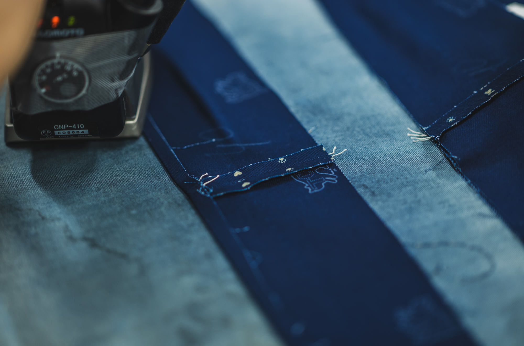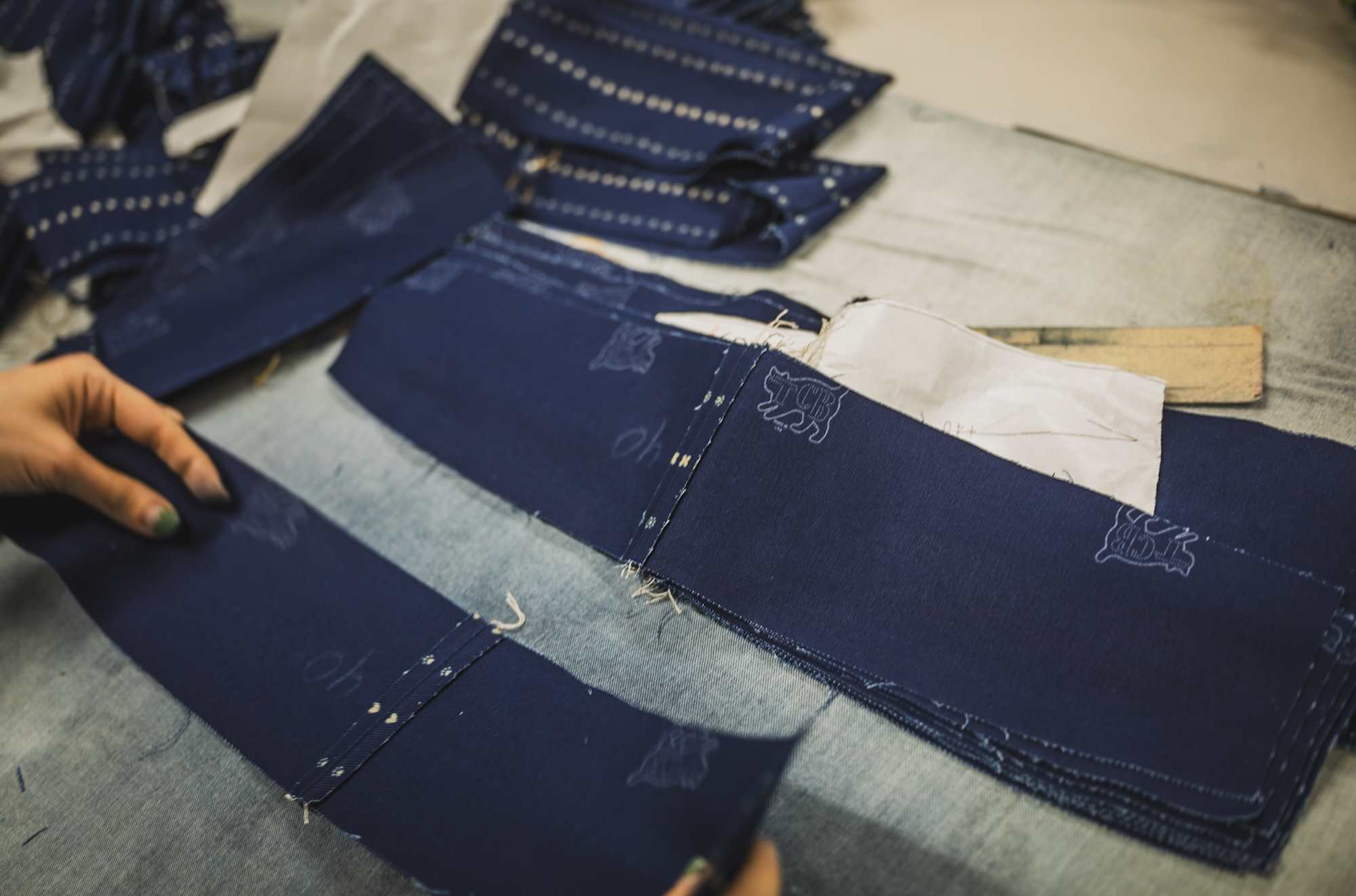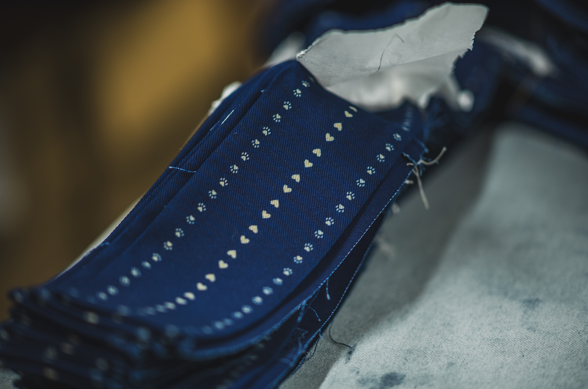We’re so used to seeing a sea of indigo denim on the sewing floor that the heart and paw print stripes bring a refreshing change to the usual scenery—