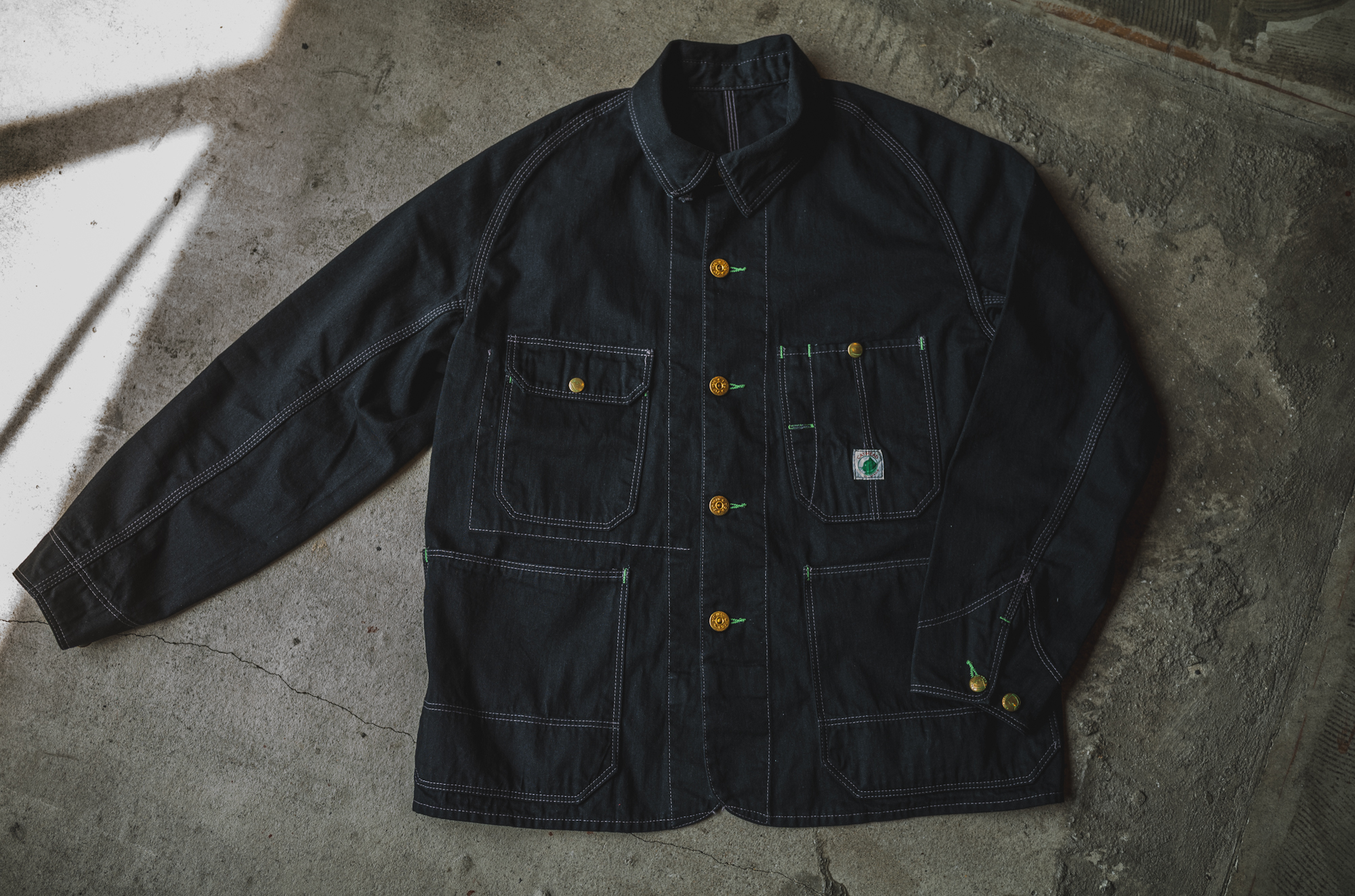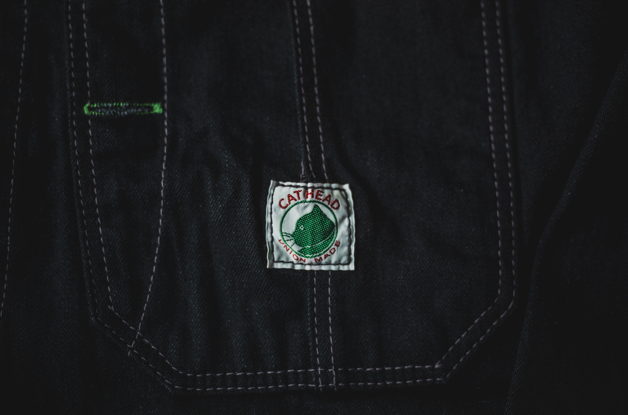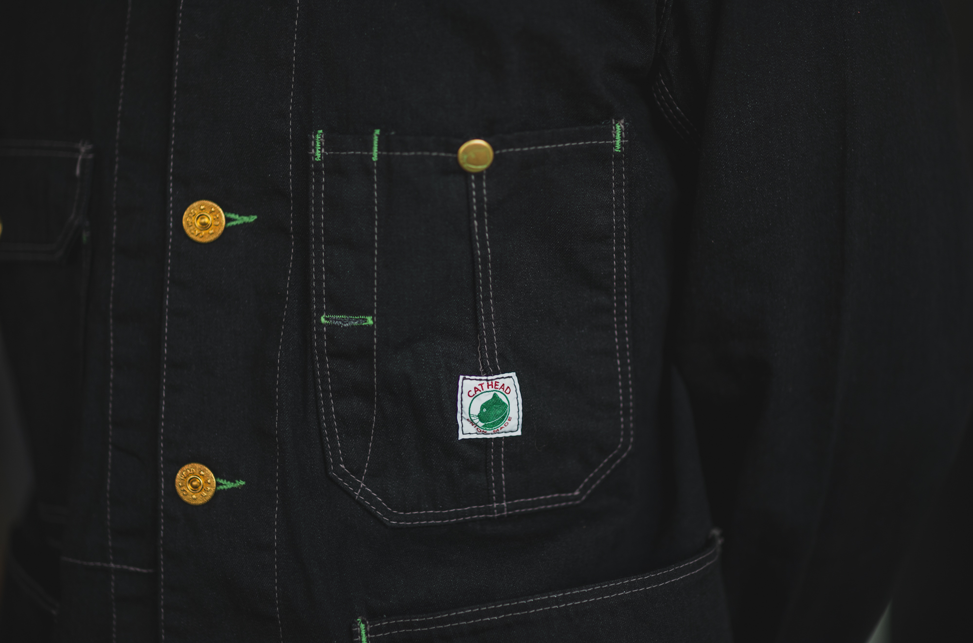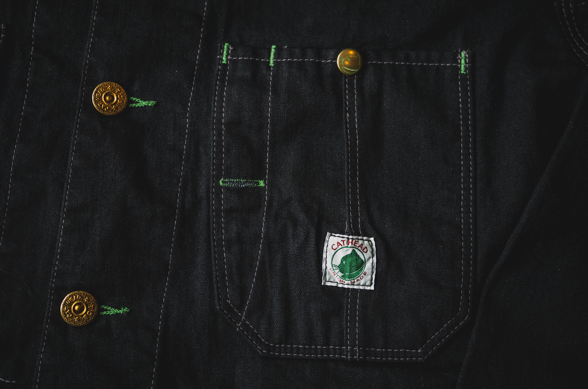 The green buttonholes and bar tacks, a distinctive feature of the Cat Head Jacket’s stitching work stand out beautifully against this jet-black fabric.