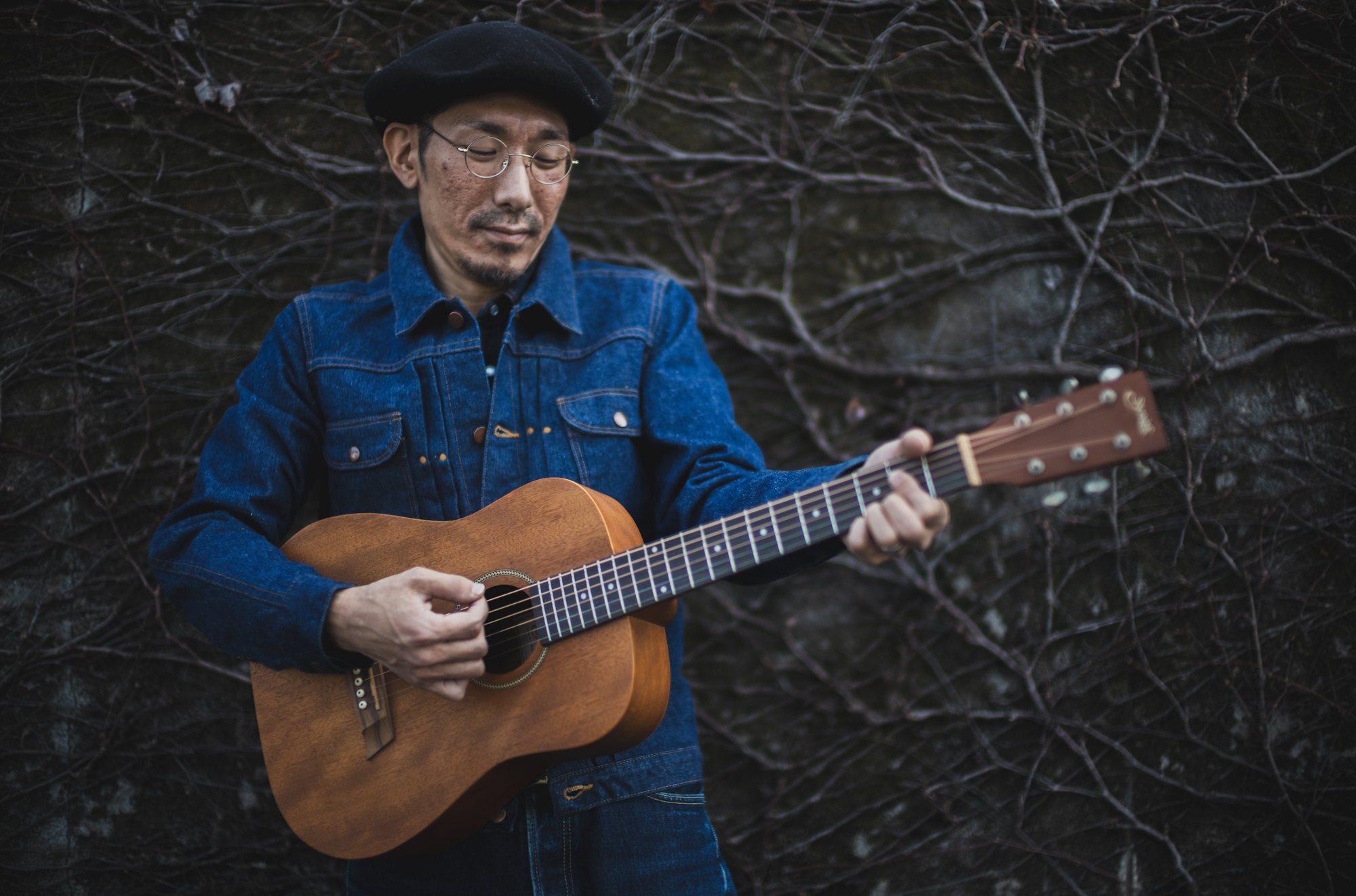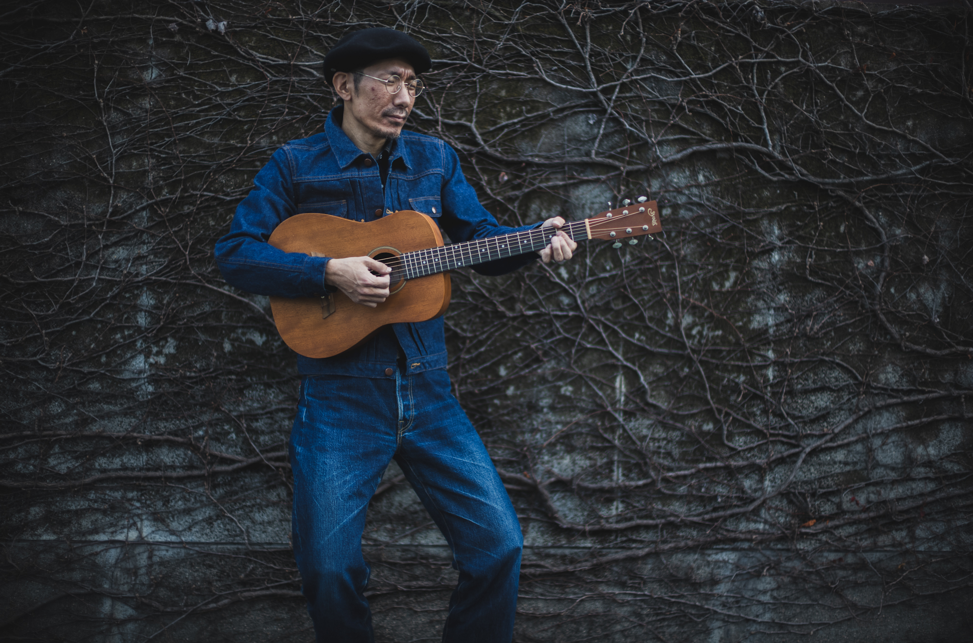 in a hat and round glasses.