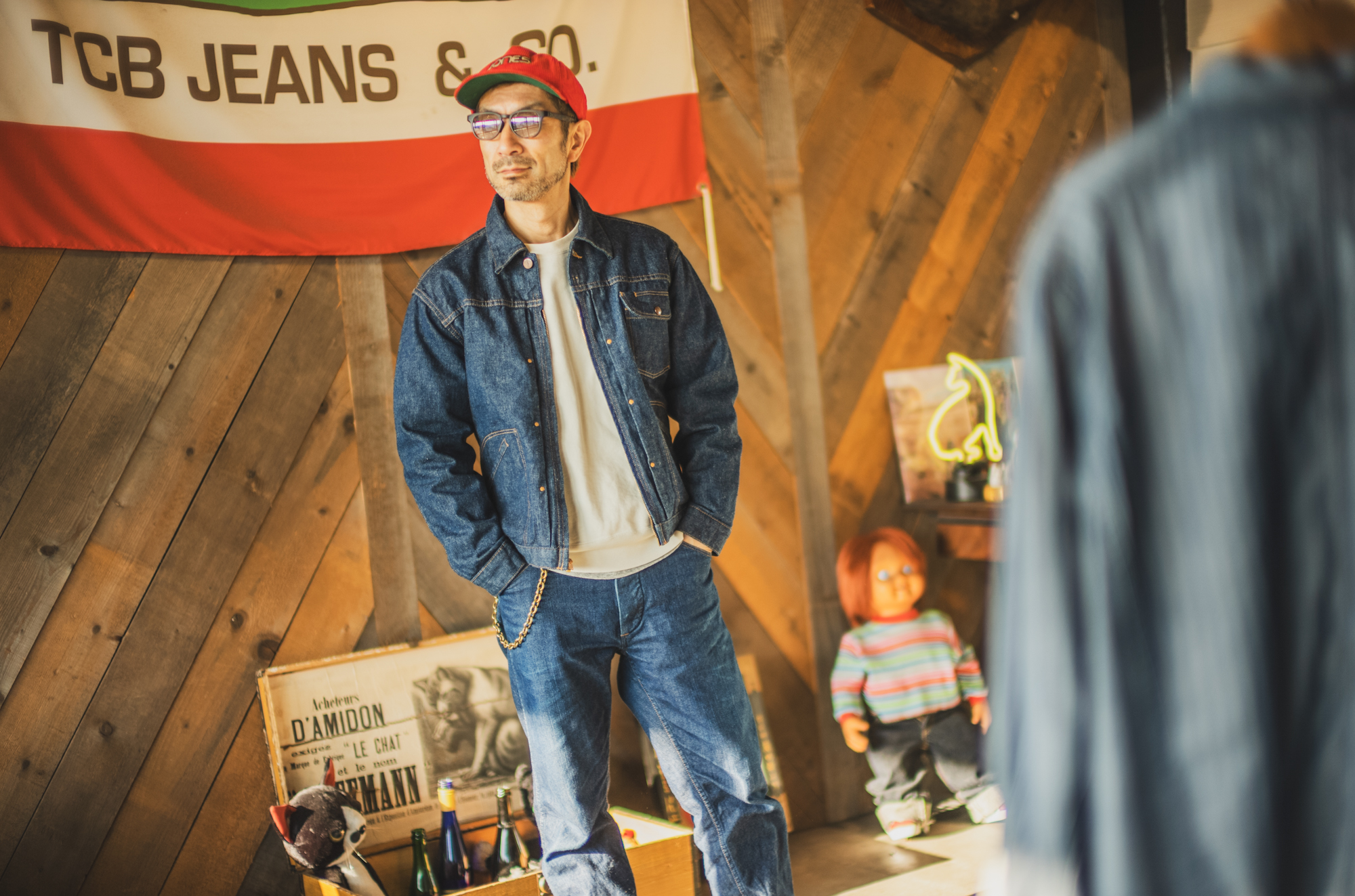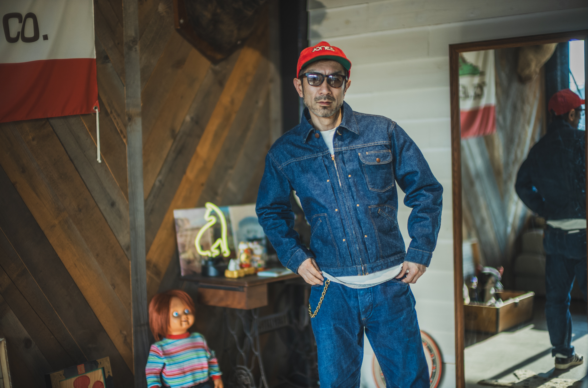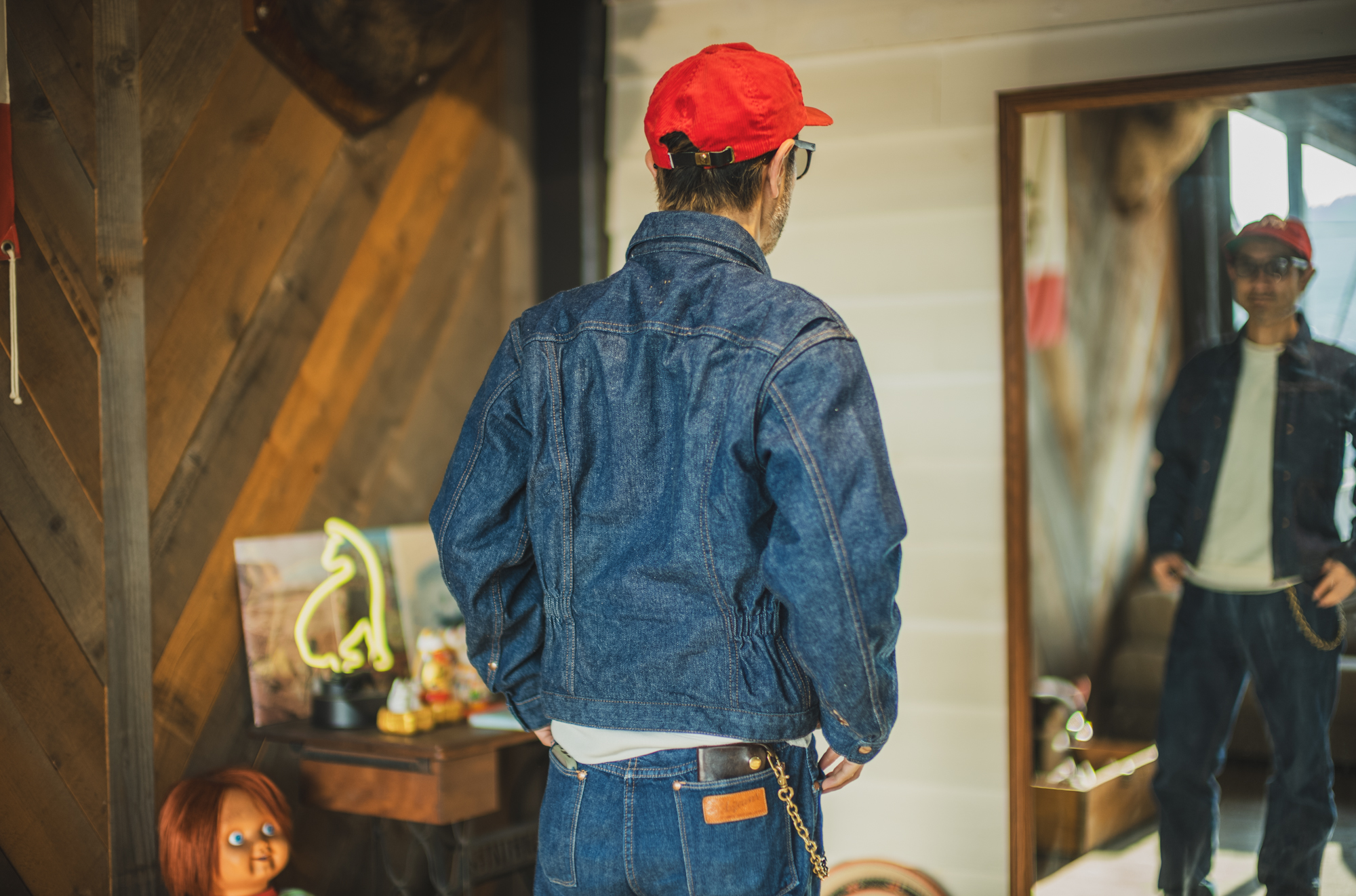 WCH Rancher’z JacketにWorking Cat Hero Jeansのセットアップに赤いCAP。
